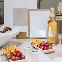We love a multi-functioning focal point! Our shelf display needed a visual, we needed a game and Mama needed some eco-friendly re-usable bottles for baby girl. We found The Natural Baby Company and were immediately gawking at their chic Baby Quoddle Bottle. We opted to help a mama out by, "doing the honors", of breaking in the bottle for baby Honor, and gifting them to Mama Maddie after. We played Drink Up Baby and printed the rules to the game and framed them in our walnut brown Asher Frame for a fun visual of whats to come in the game department. Our White Asher Frame displays the title of our second game - Mommy or Daddy with accompanied question cards. Lastly, our Alabaster Ball Bookends were there to hold a baby book that each one of our team members personally selected and hand wrote a dedications and well wishes for the new family.