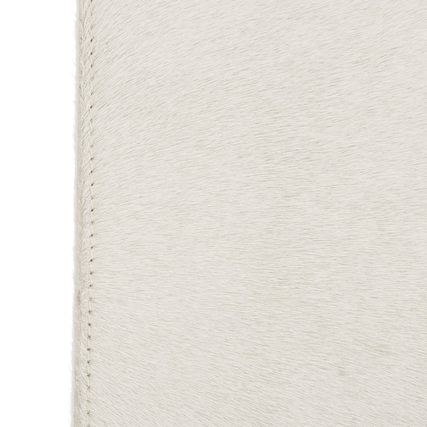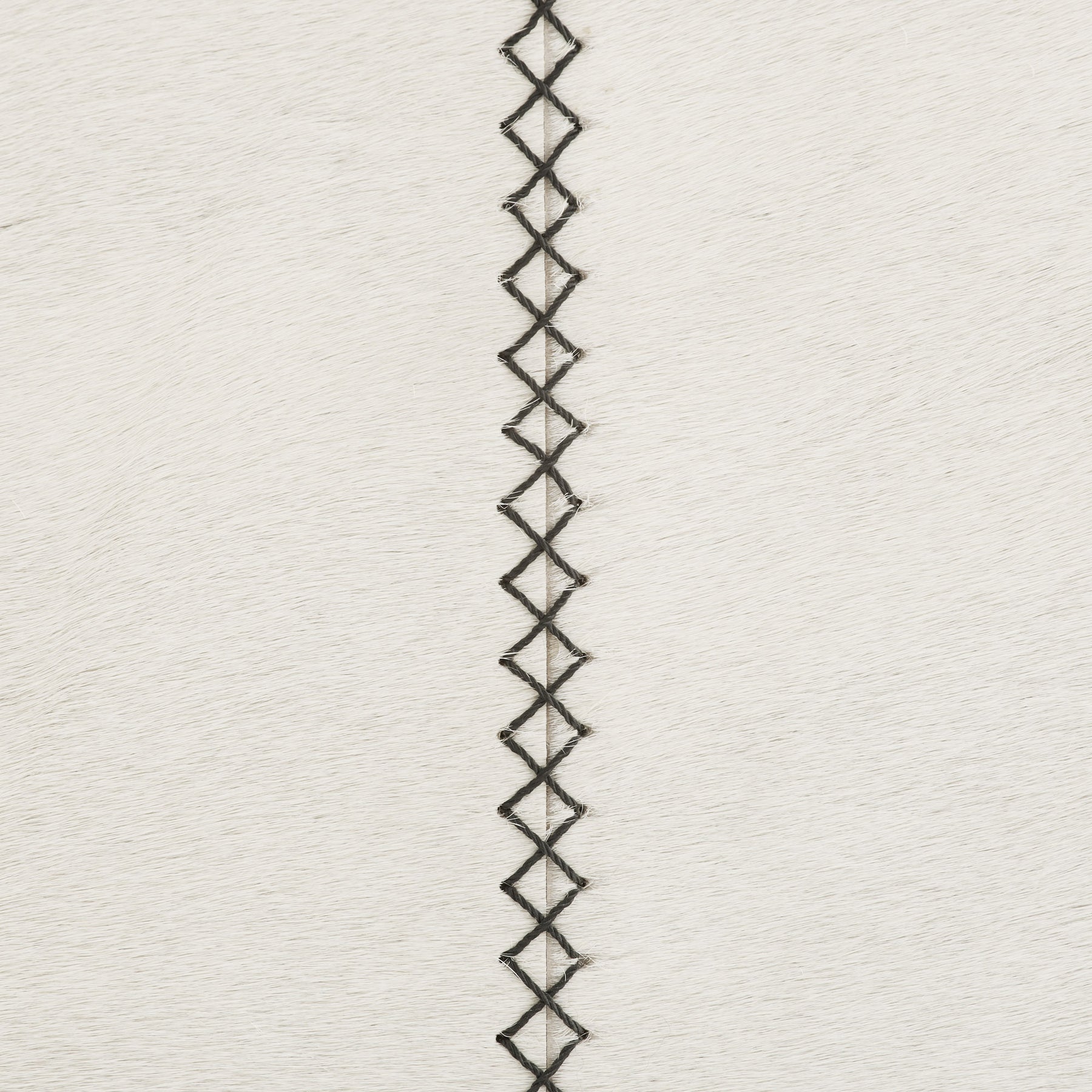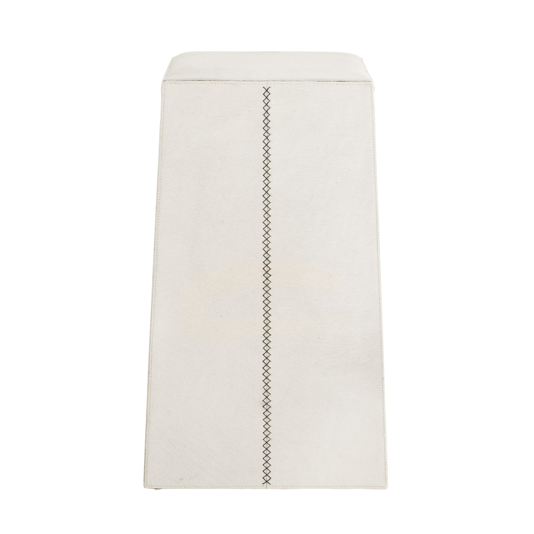 Crafted of white hair-on-hide, this backless bar stool is a tactile delight. A mitered whipstitch creates a racing stripe down the center of each side, while slim antique brass bridges add contrast and support to this minimal design. Hide will vary.