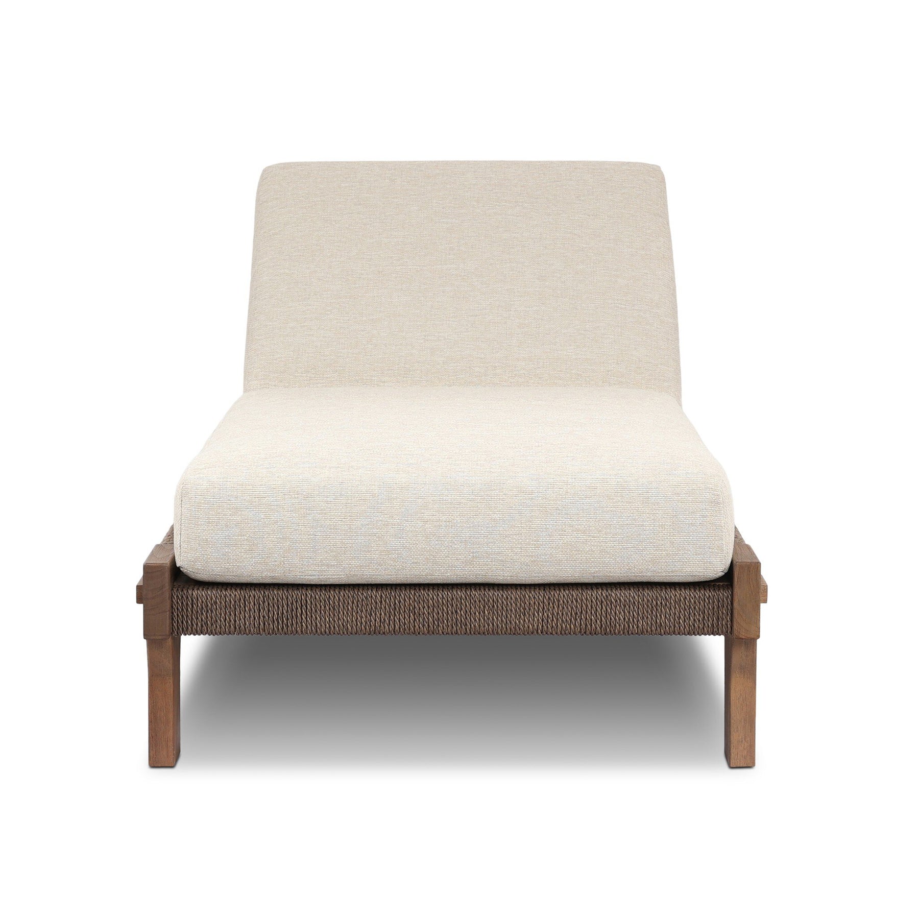 Create an outdoor space that transports you to far corners of the globe. Inspired by traditional daybeds found in Indonesia, this outdoor chaise features a beautifully crafted frame made of FSC-certified solid teak with pull-through details and monochromatic weaving throughout. Thick cushioning is covered in 100% olefin, known for its UV-resistant, water-repellent and quick-drying abilities. Cover or store indoors during inclement weather and when not in use.