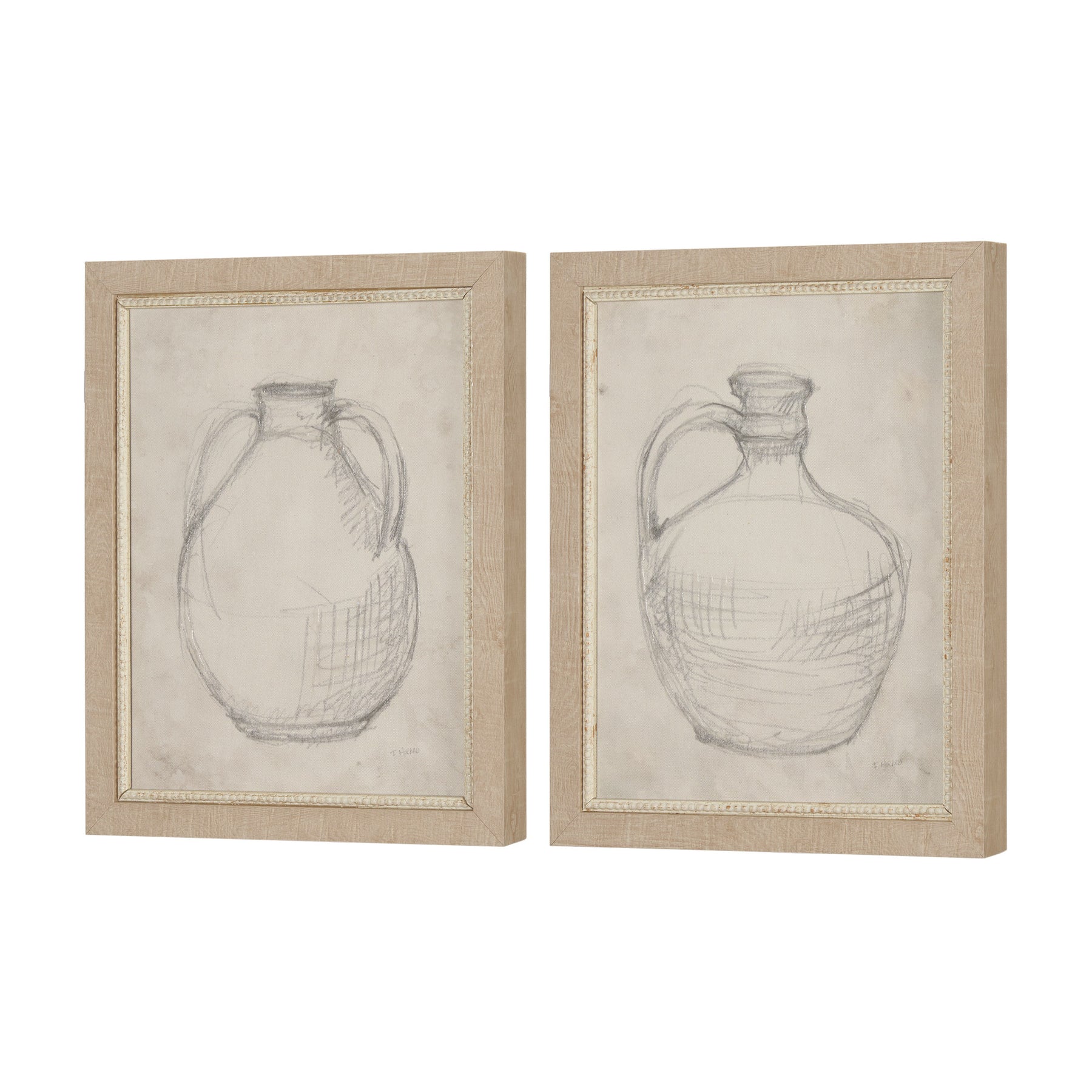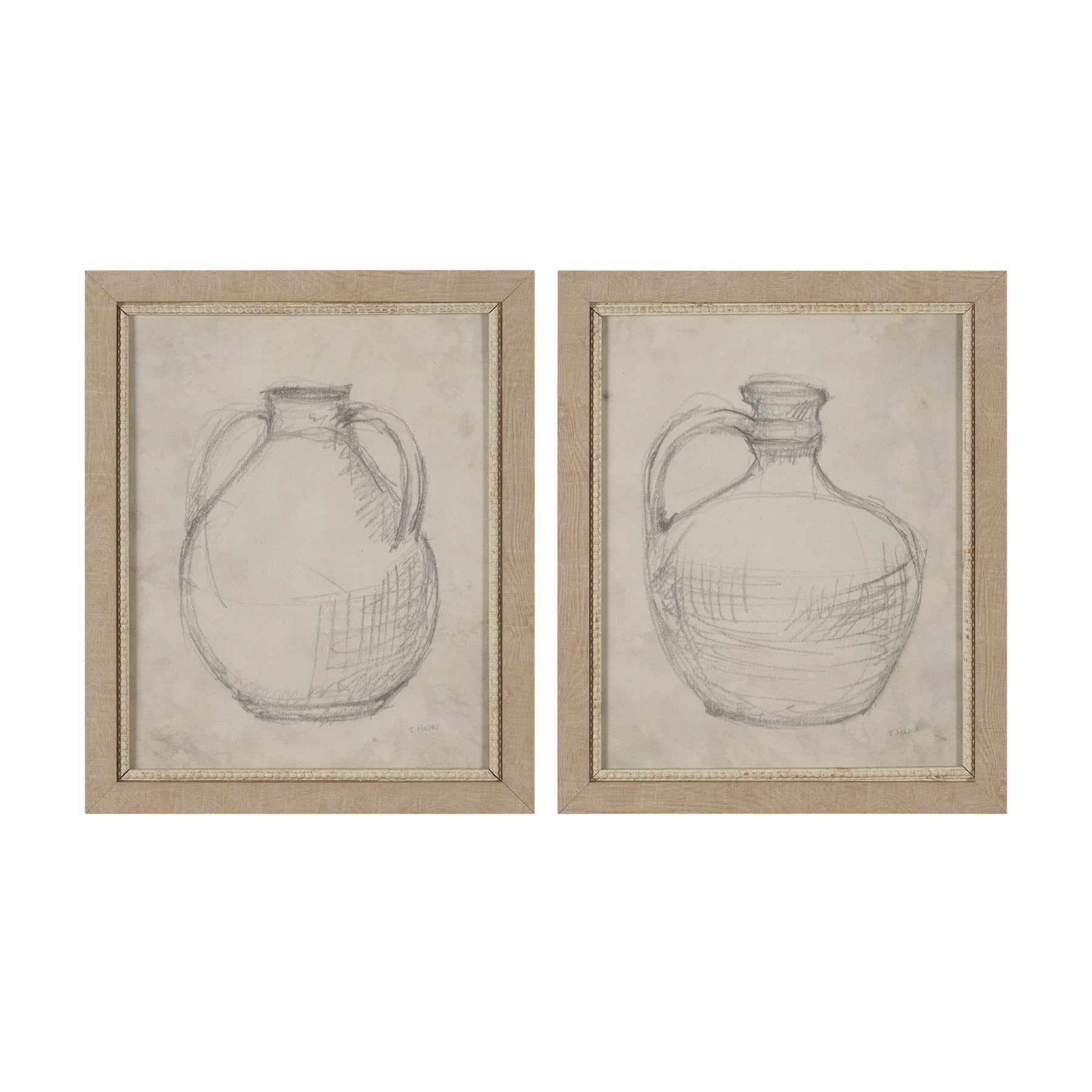 "Handled Jug Sketch (Set of 2)" by Mercana Studio is a sophisticated diptych capturing the timeless elegance of classical pottery in minimalist sketches. Rendered in muted graphite tones on parchment-hued backgrounds, these framed art prints radiate a subtle warmth and charm. Hand-embellished to accentuate texture and depth, each piece reflects a homage to artisanal craftsmanship and enduring design.