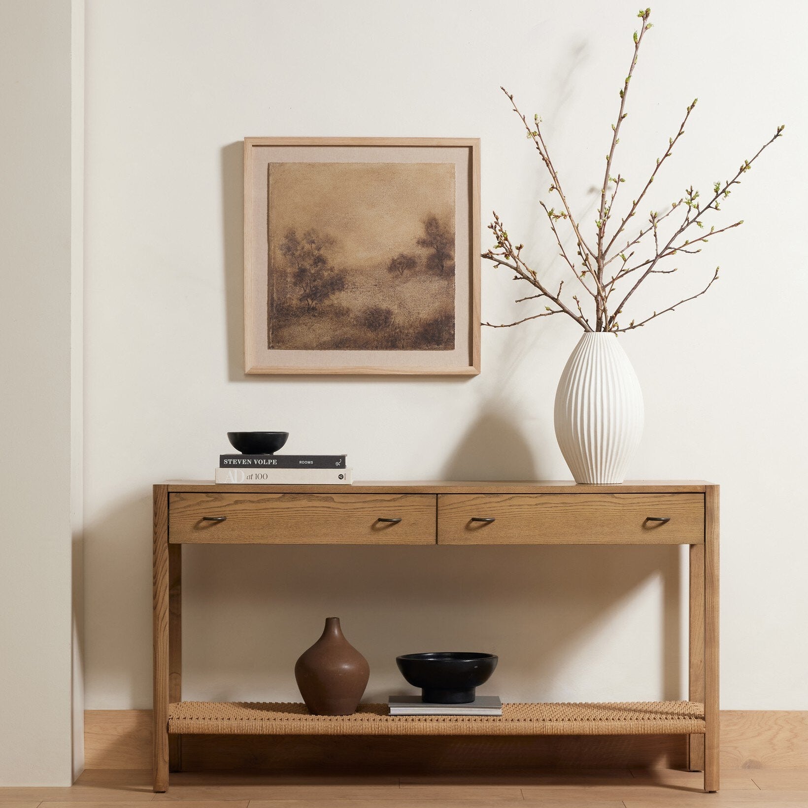 Inspired by the Texas Hill Country, Austin-based artist and registered nurse Aileen Fitzgerald paints atmospheric landscapes reminiscent of early Impressionism with a heavy emphasis on light. Framed within white oak for a gallery-quality look. If not currently in stock, this texture-enhanced piece ships within three weeks. Handmade in Austin, Texas.