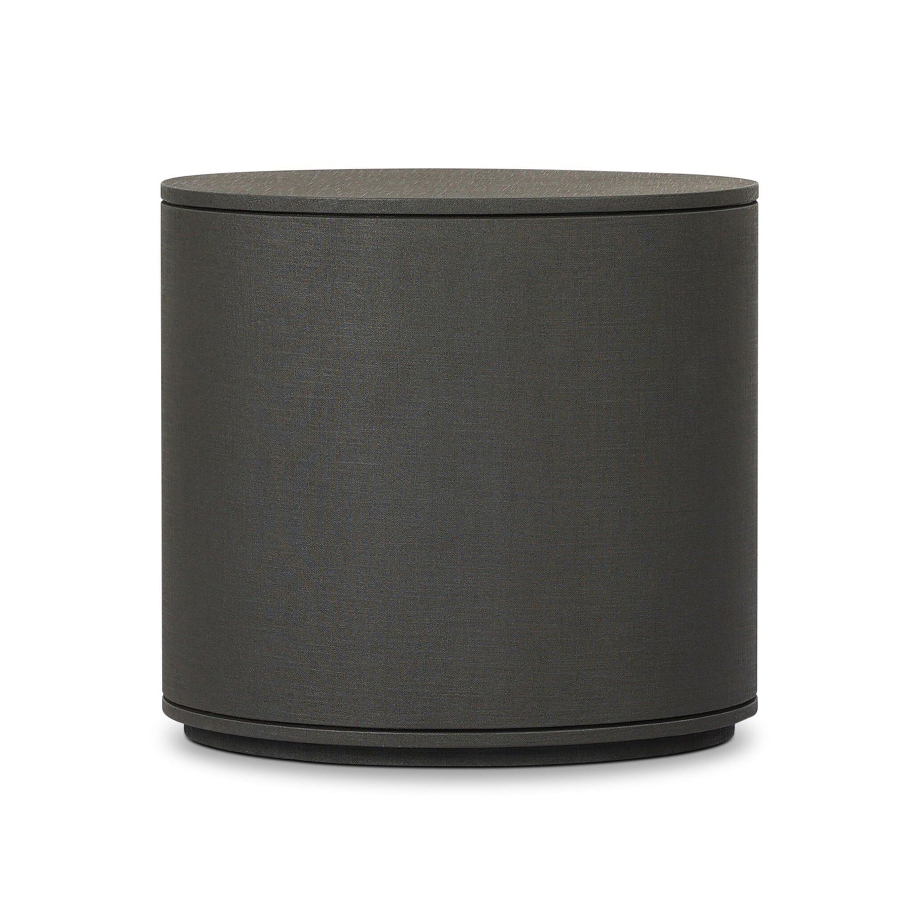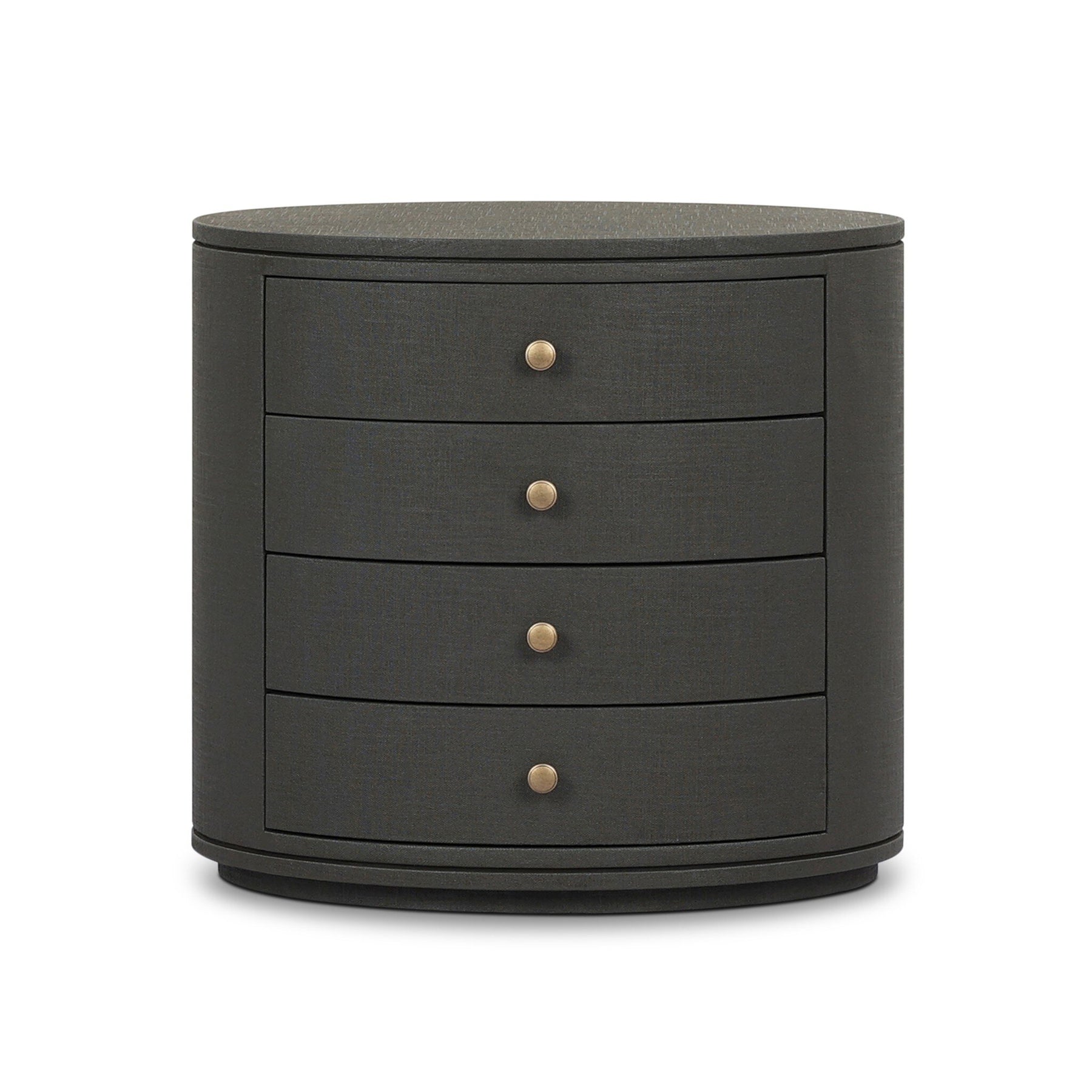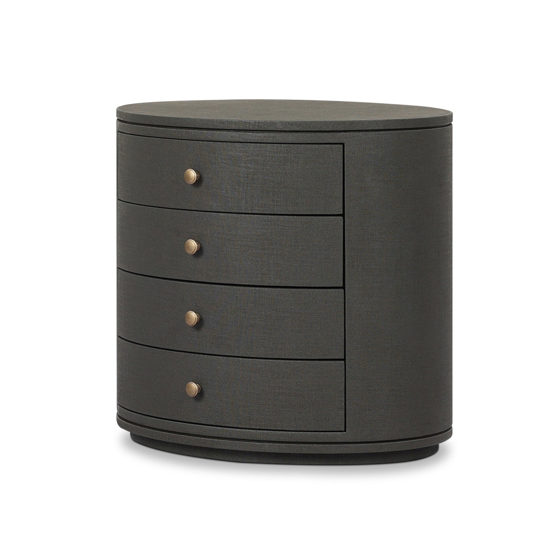 Uniquely made from ivory or black-painted linen, a beautifully curved nightstand shapes four drawers for generous bedside storage.