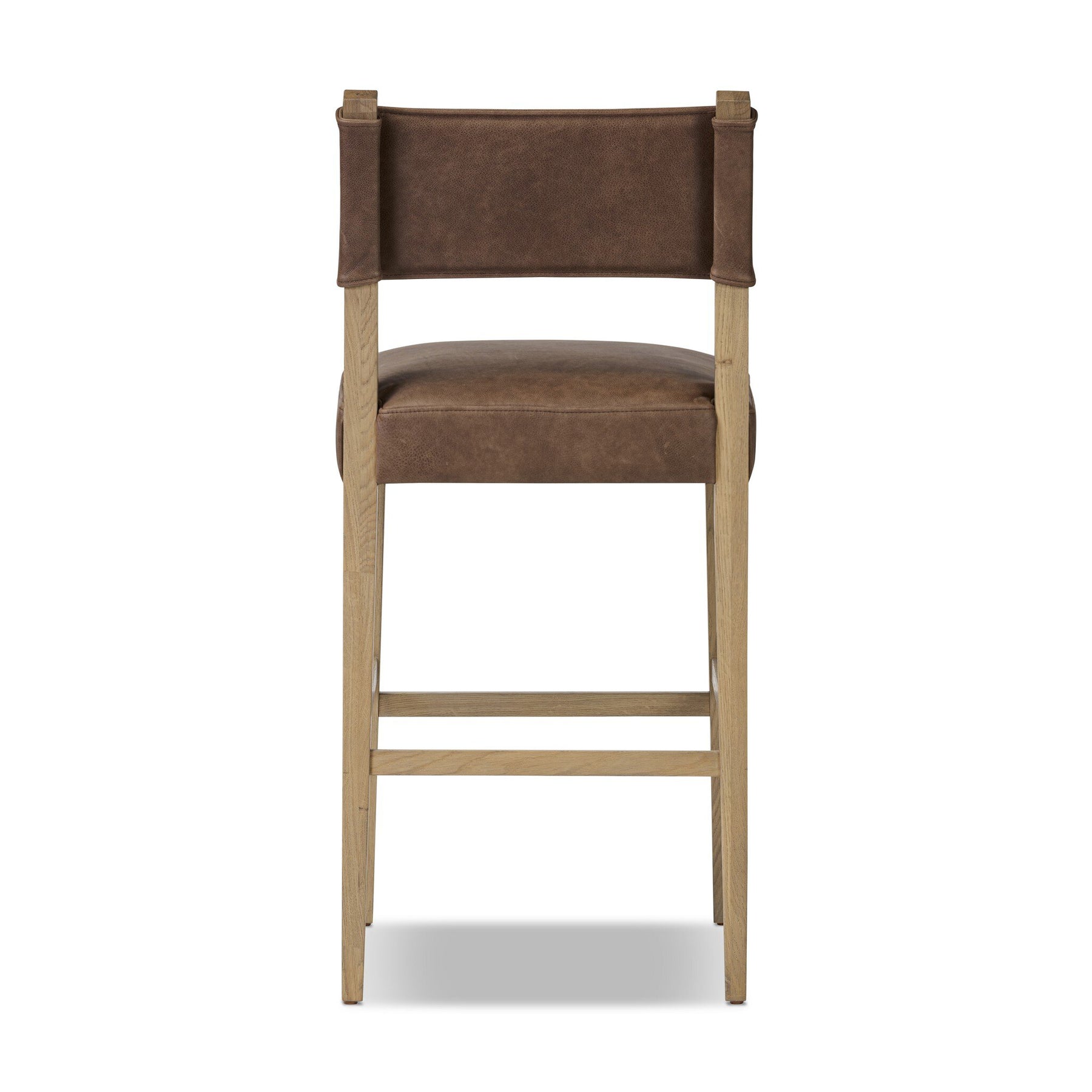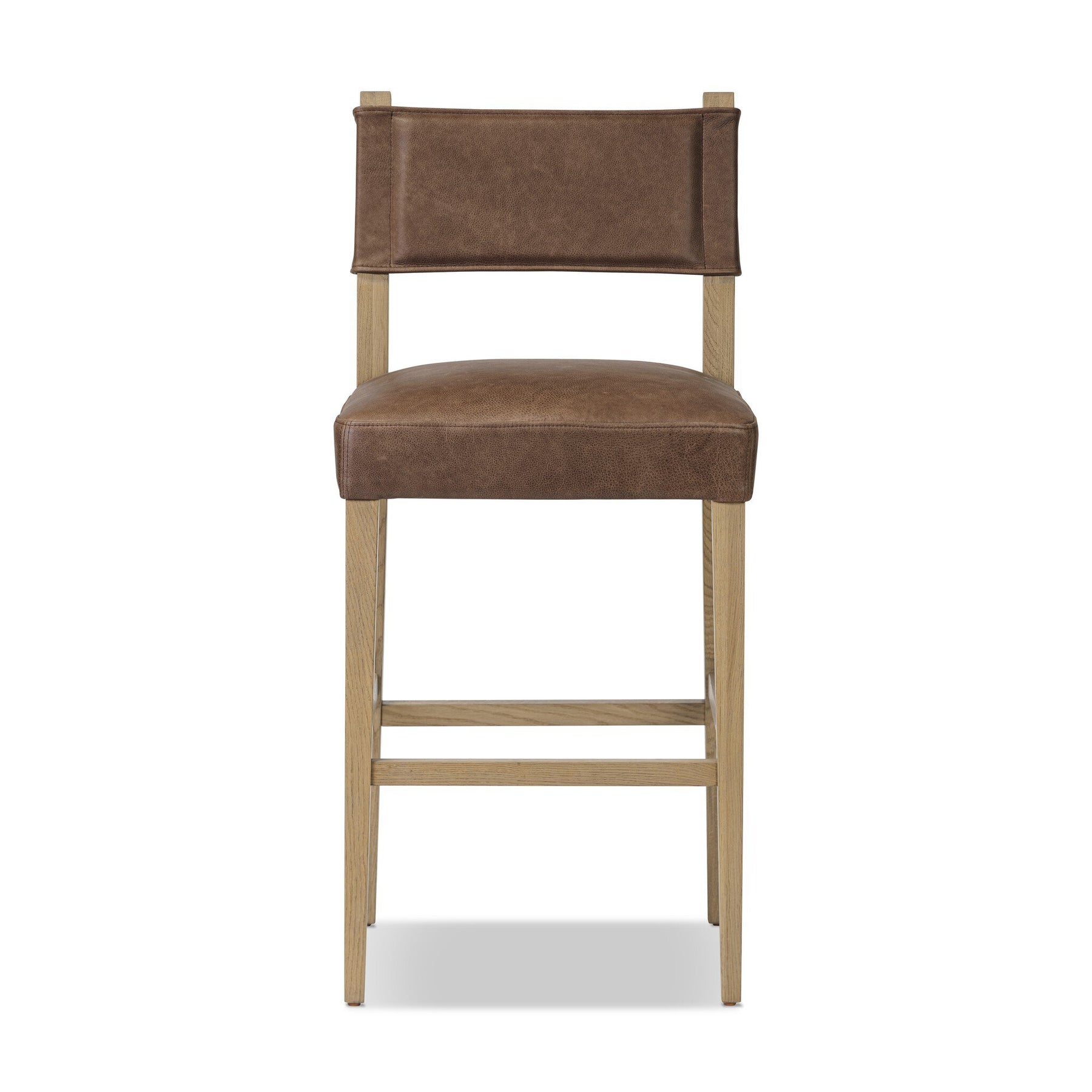 Perfectly sized for the bar or counter, this stool combines clean lines with mixed materials for a refined look. Squared seating in high-performance fabric pairs beautifully with top-grain leather backing, while solid parawood frames—offered in burnished, dark, black, or light oak finishes—add warmth and durability. Lightly waxed surfaces enhance the natural grain, bringing both texture and timeless appeal to any space.