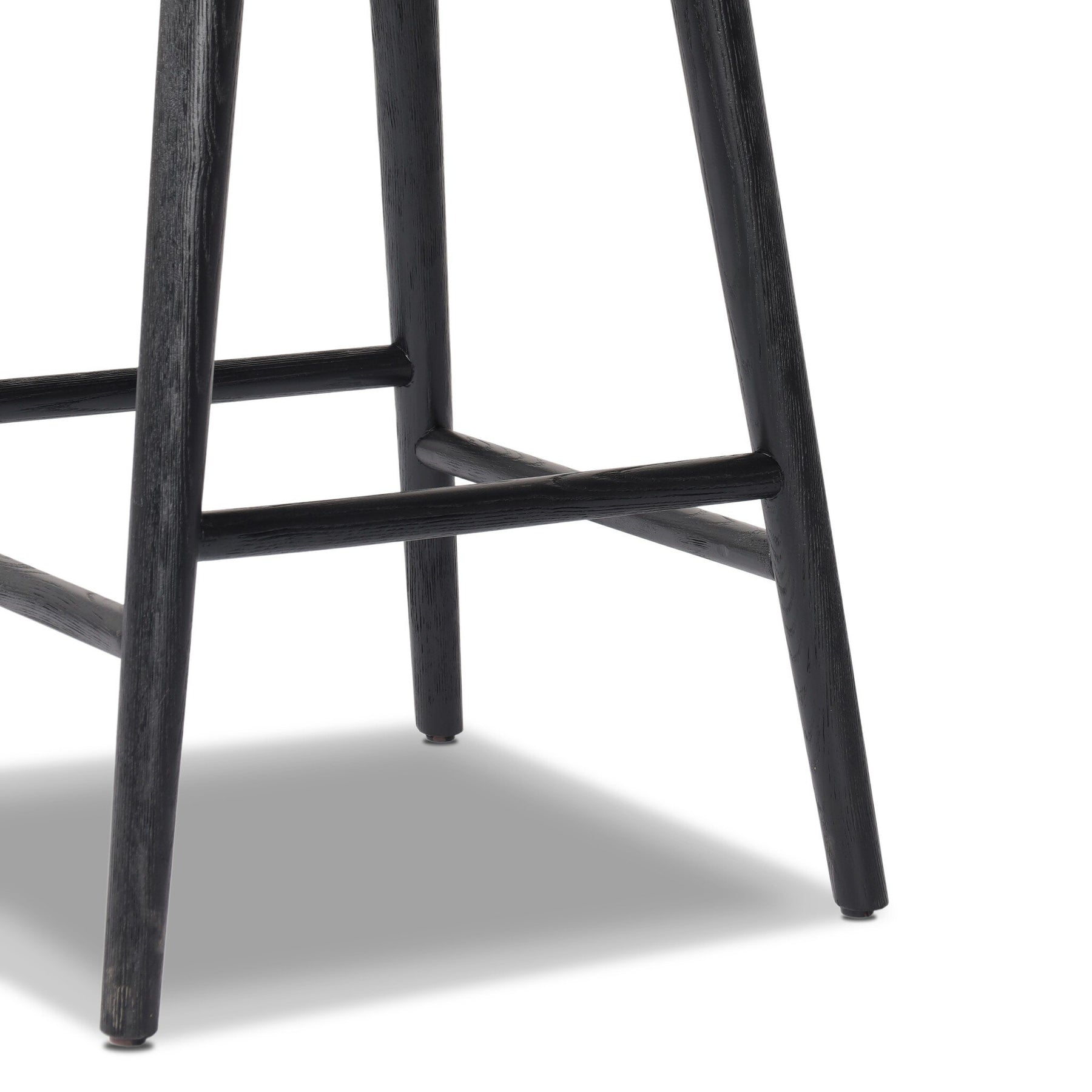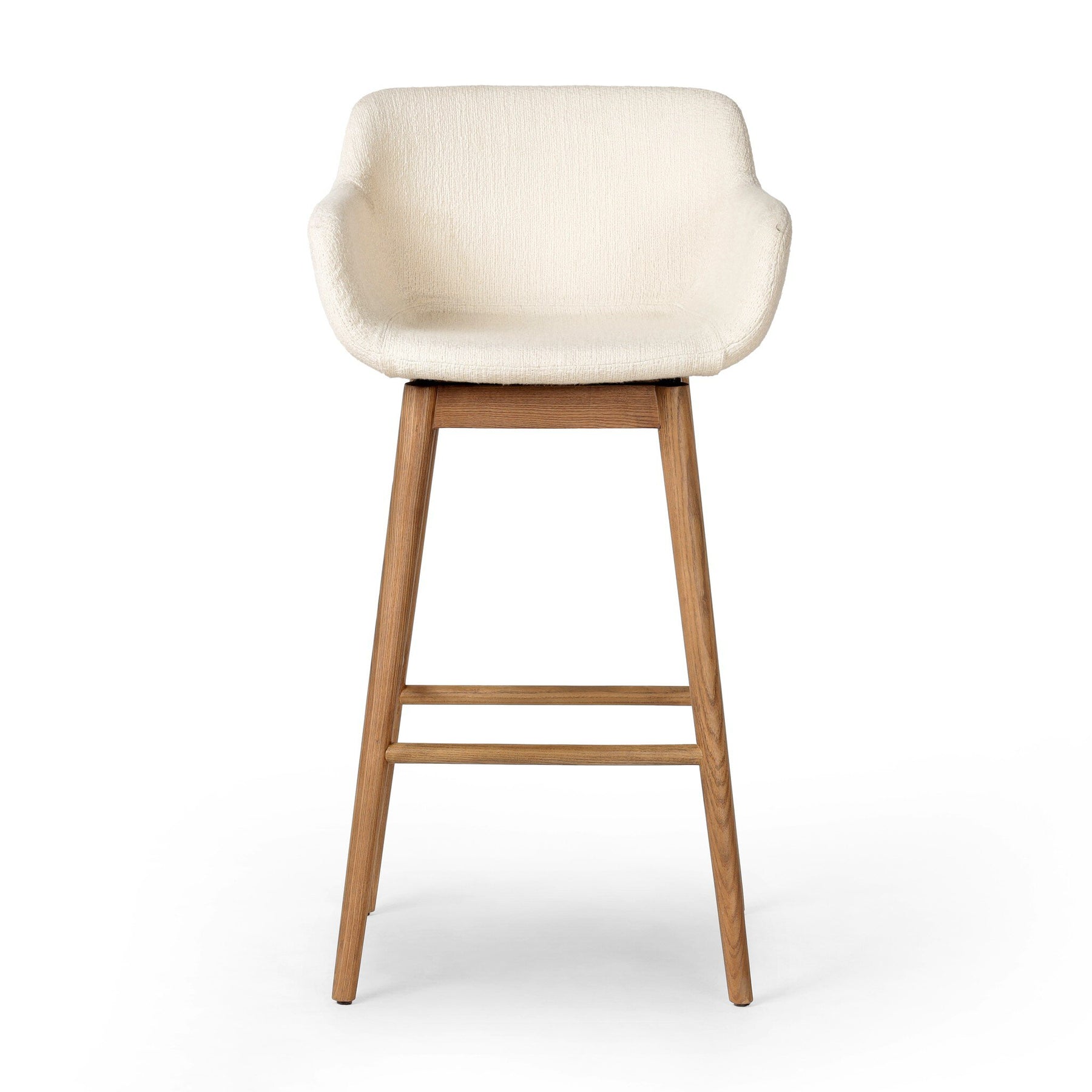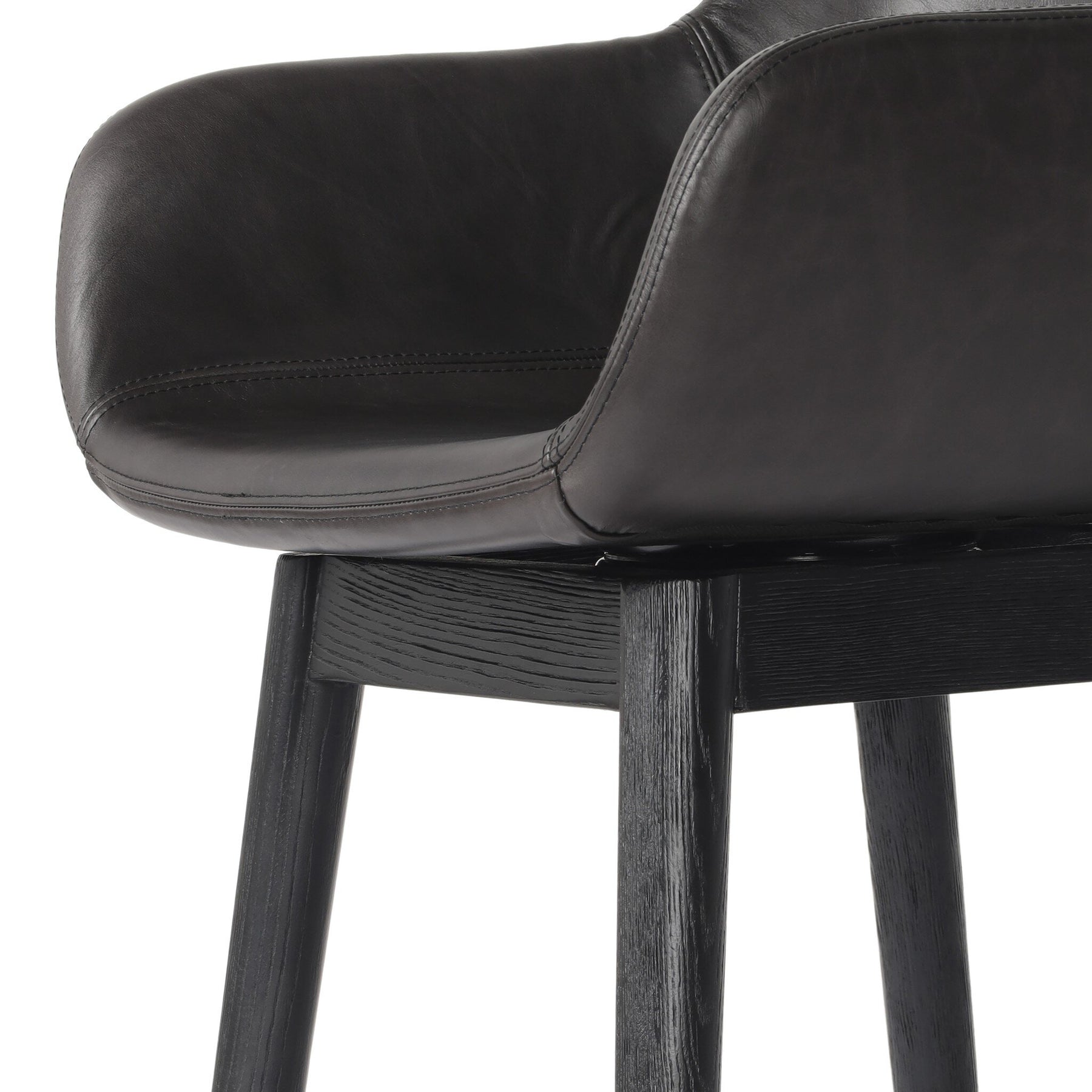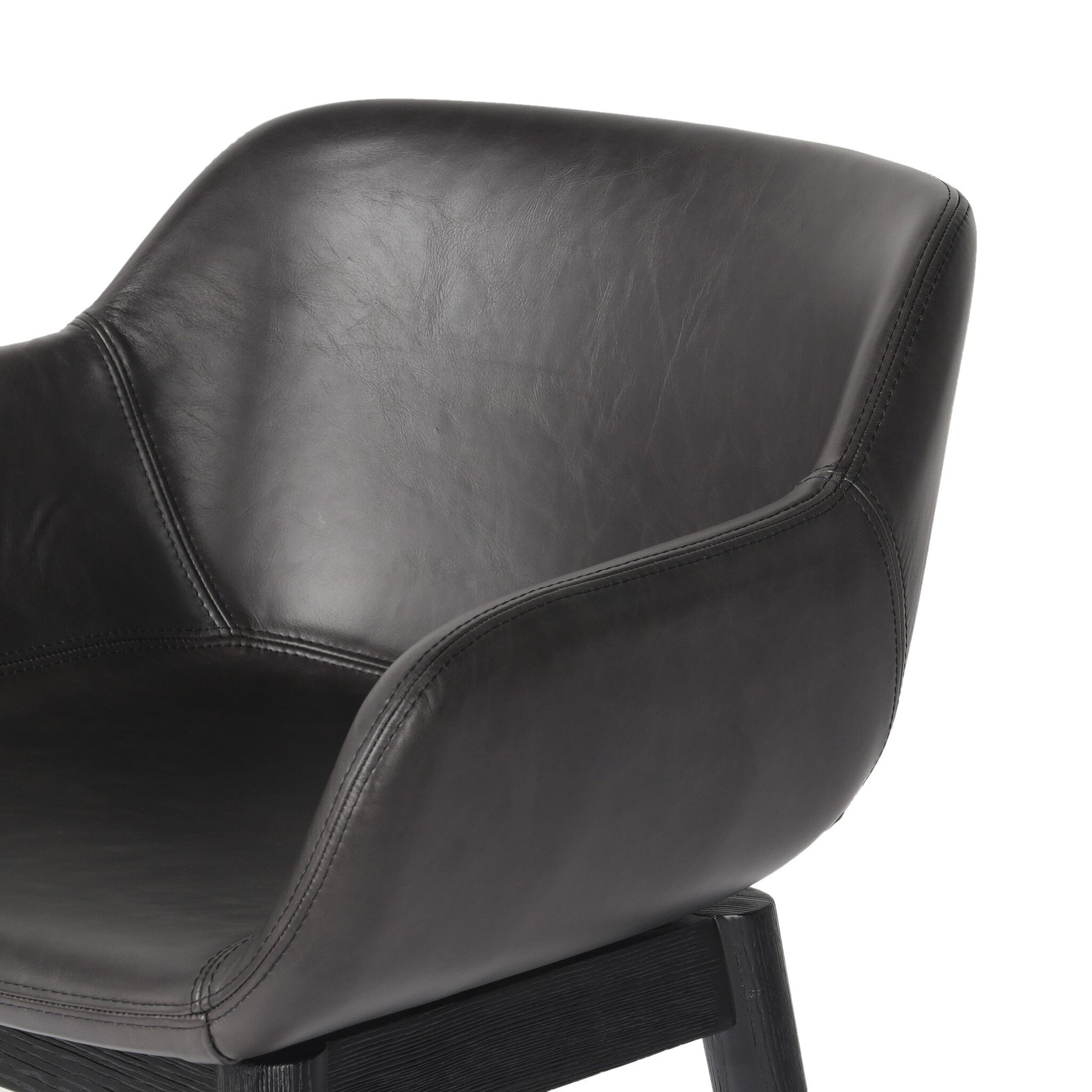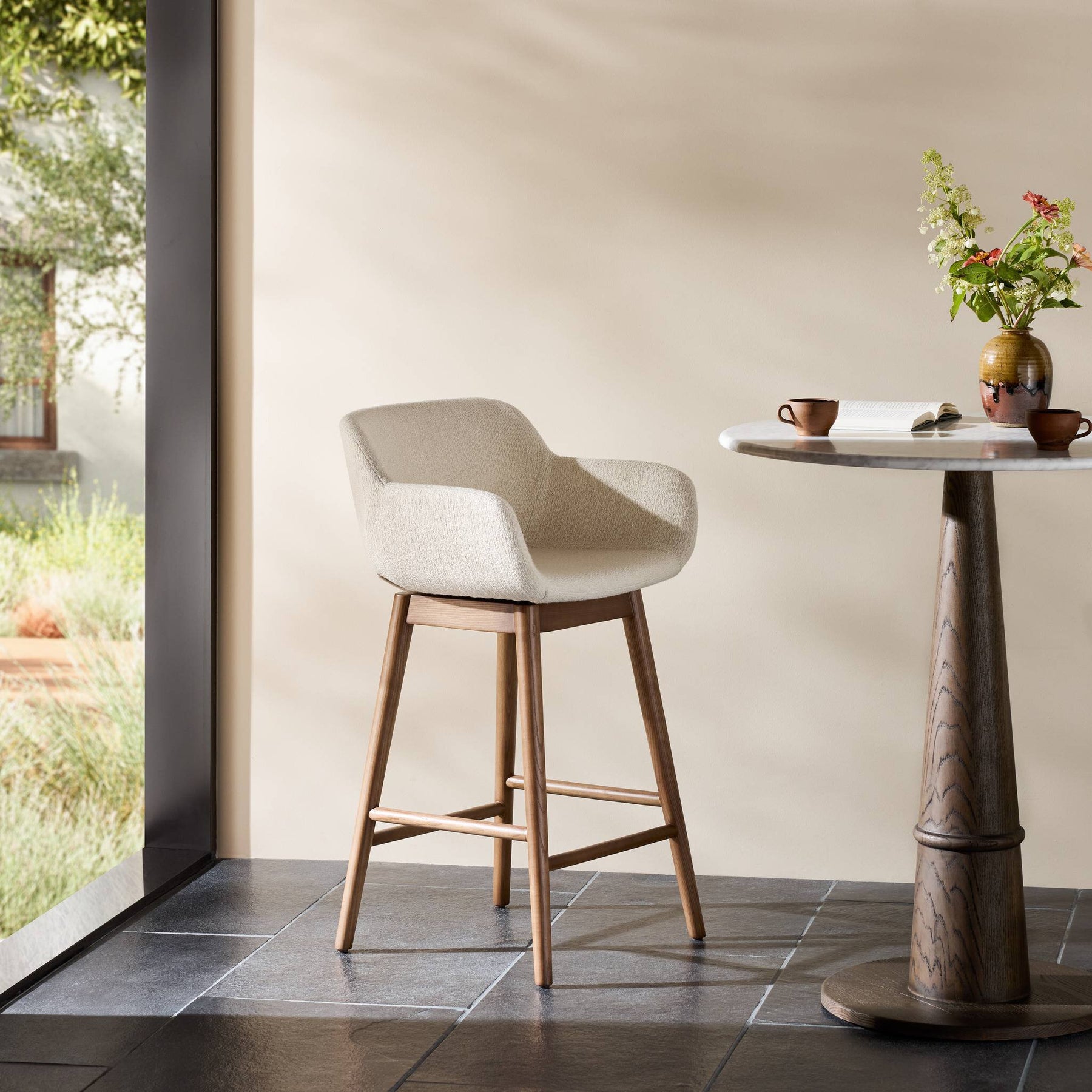 A midcentury-inspired bar or counter stool refreshed with a modern memory swivel and gracefully curved seat. Slim, tapered legs bring balance and elegance to the design. Upholstered in light performance fabric or premium top-grain leather in chestnut or black, each piece offers exceptional comfort and durability.