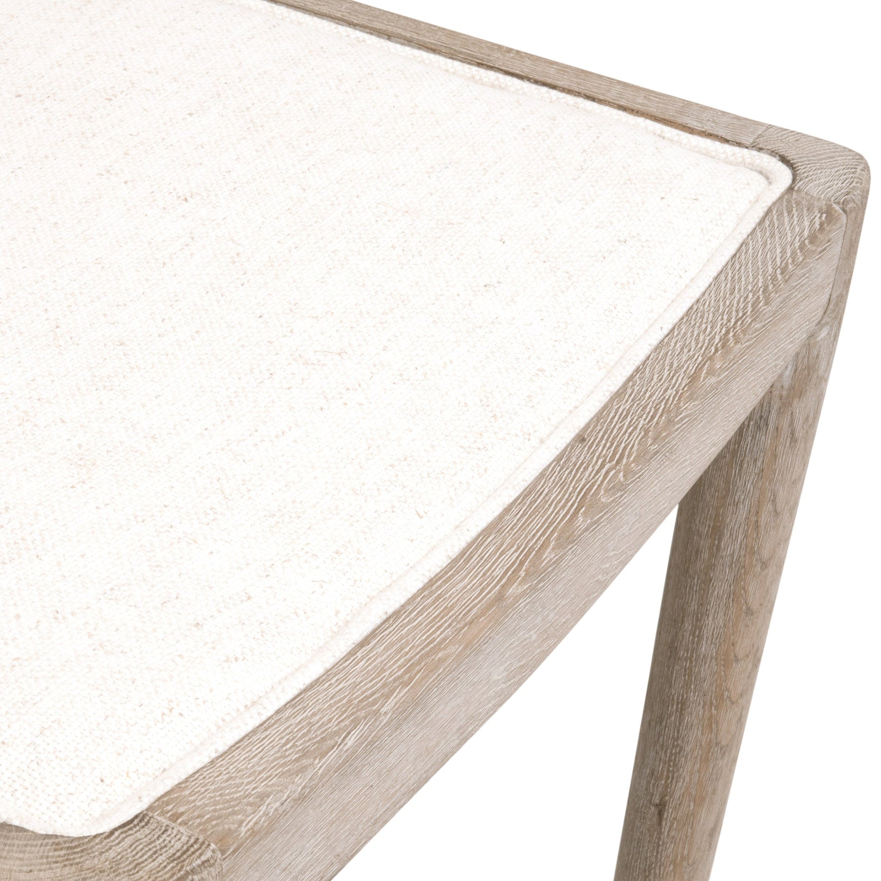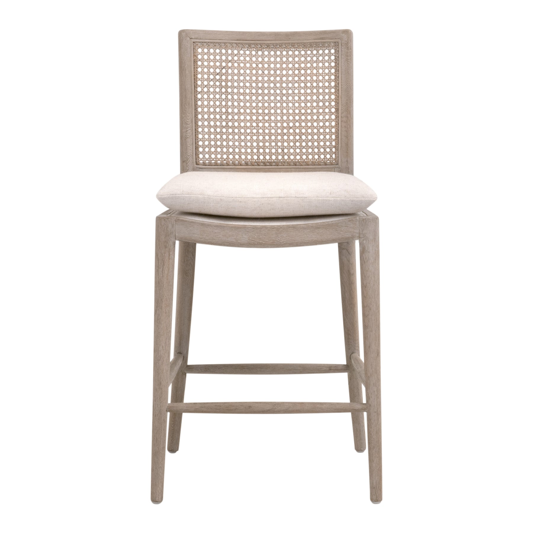 The Blake Counter Stool blends classic and modern styles with a natural gray oak frame and cane back. Its removable cream linen seat cushion is stain-resistant and durable. Designed for comfort and support, this elegant stool suits any bar or dining area.