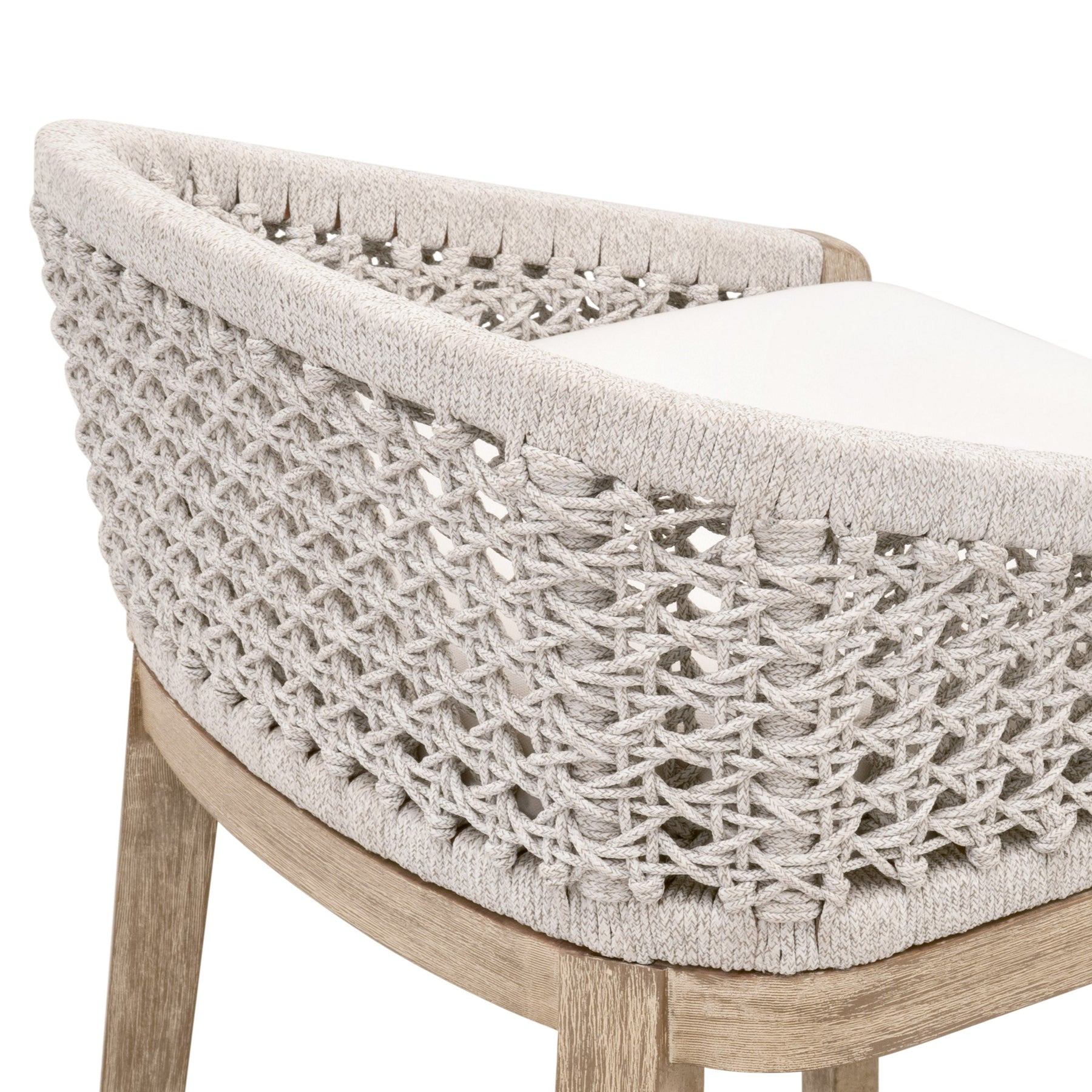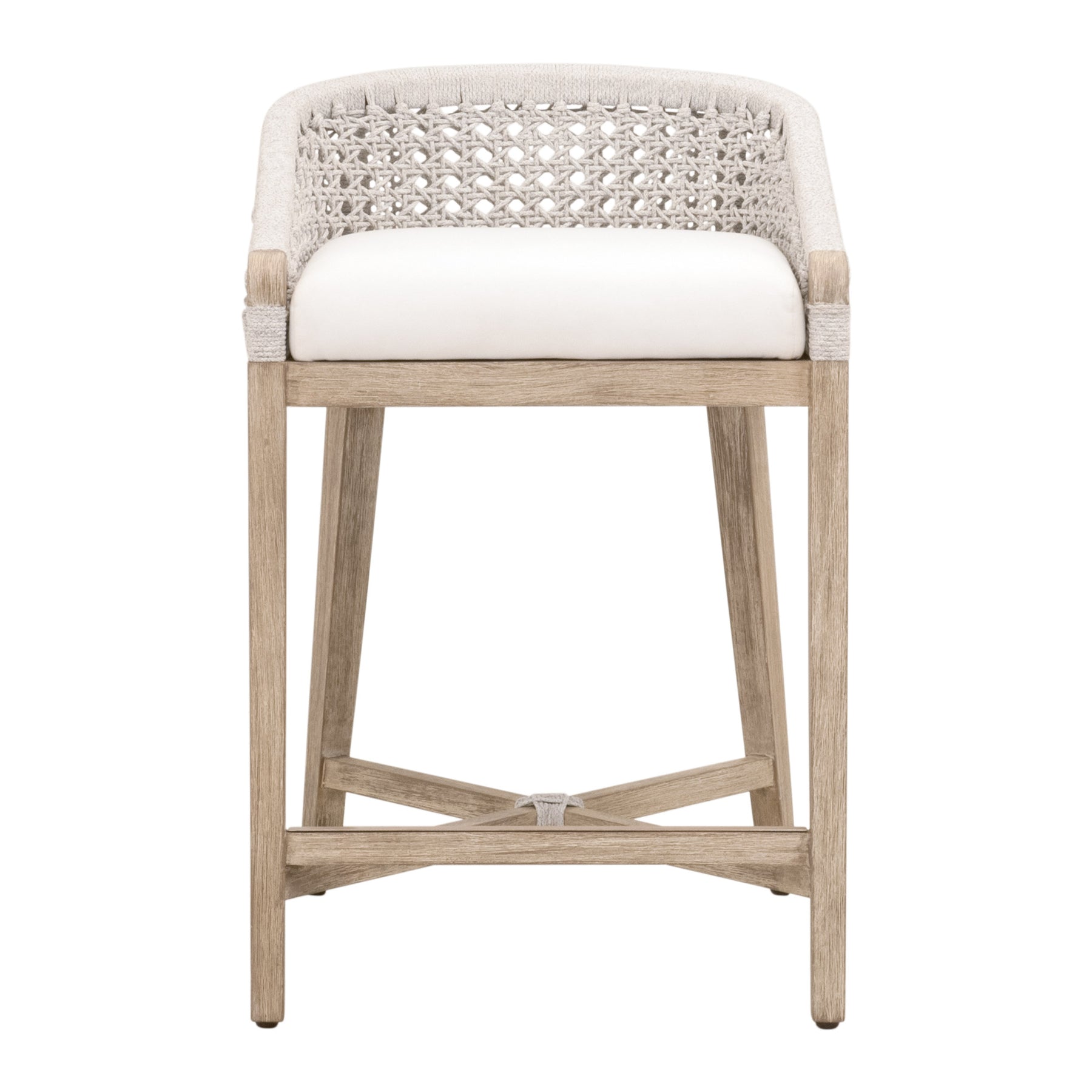 The Martha Counter Stool blends coastal charm with modern design, featuring a solid mahogany base in natural gray and a handwoven white speckle rope seat. Its high-performance cushion is easy to clean, while the sturdy X-brace legs and metal-covered footrest ensure lasting support. Ideal for stylish bars and dining areas.