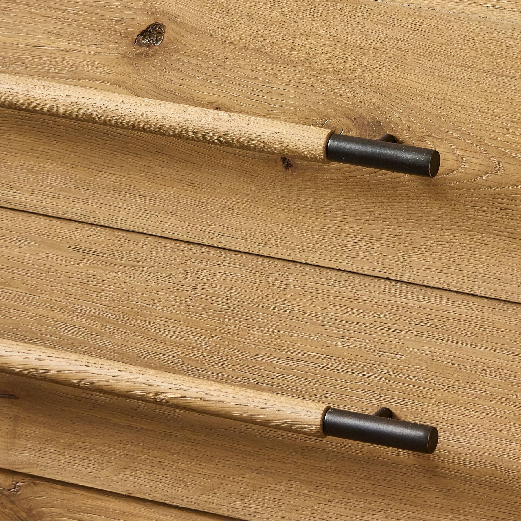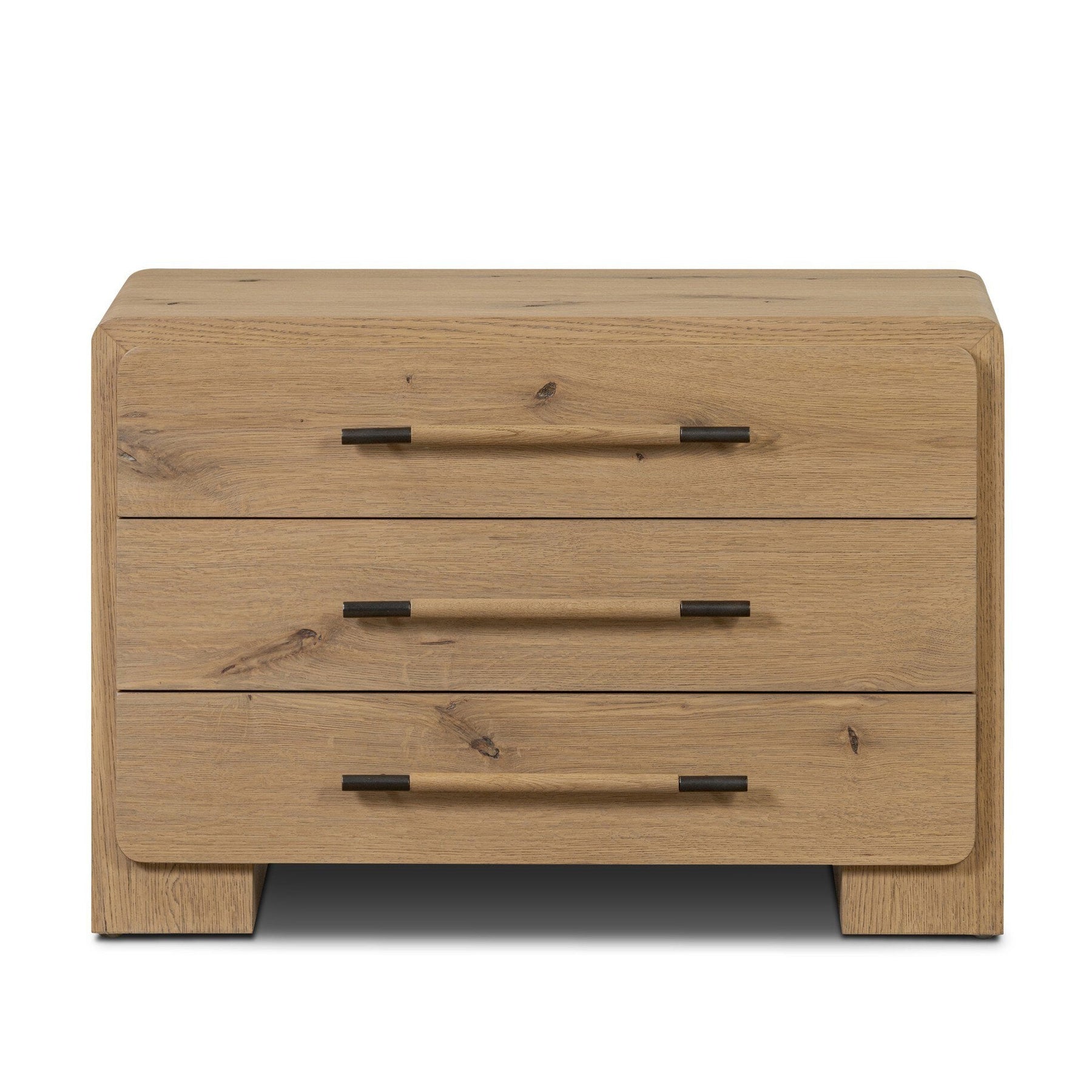 Simple and spacious, this oak nightstand has six drawers paired with aged bronze and wood hardware. Waterfall shaping and soft-close undermount glides give a smooth finish.