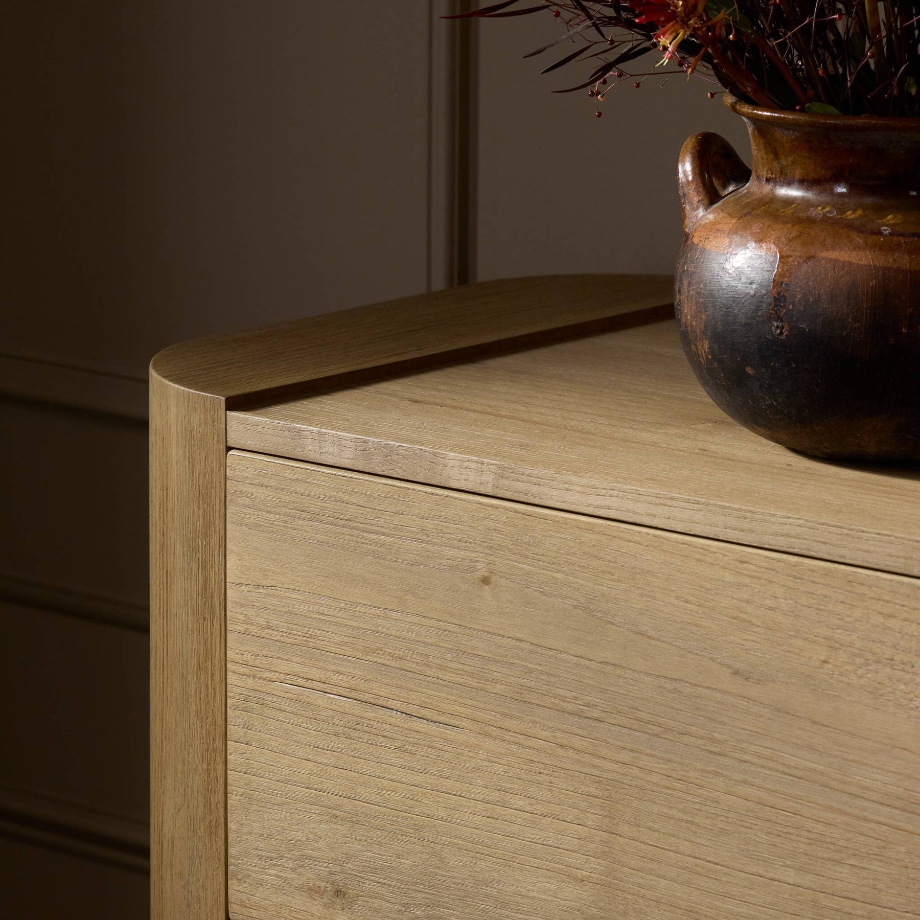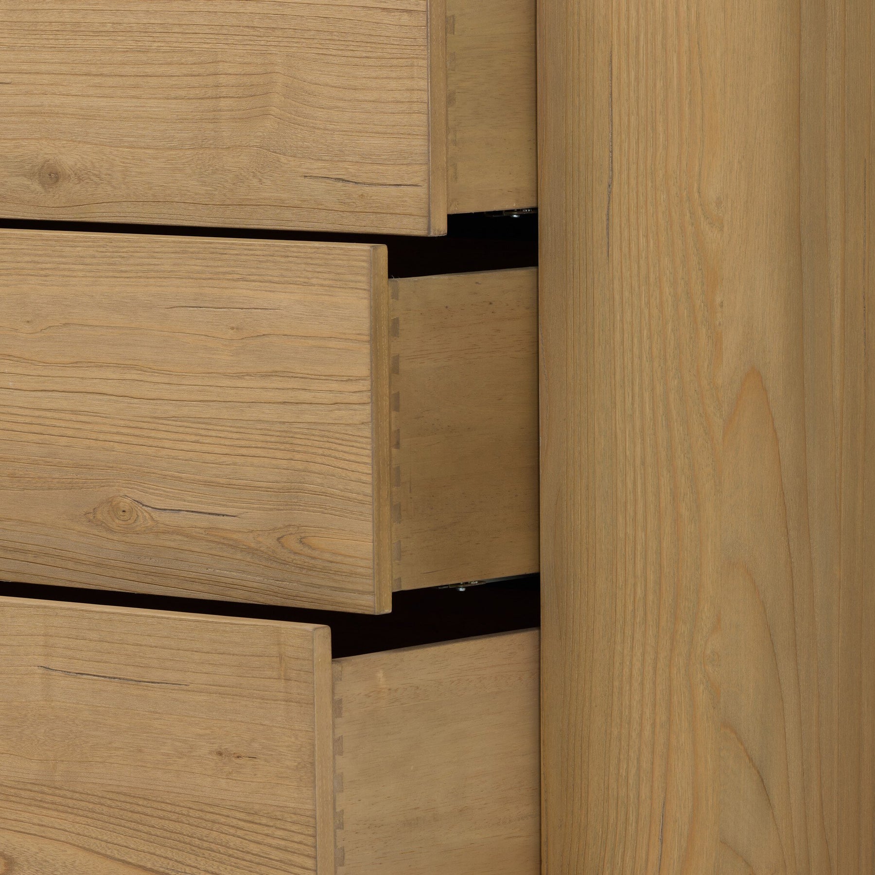 A smart choice in minimalist bedroom, this sungkai dresser is sandblasted to highlight the wood's natural grain. Rounded corners soften the finished look, and eight push-latch drawers maintain the understated style.
