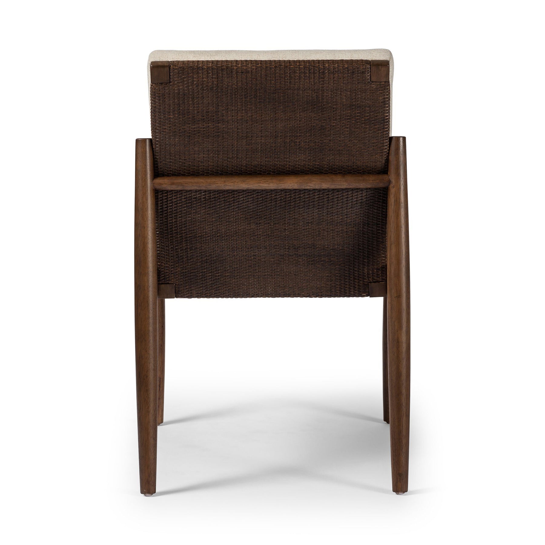 The traditional rattan chair gets an elevated look in this heritage-inspired dining seat. Clean lines create a sleek wood frame that provides a simple backdrop to mixed materials. Designed with rattan accents on the side, while natural performance linen provides practical seating for everyday use. Performance fabrics are specially created to withstand spills, stains, high traffic and wear, ensuring long-term comfort and unmatched durability.