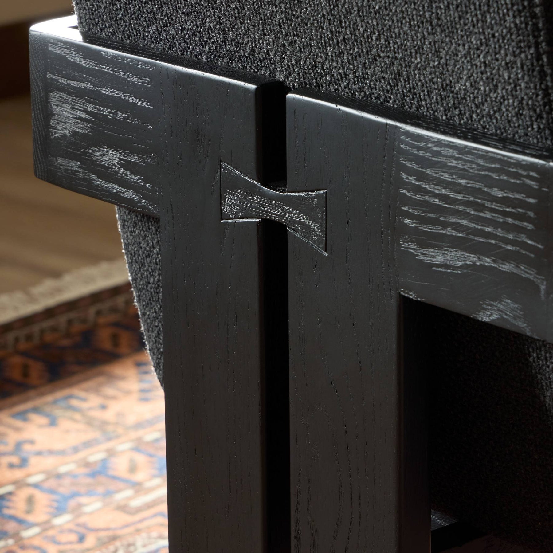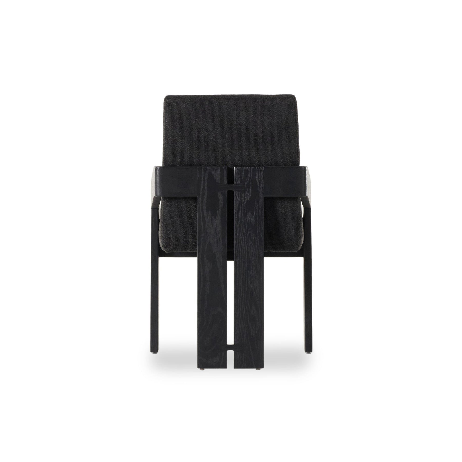 Unique in shape with a dark, monochromatic look. Black-brushed or Smoked grey parawood forms an angular frame, featuring butterfly joints between the back legs. Black high-performance fabric is the smart choice for everyday dining. Performance fabrics are specially created to withstand spills, stains, high traffic and wear, ensuring long-term comfort and unmatched durability.