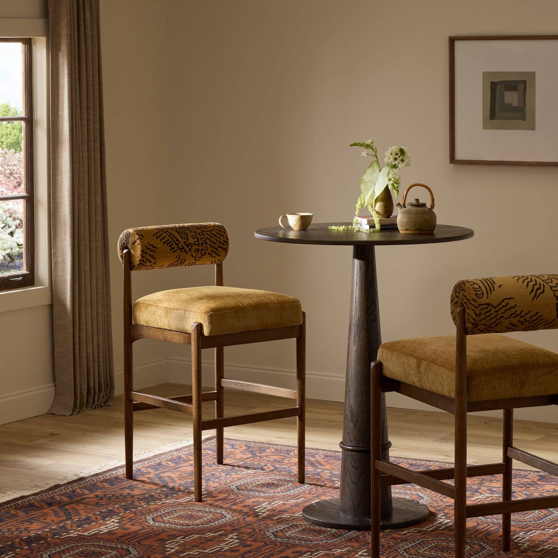 A modern twist on the classic bar and counter stool, this piece features a playful bolstered cylinder back for added style and comfort. Designed to elevate your bar, kitchen, or dining space with a touch of contemporary charm.