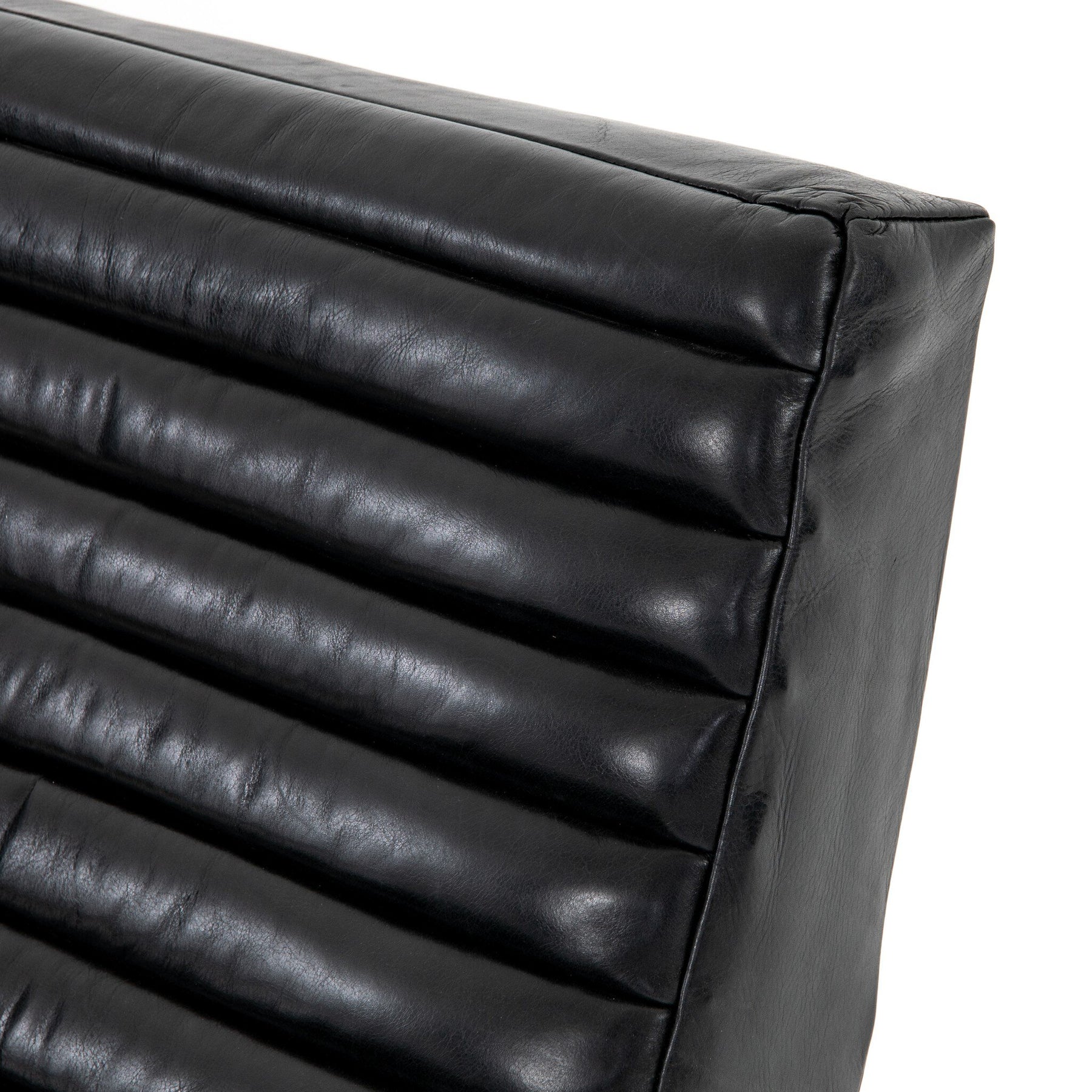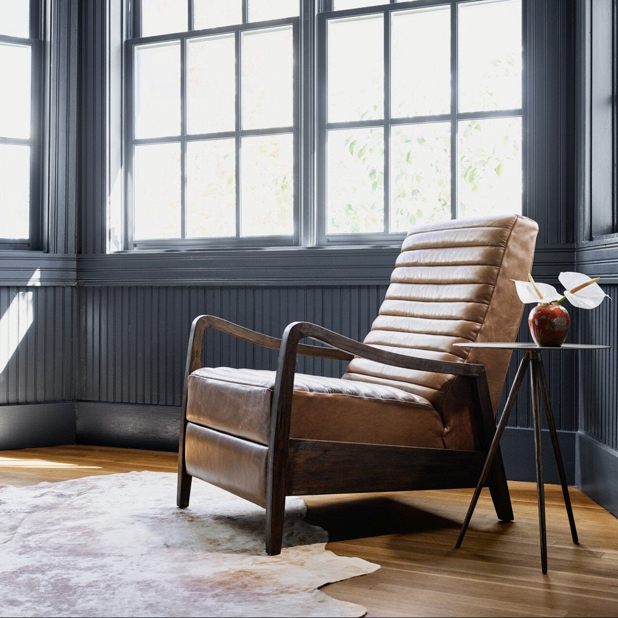 A dramatically shaped mid-century silhouette is modernized with on-trend channel tufting and an invitingly curved seat. Upholstered in supple top-grain leather in a range of refined hues—from soft neutrals and warm camel to classic black—each piece is framed by beautifully finished wood, including natural parawood, whitewashed ash, or rich sienna brown tones that highlight striking positive and negative space. A smooth push-recliner mechanism elevates this forward-thinking lounger, delivering both standout style and effortless comfort.