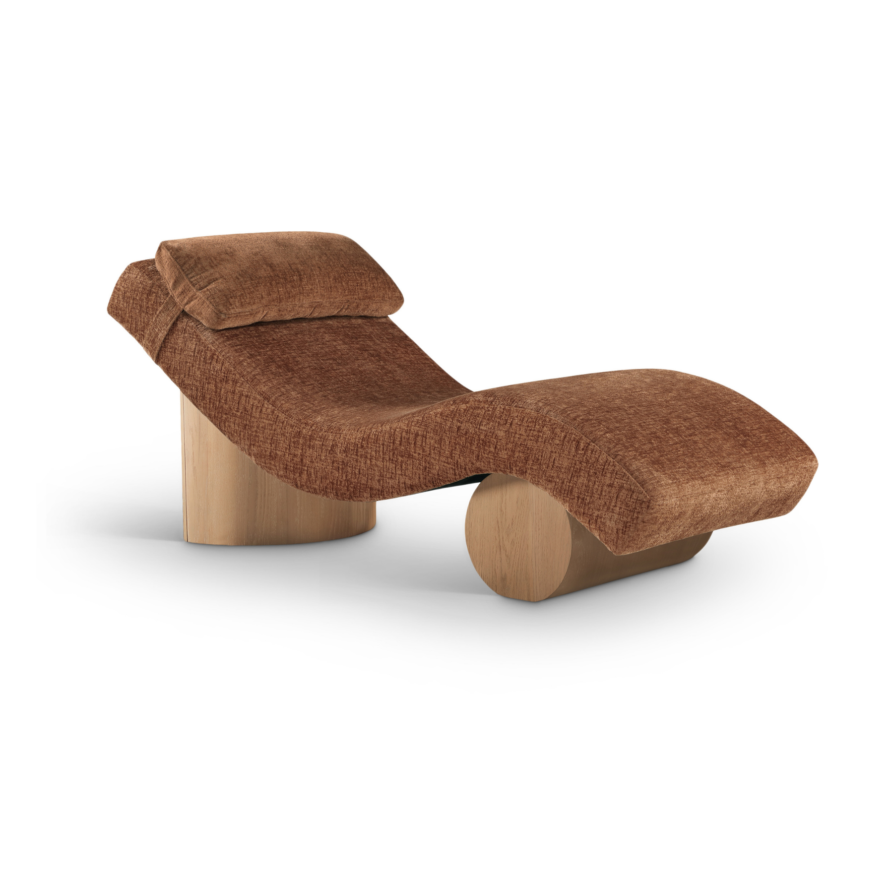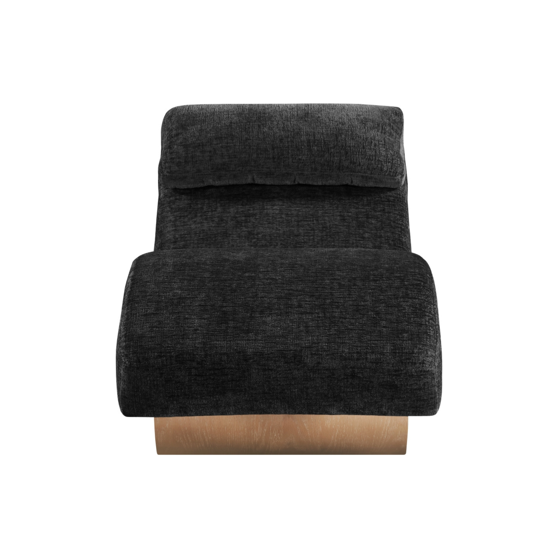 Sculptural curves and plush black polyester give Marcelle a bold, art deco vibe that demands attention. Anchored by a natural wood base, this chaise lounge is the perfect spot to stretch out in style. With its striking silhouette, it's more than just a seat - it's a statement.