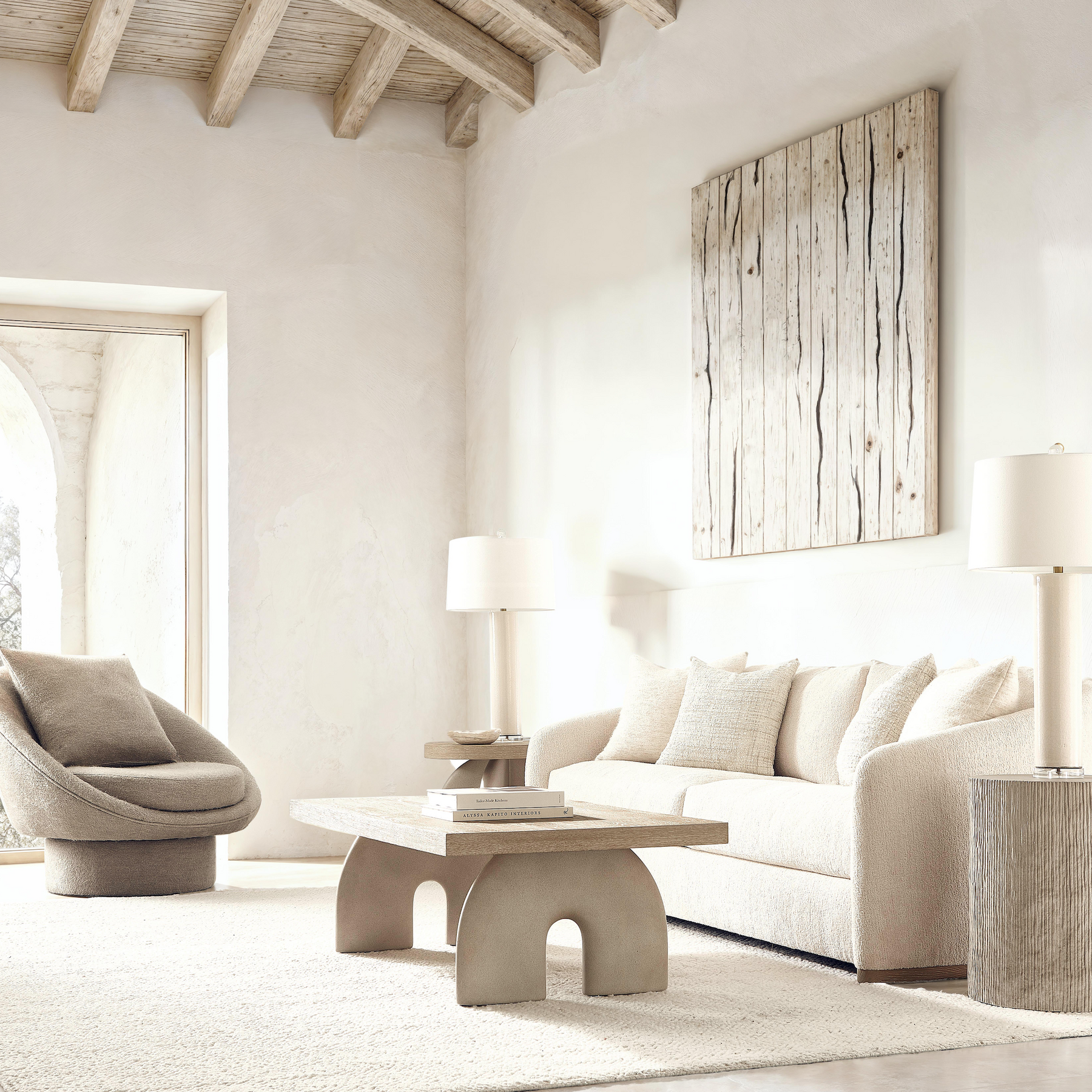 - Rustic oak top in Roz finish supported by two arched, glass-reinforced concrete panels in Pumice finish