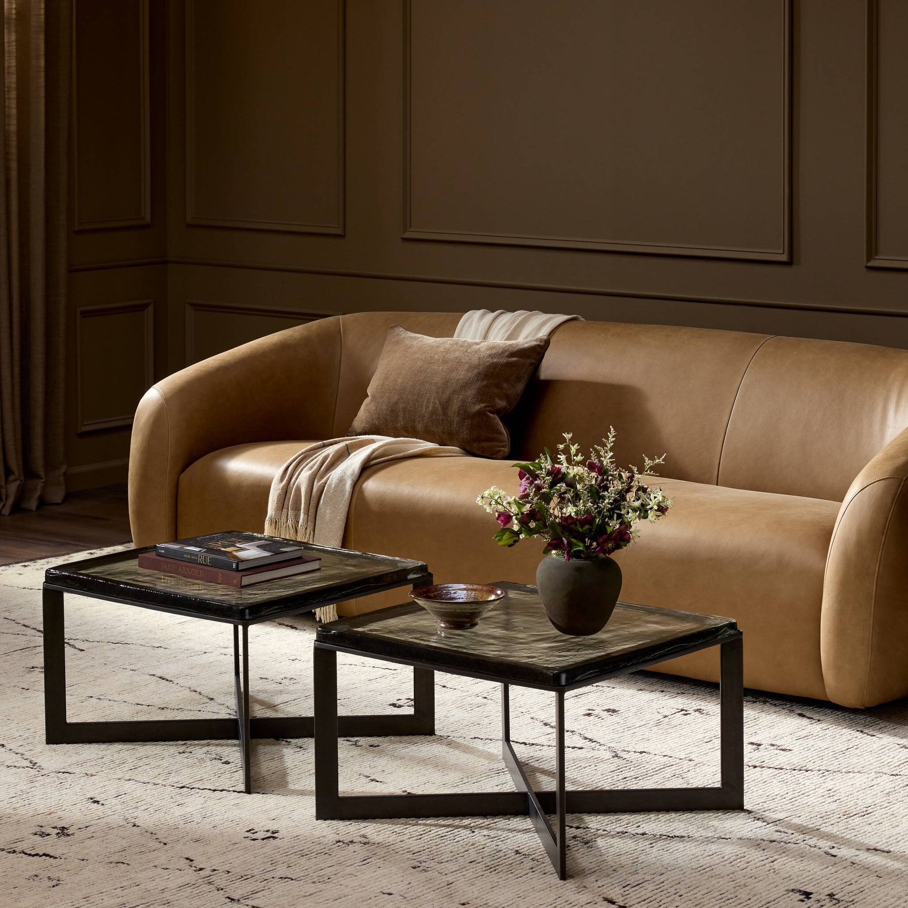 An airy, angular base of charcoal-burnished iron supports a squared tabletop of amber cast glass, perfectly sized to keep your drink or book within reach. Styles well alone or paired in multiples.