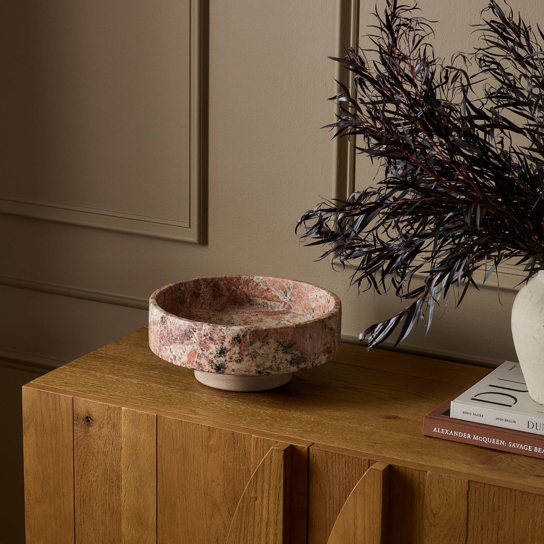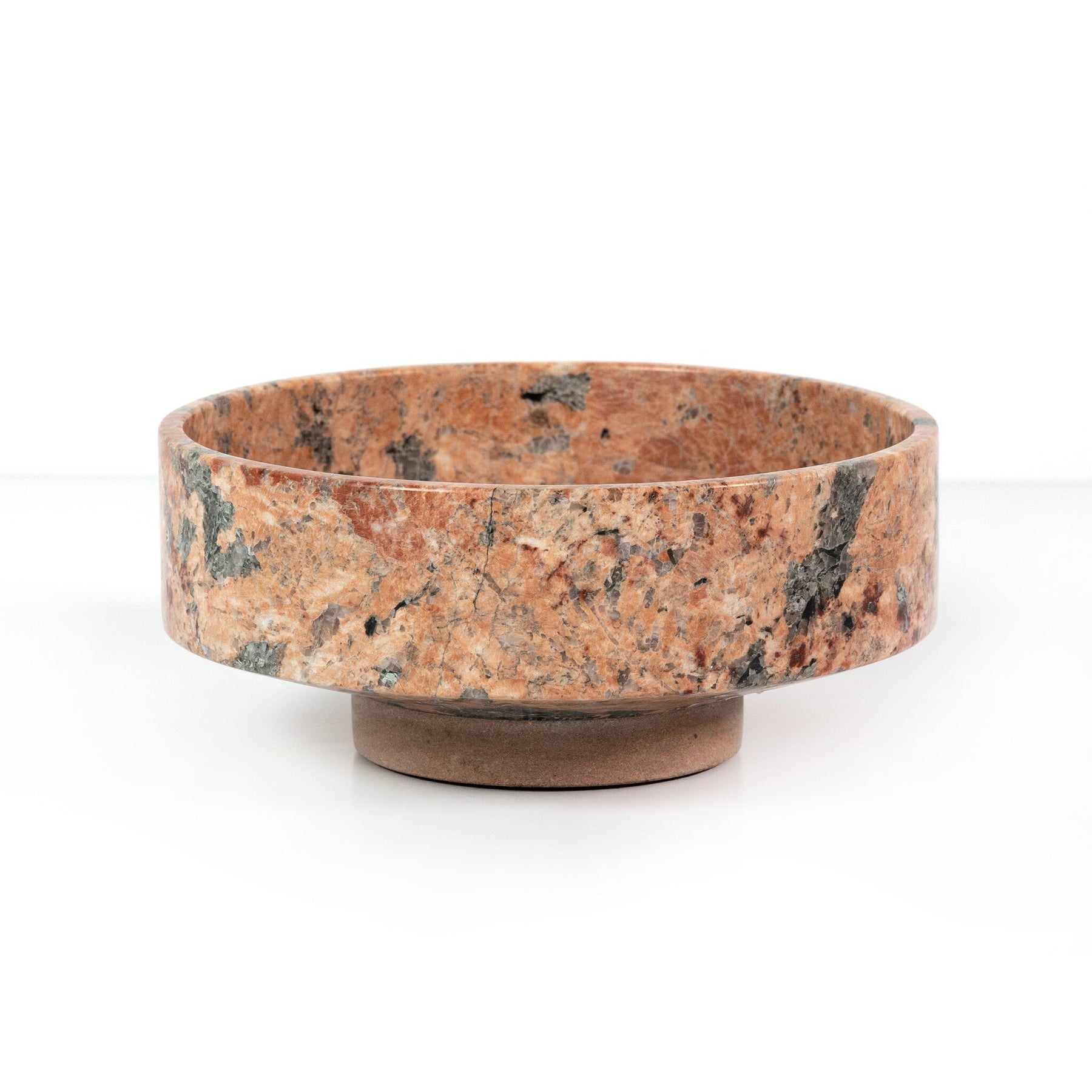 Made from solid red marble and terracotta-colored sandstone, a turned top lends great depth to this decorative bowl that awes just about anywhere.