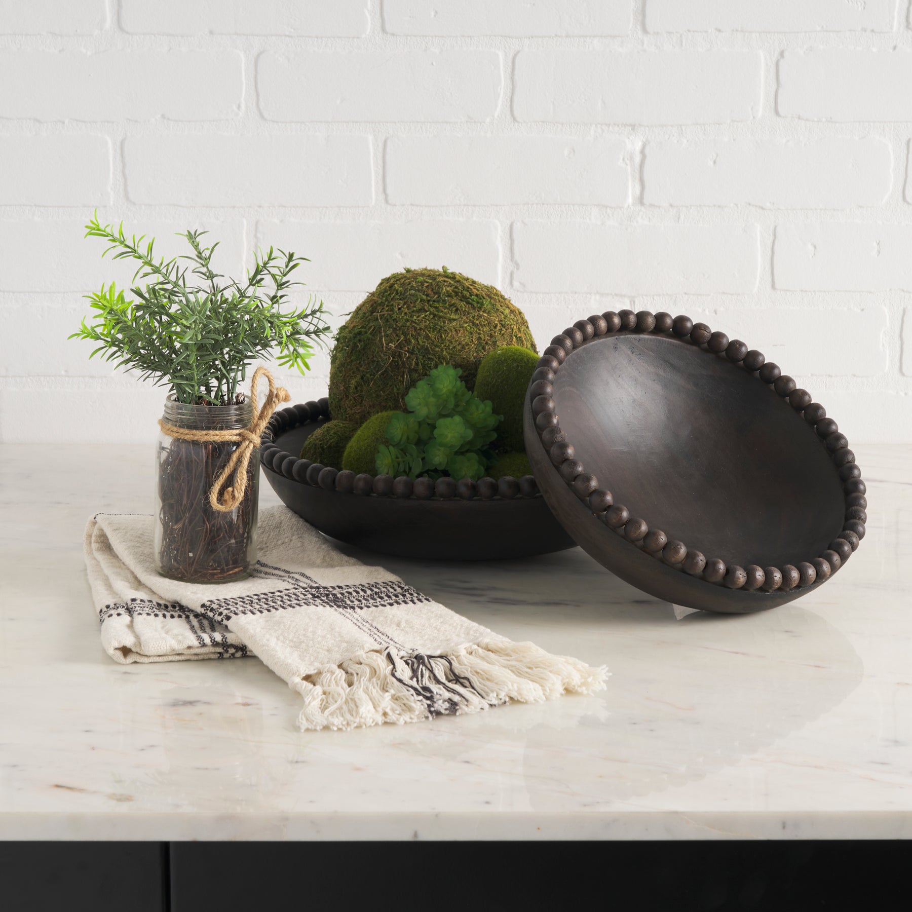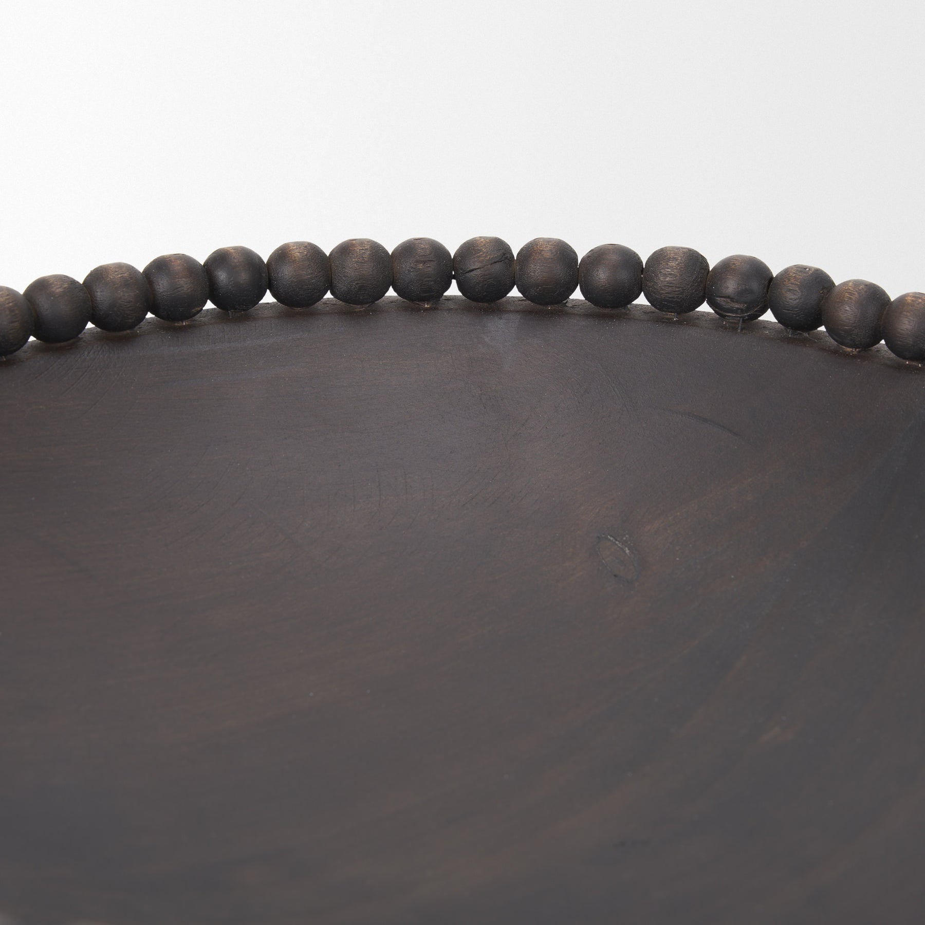 Tyra is a set of two round, solid wood bowls featuring wooden bead detailing along the rims. Available in natural light brown and rich dark brown finishes, these bowls add a warm, handcrafted touch to any space.