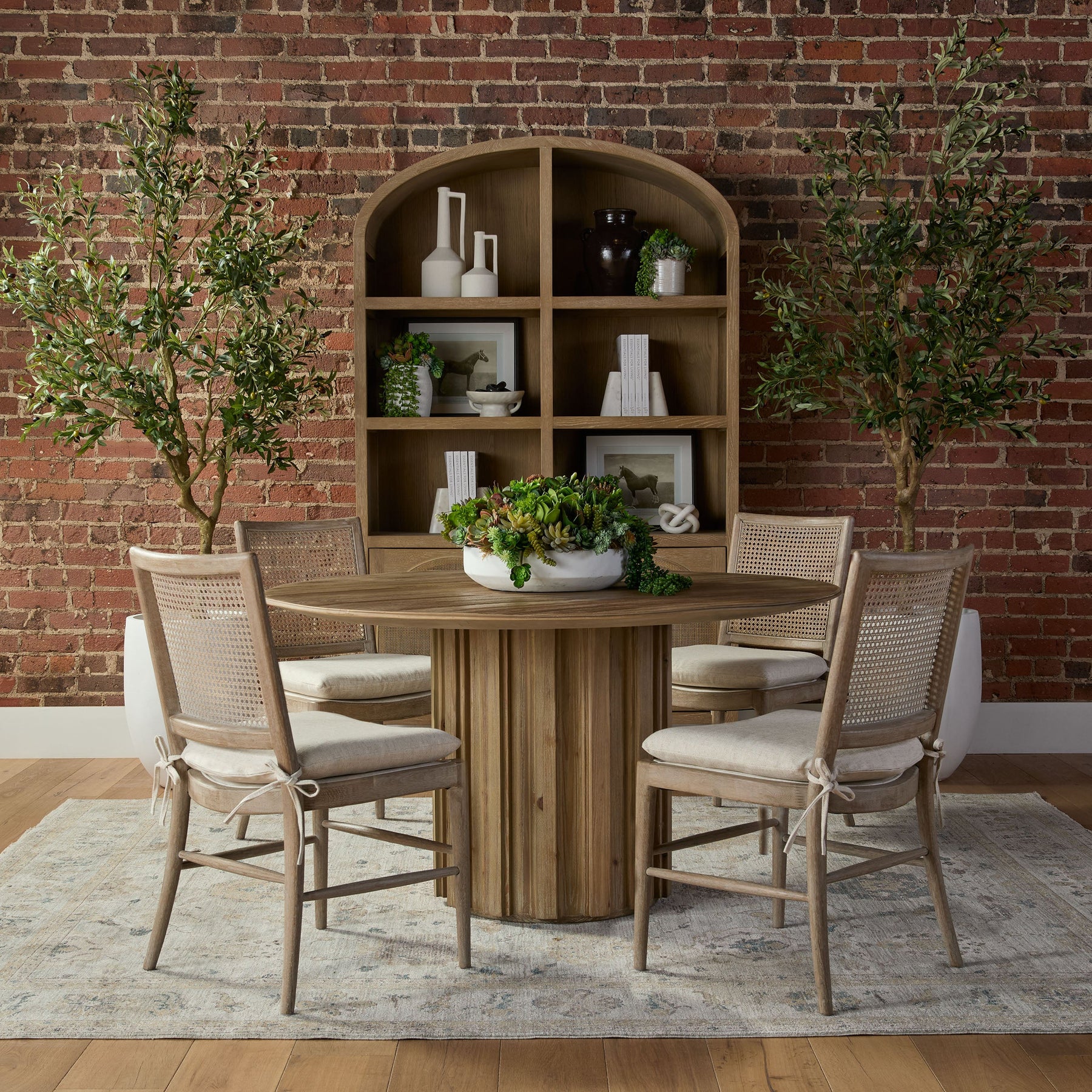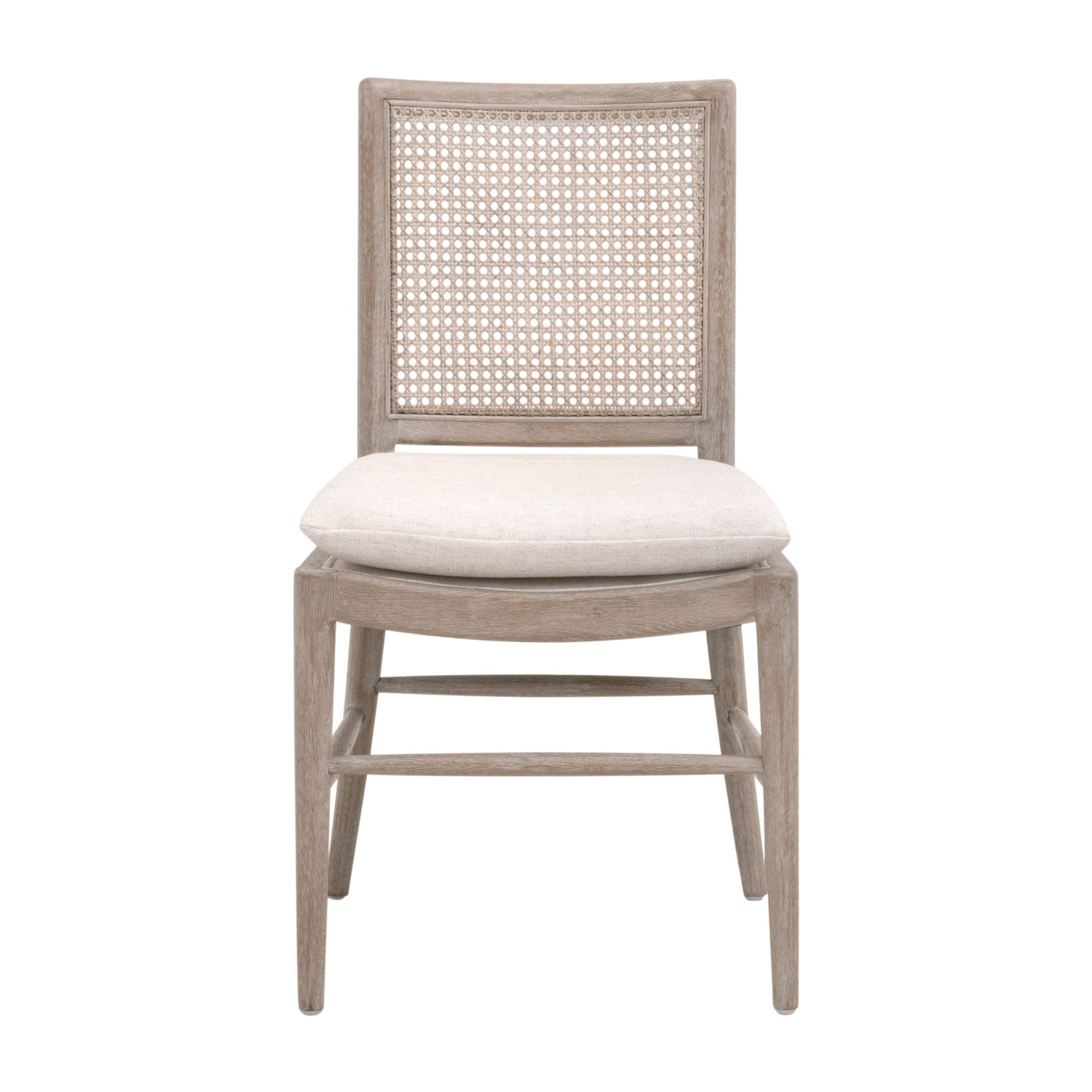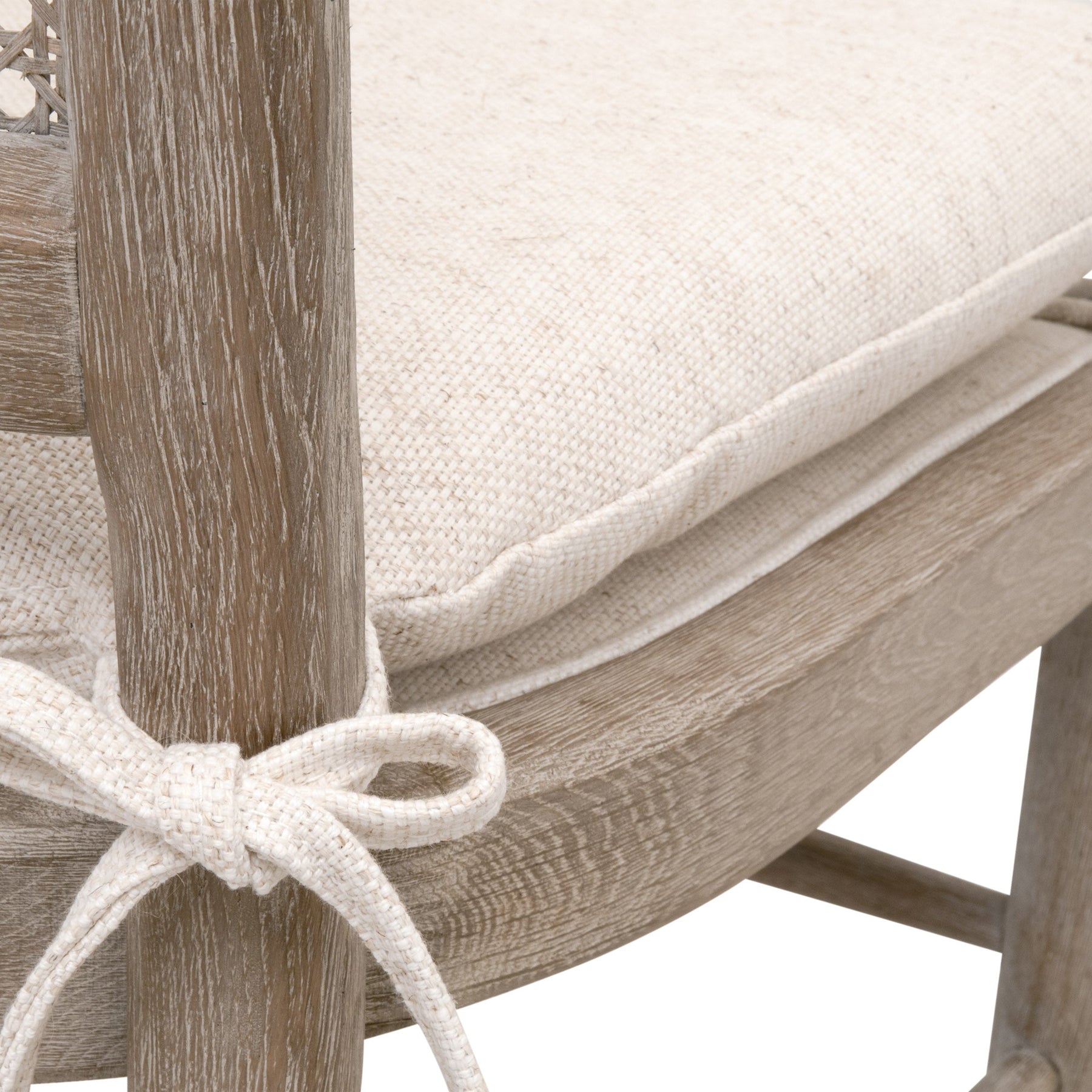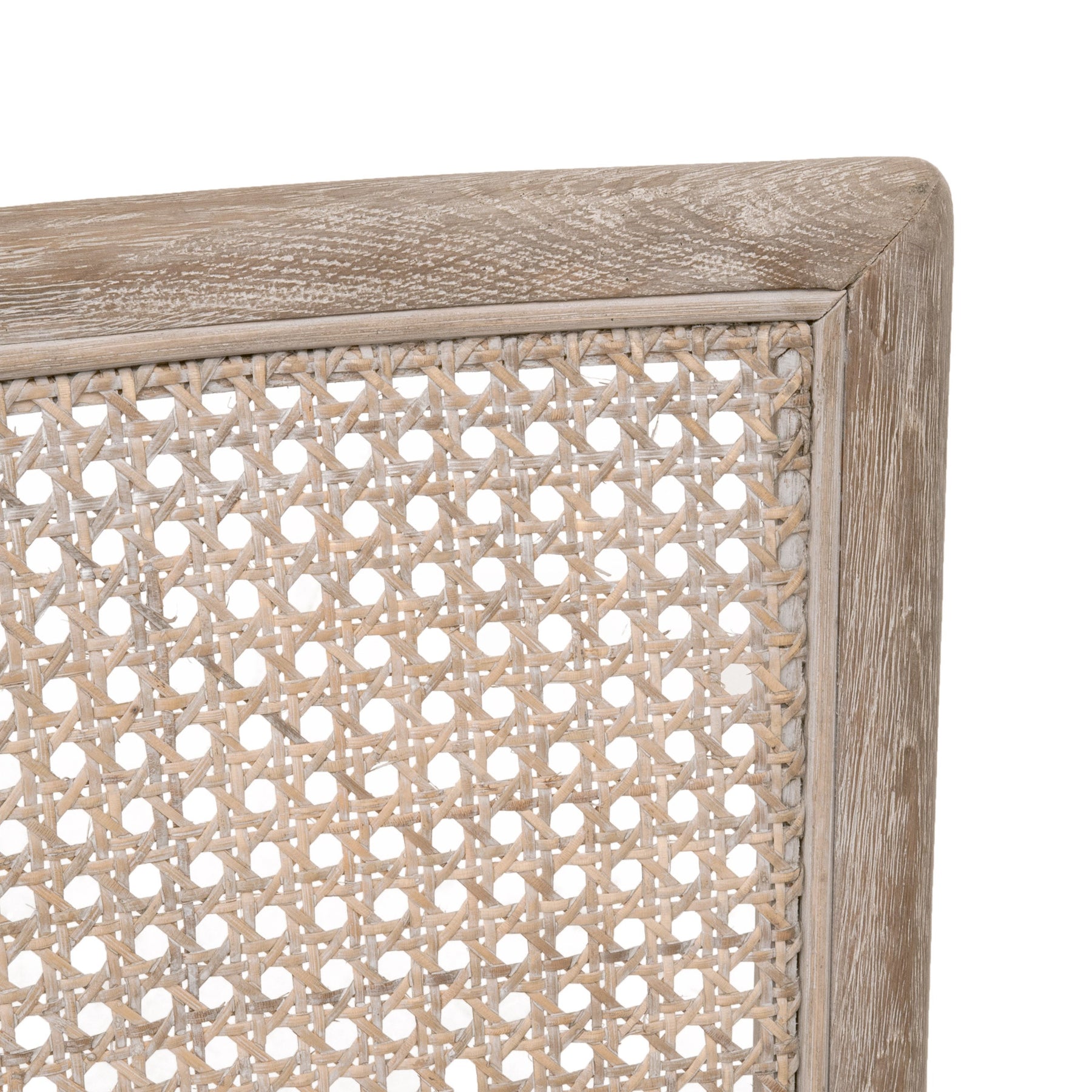 The Blake Dining Chair combines timeless style with modern design. Made from solid oak with a natural gray finish, it features a handwoven cane back and a stain-resistant cream linen seat. A removable cushion and sturdy leg stretchers complete this elegant and durable set of two.