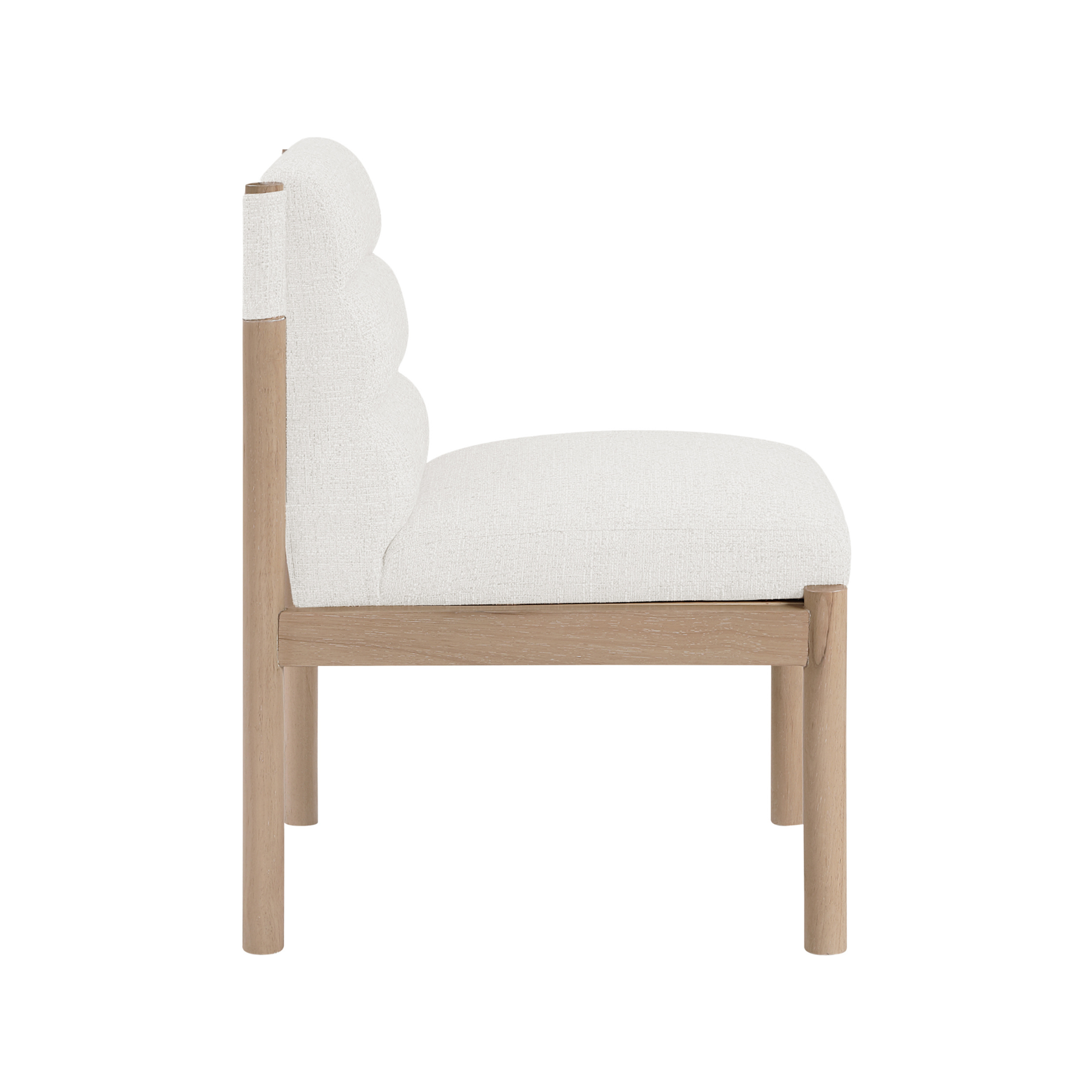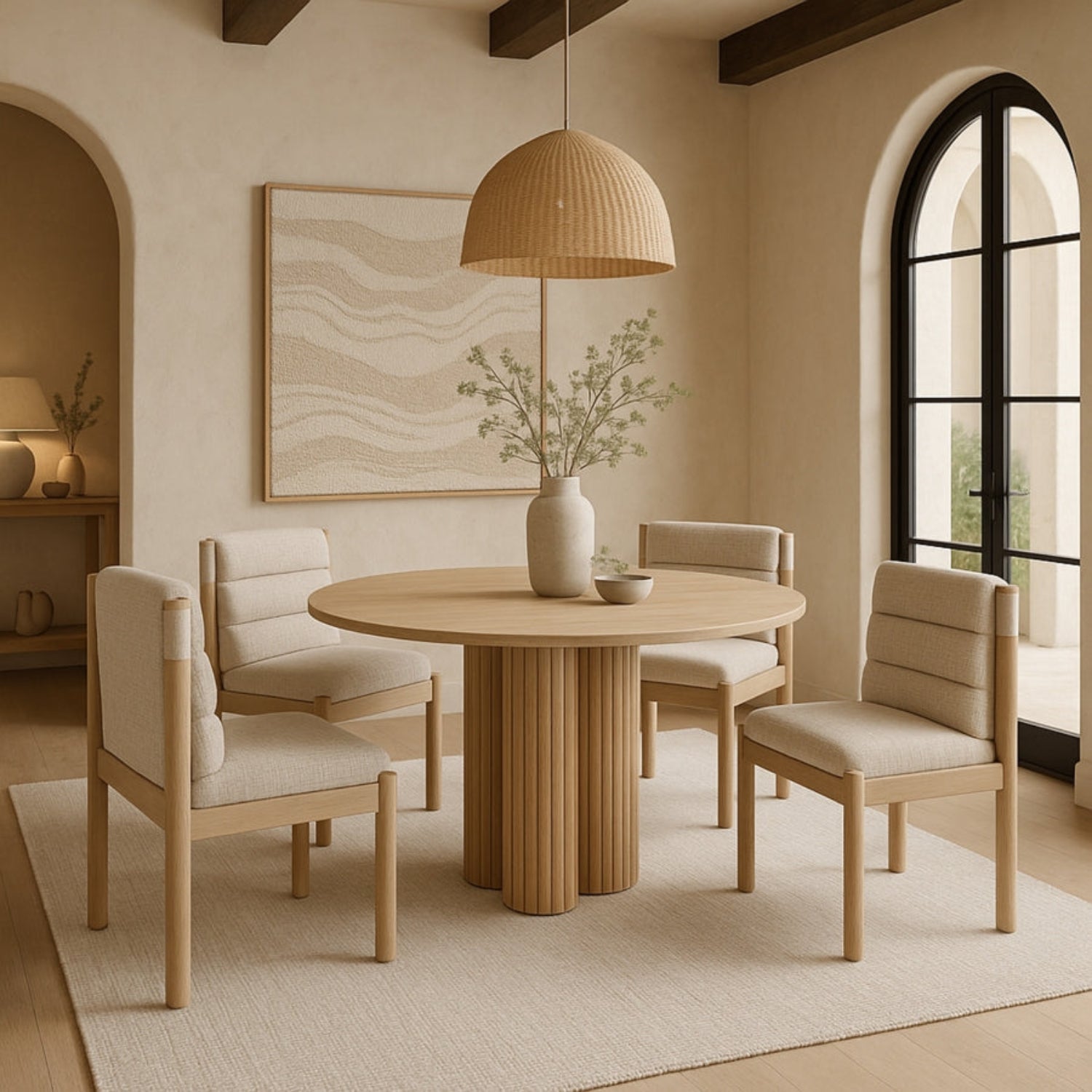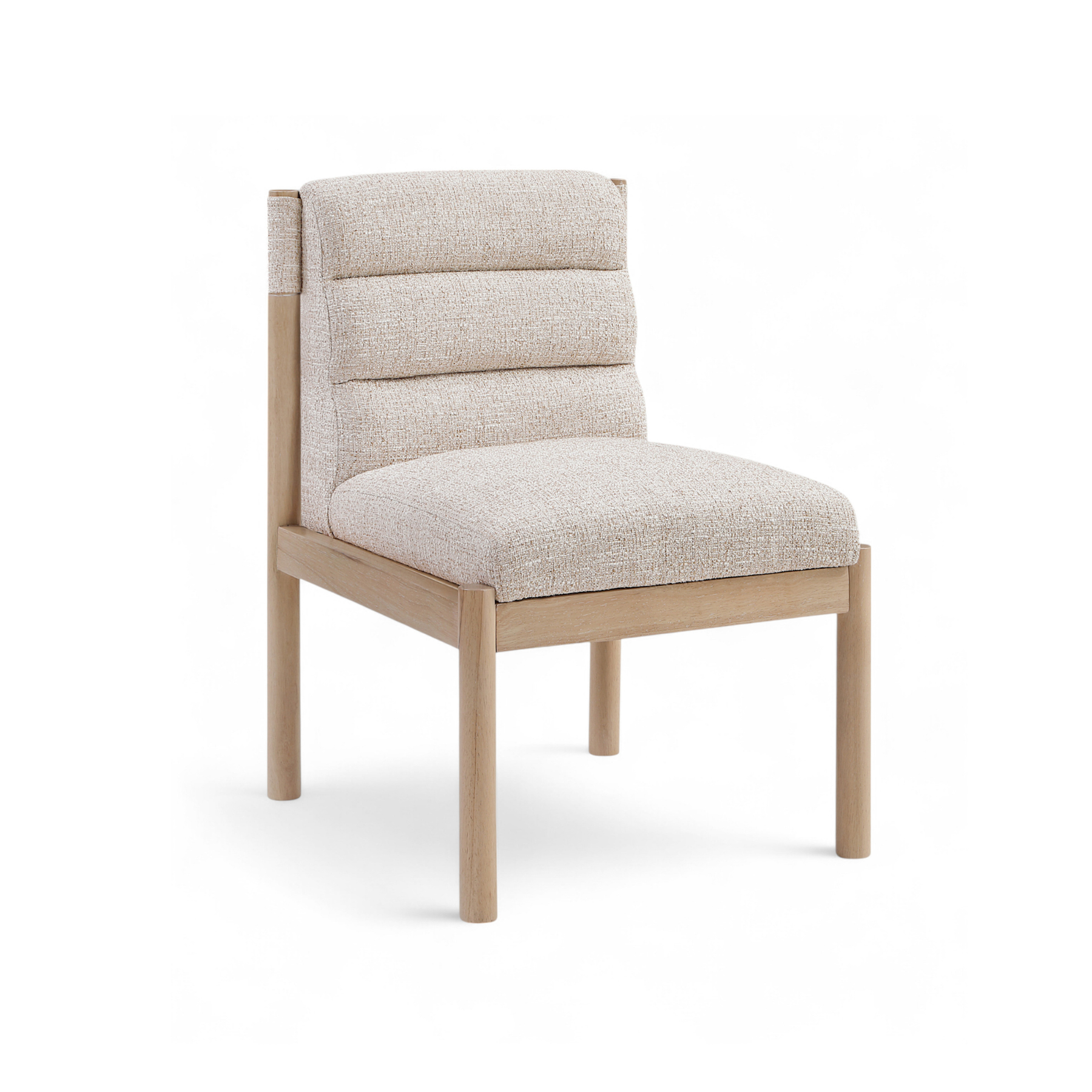 Textured and tailored, the Tavia beige linen-textured fabric upholstered dining chair brings subtle elegance to the table. Its two-tone weave adds visual depth, while the solid wood frame in a natural finish offers durability and warmth. With clean lines and Art Deco inspiration, it balances comfort with timeless style.