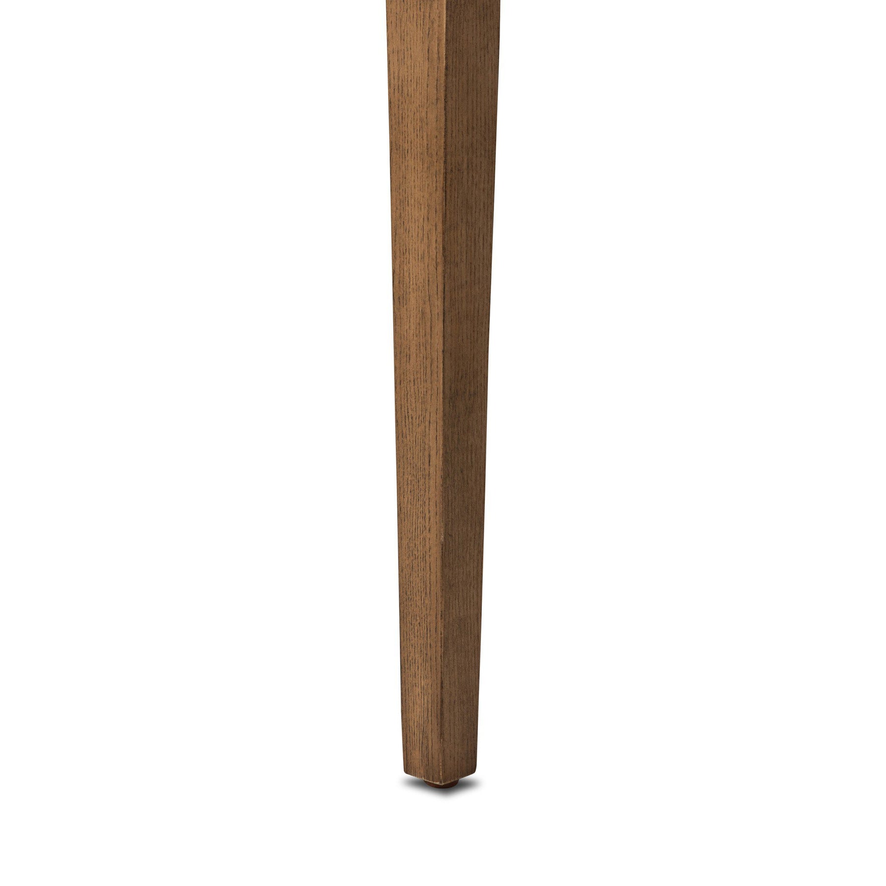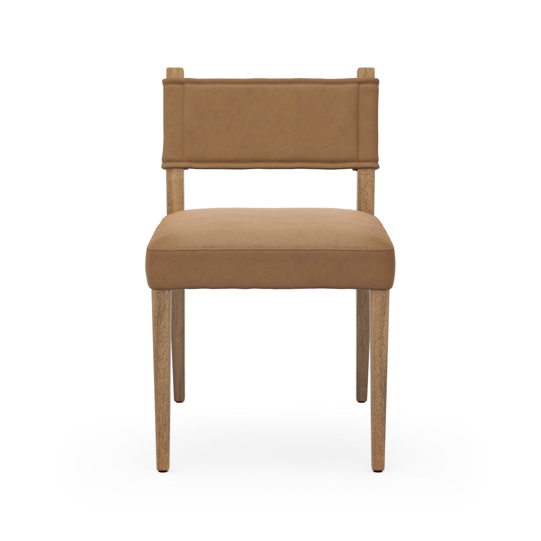 Mixed materials define this modern dining chair, combining a sleek, minimalist wood frame with clean, squared seating. Upholstered in high-performance fabric and complemented by top-grain leather accents, it offers both durability and refined style. The thoughtful blend of textures and finishes creates a versatile piece that adds a sophisticated, contemporary touch to any dining space.