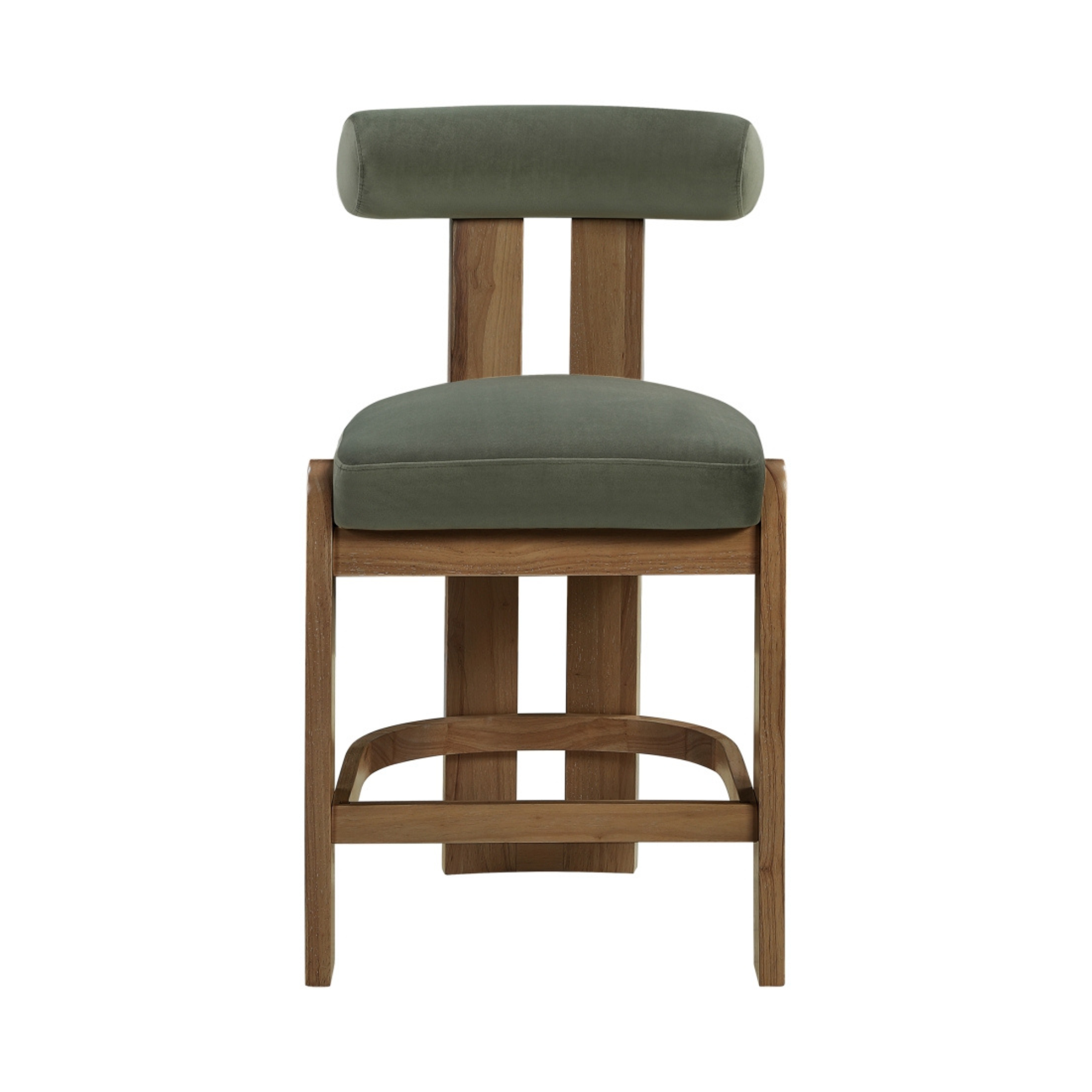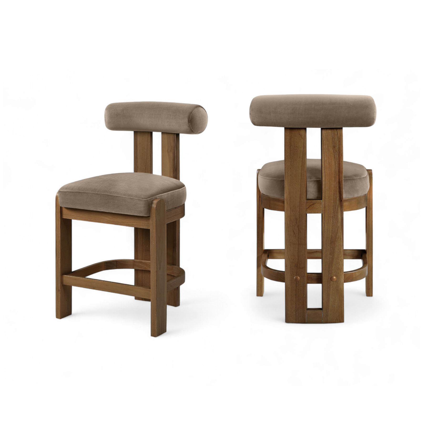 Elegant and sculptural, the Isla velvet upholstered counter stool adds Art Deco sophistication to any dining space. Its ultra-luxe velvet upholstery pairs beautifully with walnut-finished solid wood legs for warmth and stability. With its distinctive rounded backrest, this stool blends comfort with timeless style.