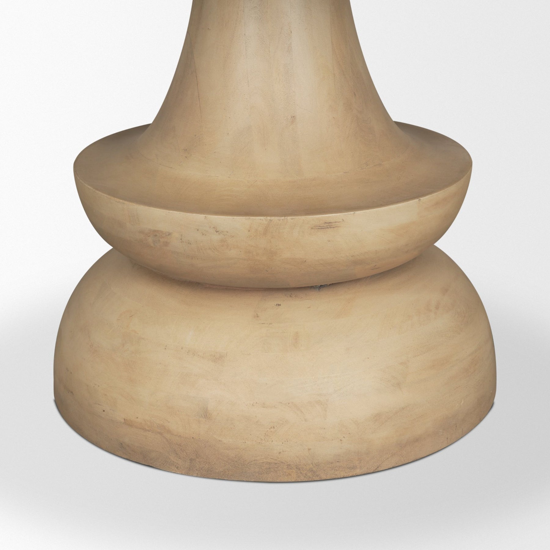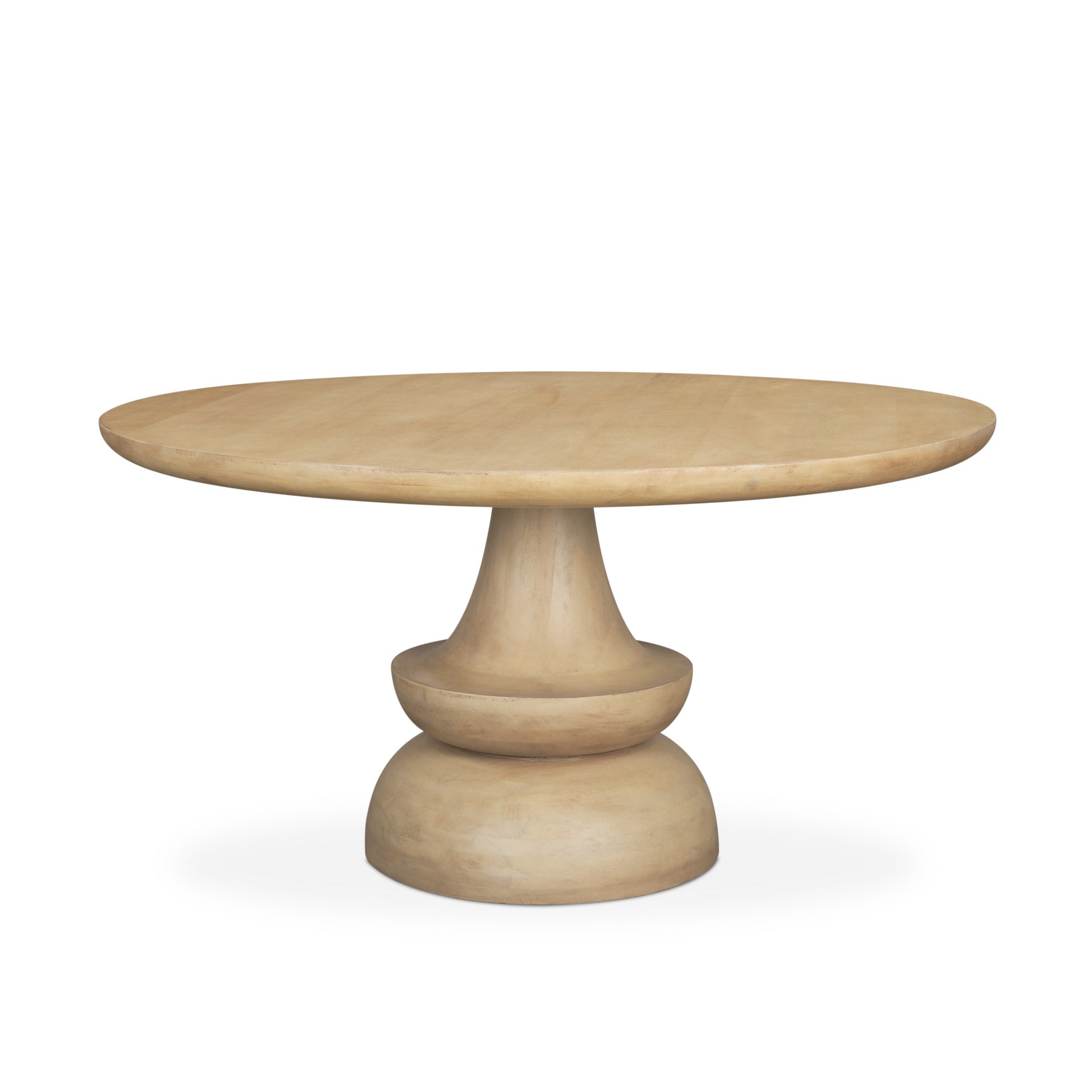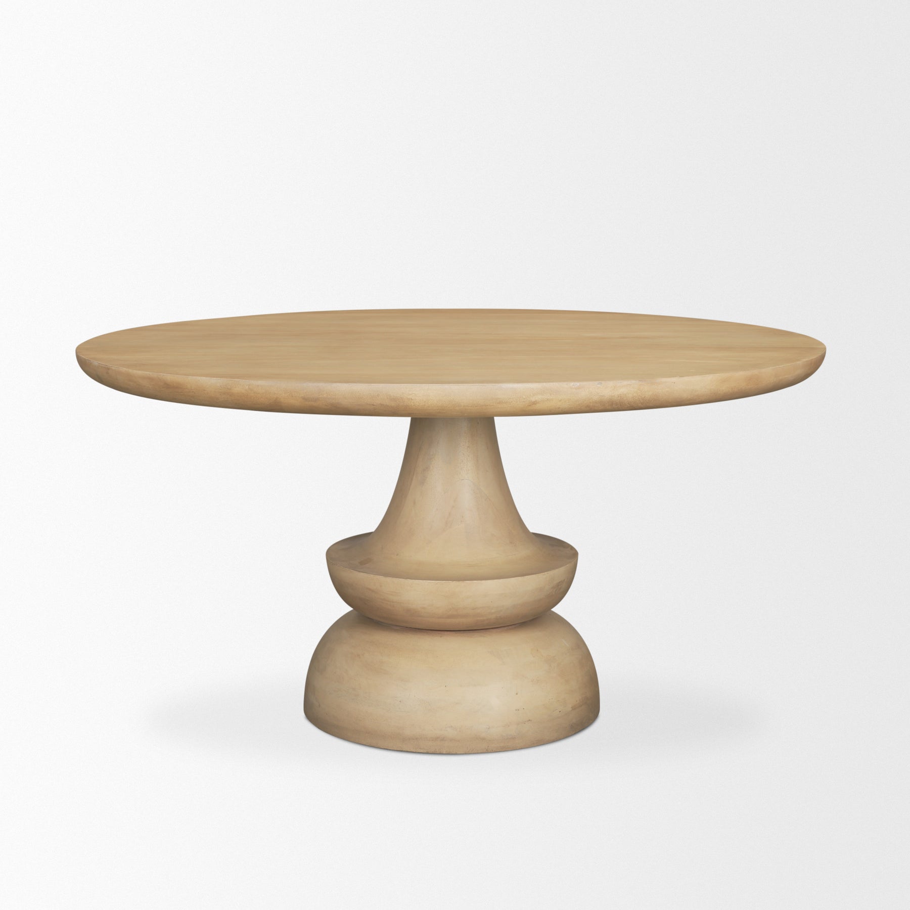 The Camryn, a handcrafted dining table made from high-quality Indian hardwood, flaunts a sleek top that is circular in shape. The top is supported by an inverse pedestal mounted on a semi-spherical base that has a ritzy look to it. It is polished in a blonde tone with a natural wooden texture to it. Designed to seat four, the Camryn dining table is a great choice that aligns with modern design styles.