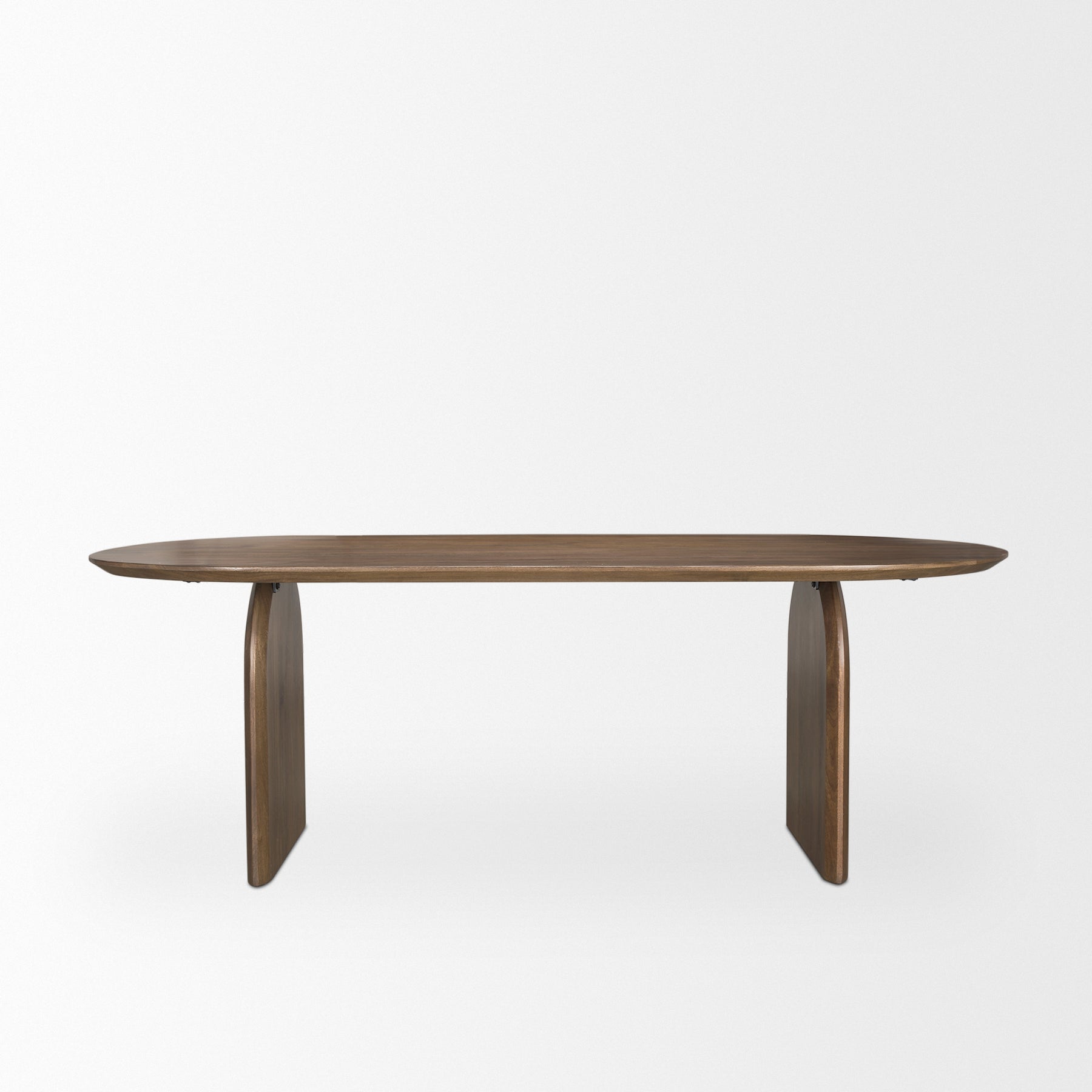 The Isla Dining Table is made of solid mango wood in a rich dark brown finish with an oval tabletop and two arched legs.