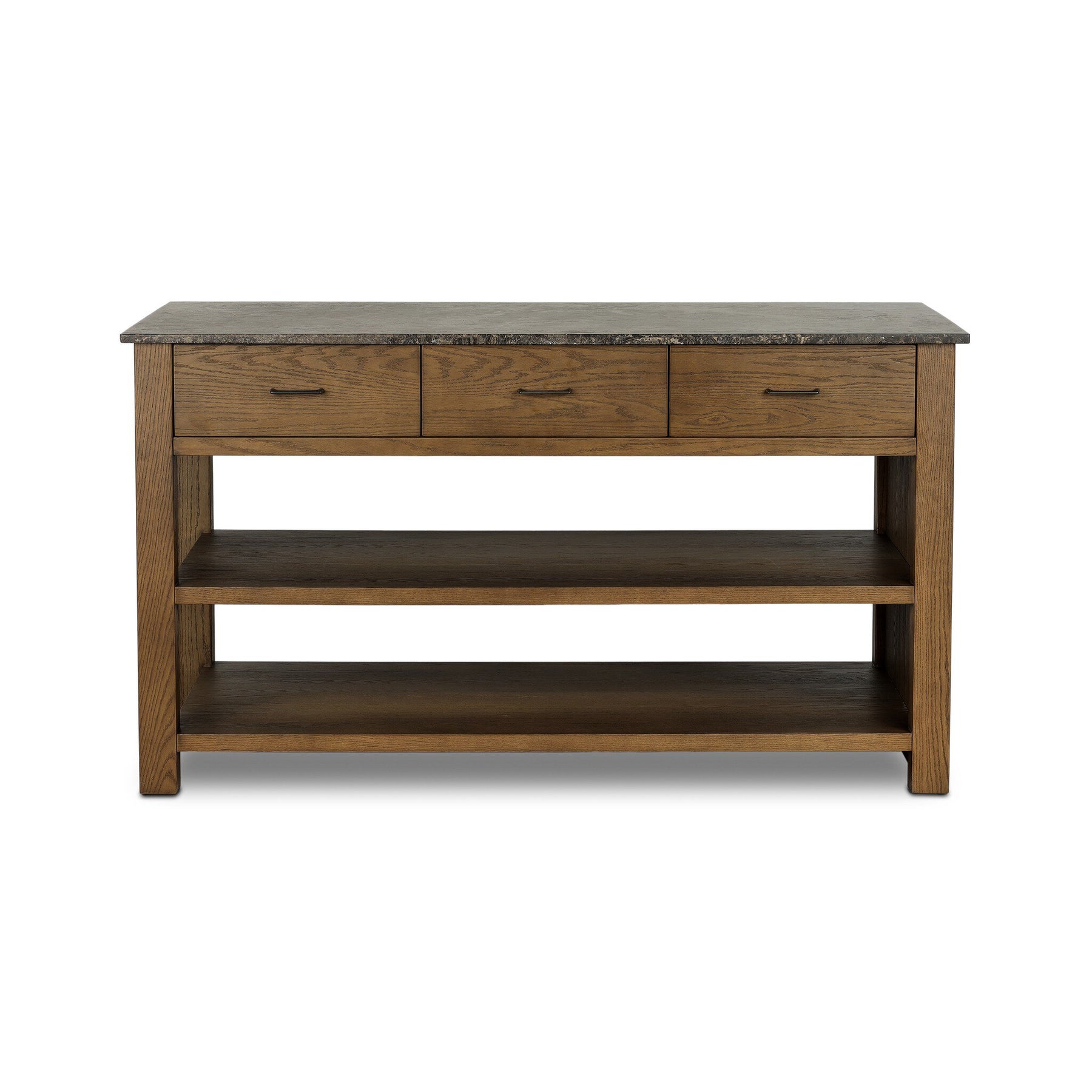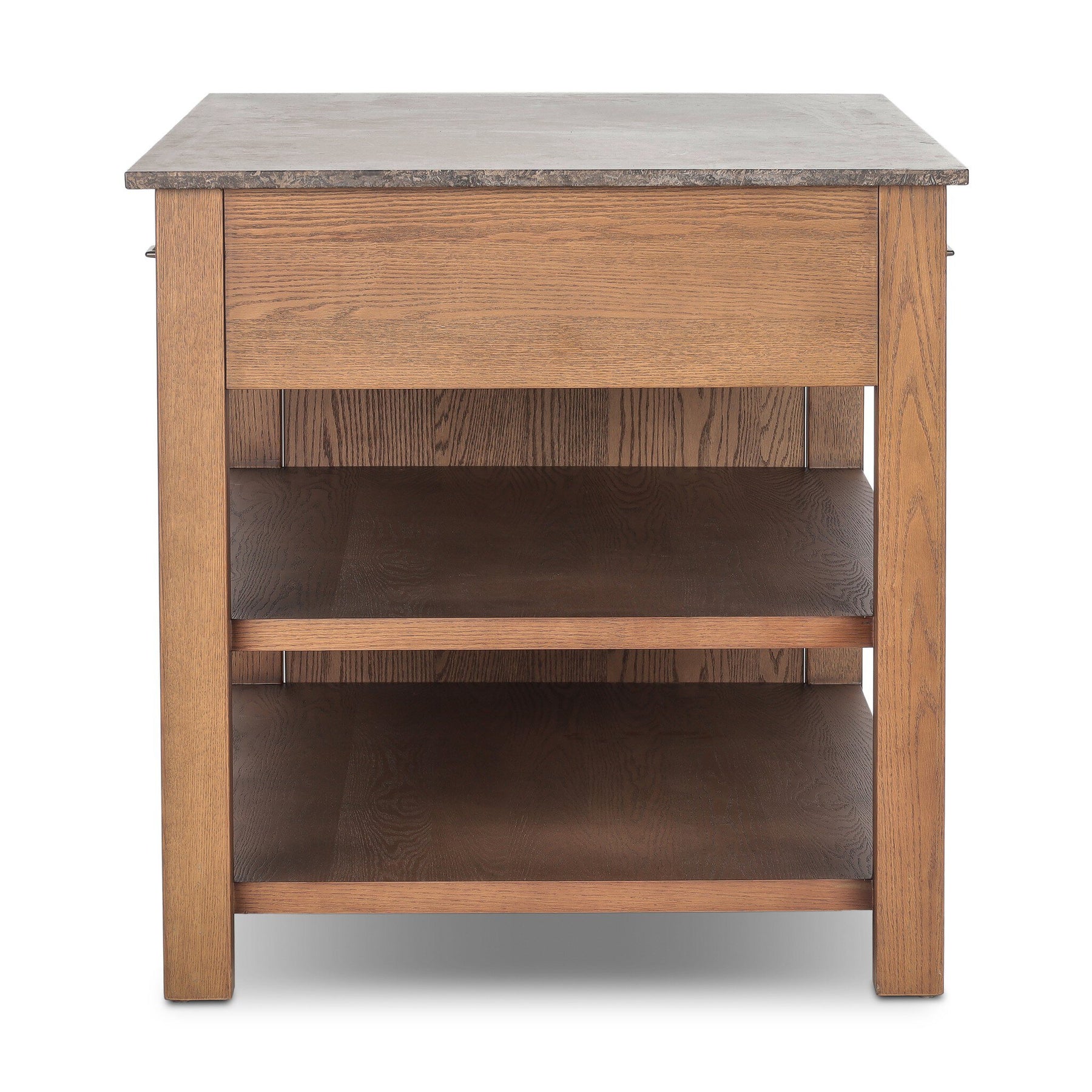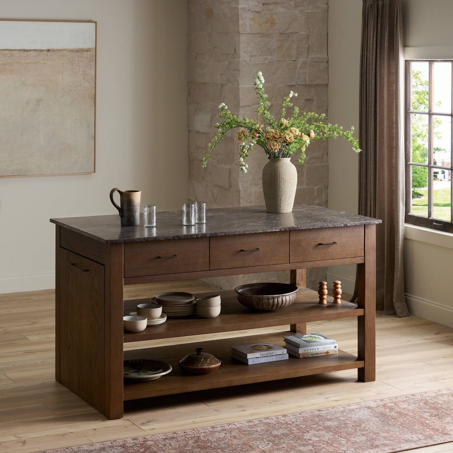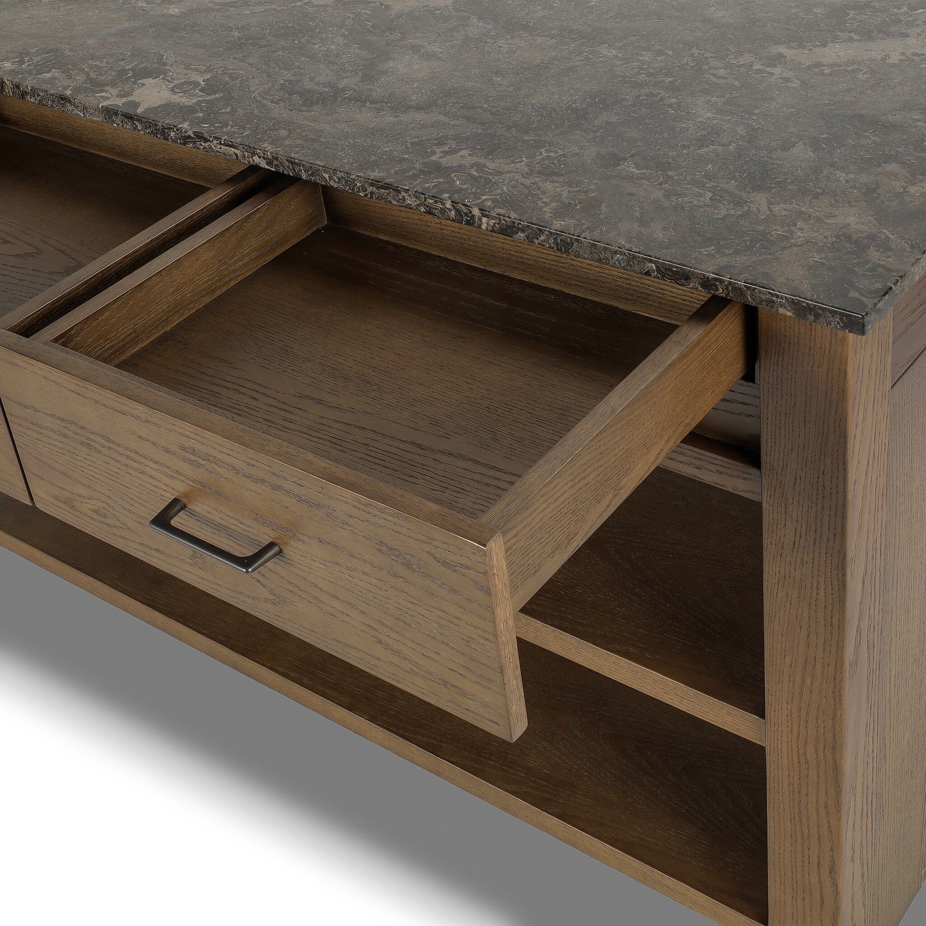 A kitchen island and waterfall dining table in one. Crafted from oak, the island system features two large shelves and three drawers on each side, all topped with by warm grey marble. The pullout table extends and fits inside the frame with ease.