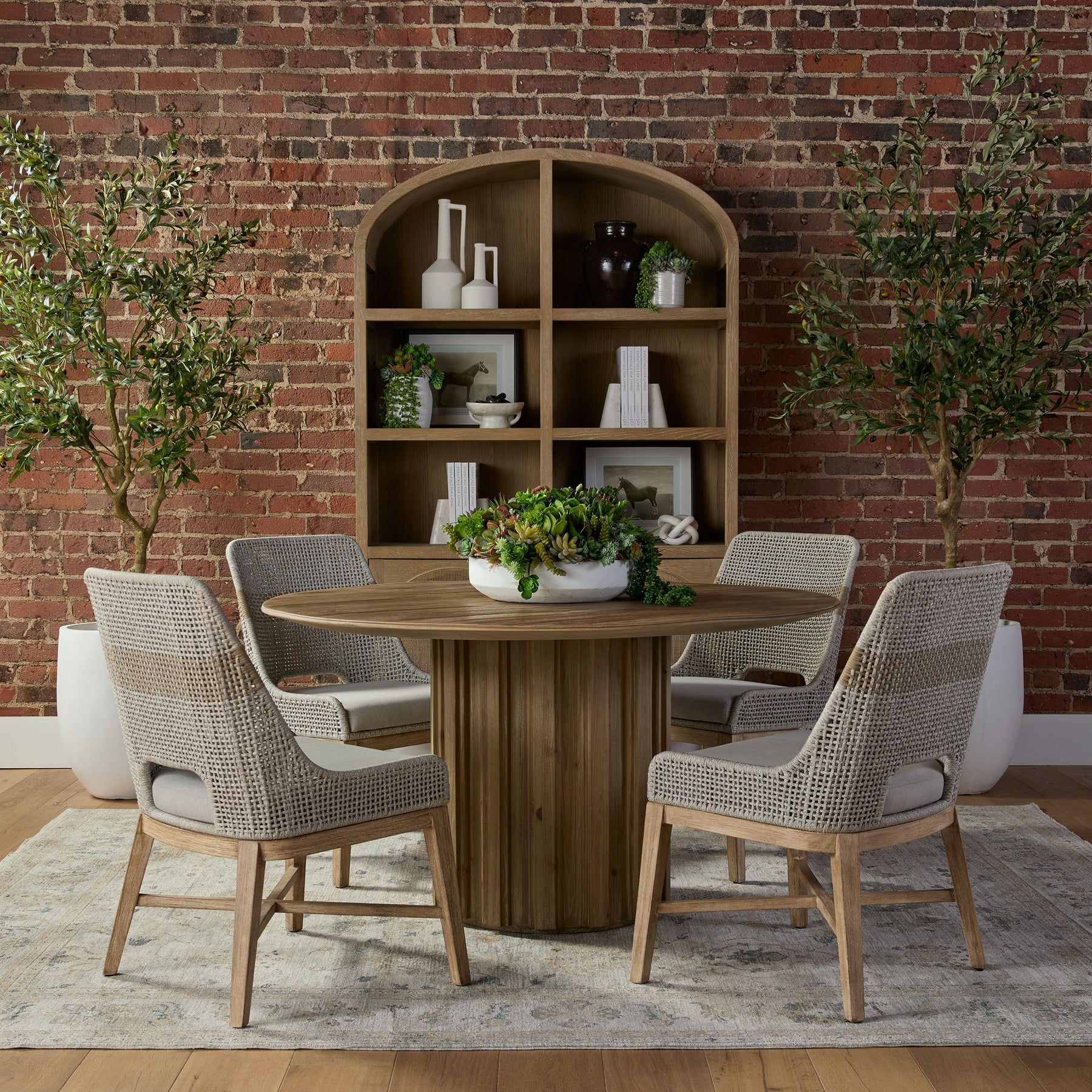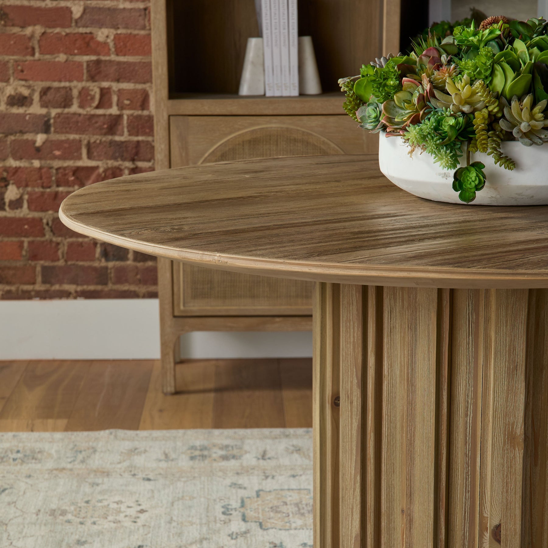 The Ronin Dining Table blends timeless style and eco-friendly design with pine veneer and reclaimed pine wood. Its smoke gray finish adds warmth, while the round plank veneer top and angled edge enhance its charm. The pedestal base with decorative fluting ensures stability and elegance. Designed to seat four comfortably, this table showcases natural wood variations that highlight its unique character. Ideal for refined dining spaces, it combines rustic beauty with lasting durability.