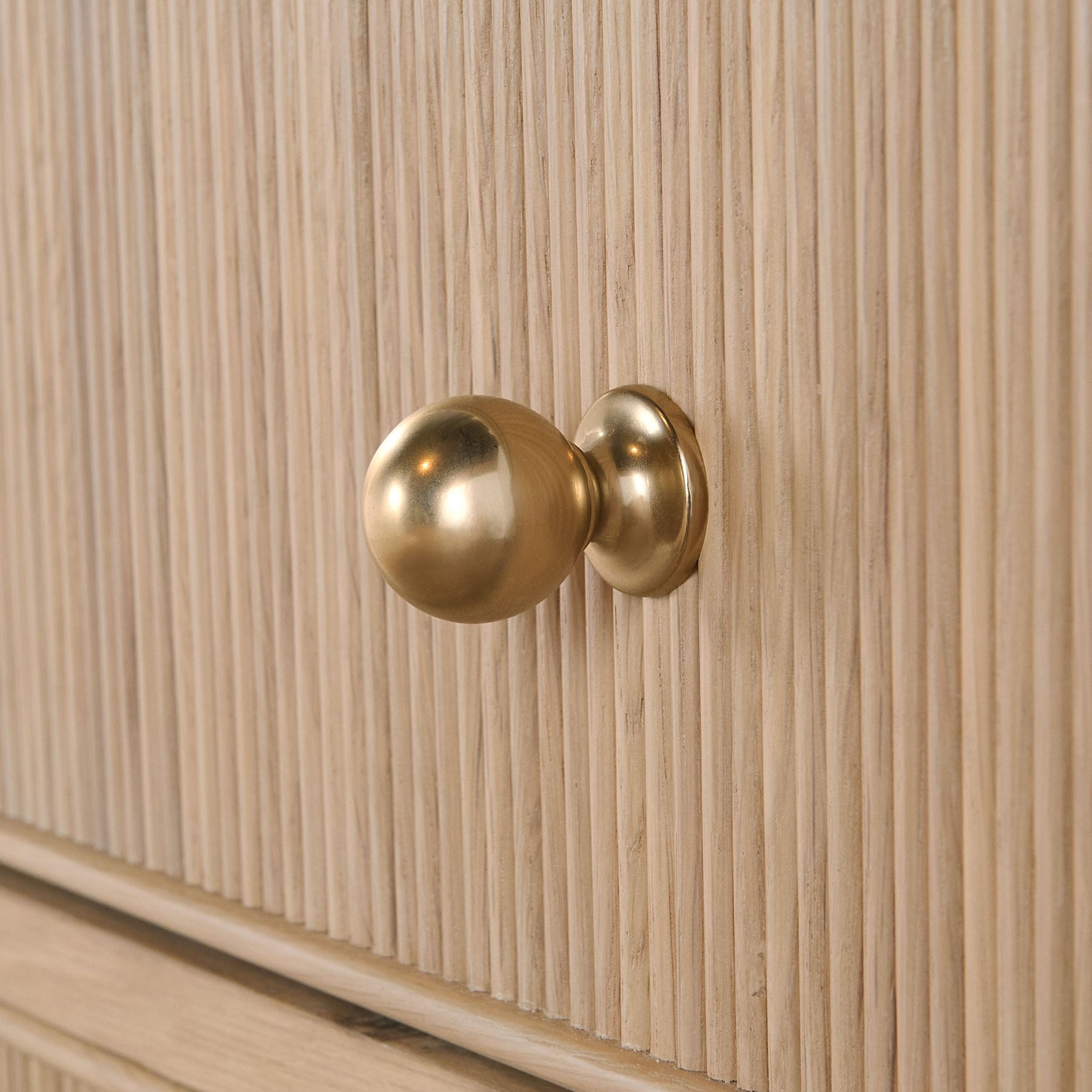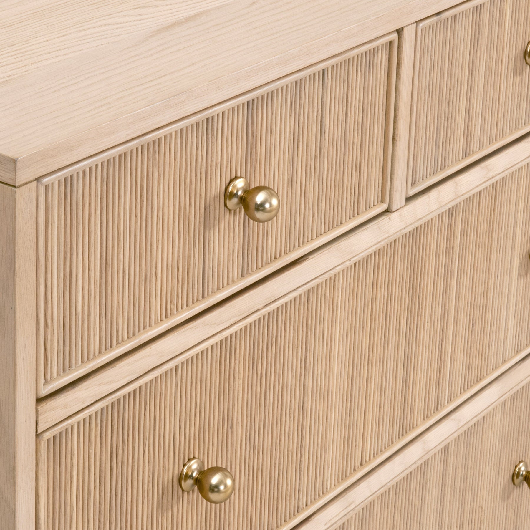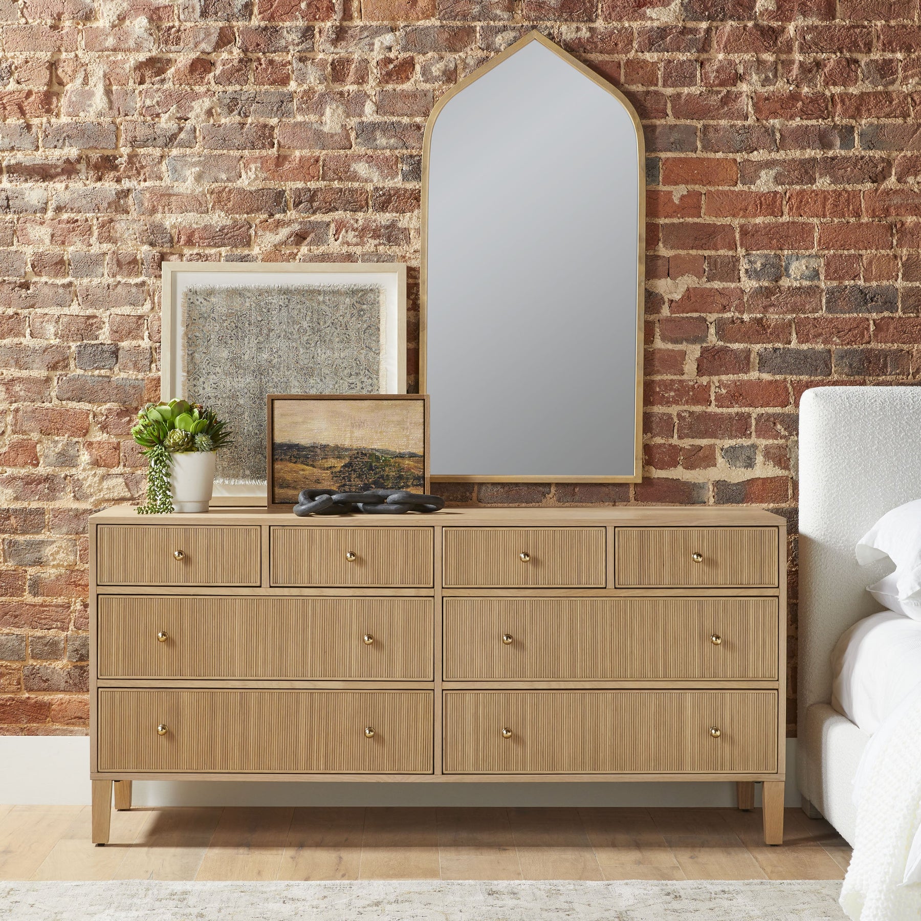 The Highland 8-Drawer Double Dresser combines unique style and functionality. This extraordinary piece is crafted from solid oak wood and oak veneer with a natural oak finish. This soft and neutral finish has beautiful wood grain on the outer casing, while the fluted wood drawer fronts add character and dimension. The drawer knobs are made of solid iron with a brushed brass finish, adding both simplicity and elegance. This dresser provides ample storage with eight drawers, including felt-lined top drawers for your delicate items. The dual metal drawer glides ensure easy operation as well. Redefine your bedroom or guest room with this eye-catching dresser built to flatter many interior styles.