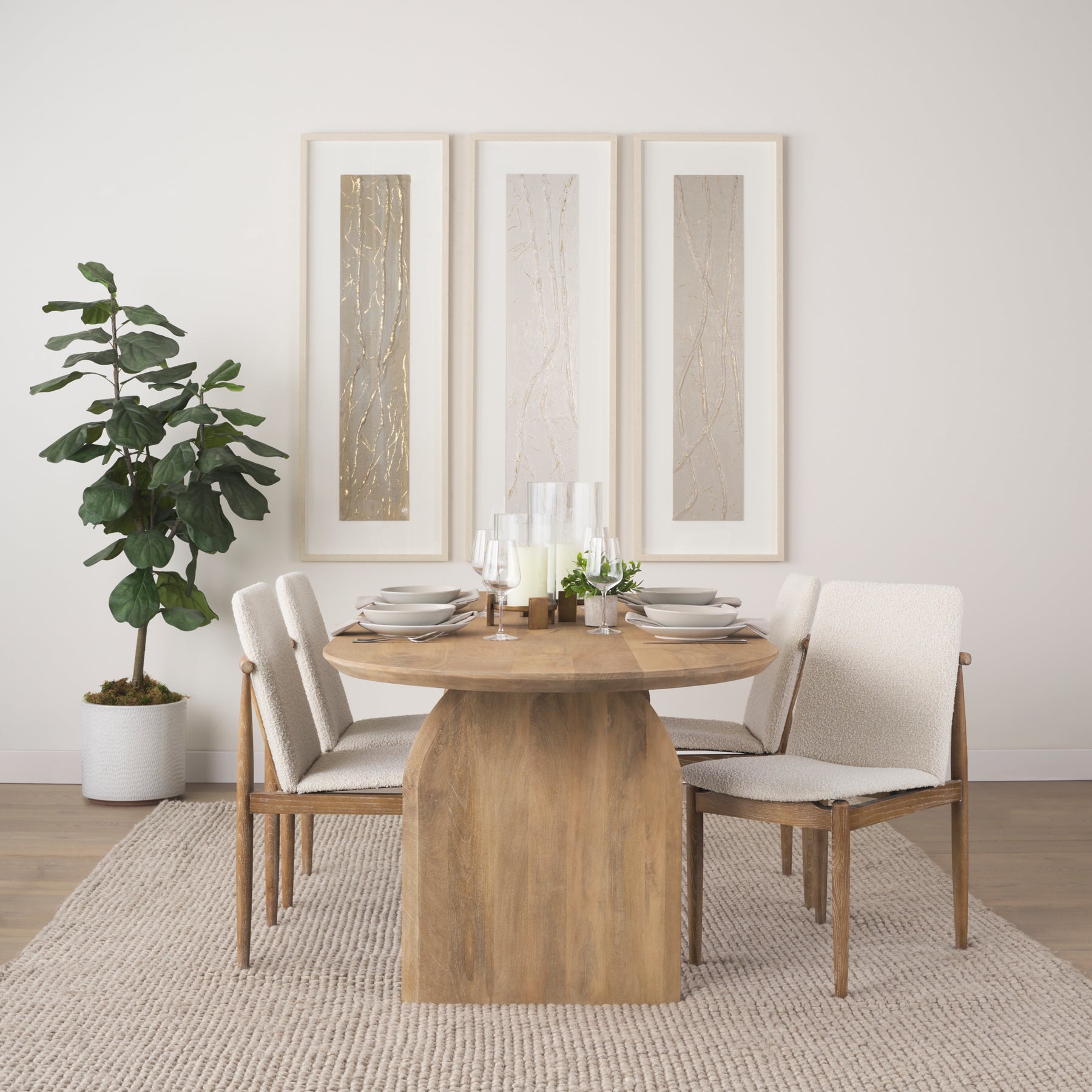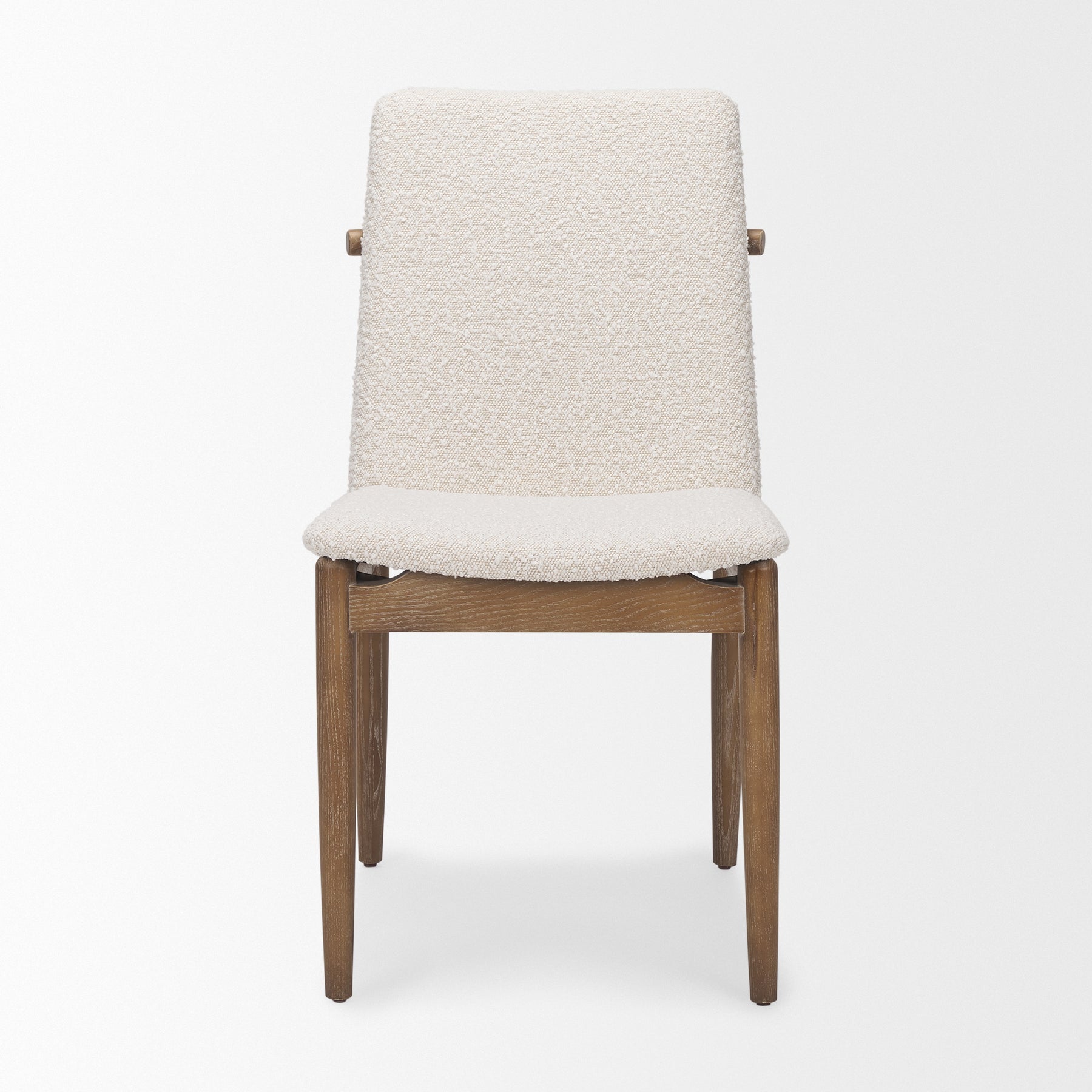 This dining chair captures coastal elegance with its solid wood construction, bouclé upholstery, and a refined whitewash finish, adding a touch of sophistication to any dining space.
