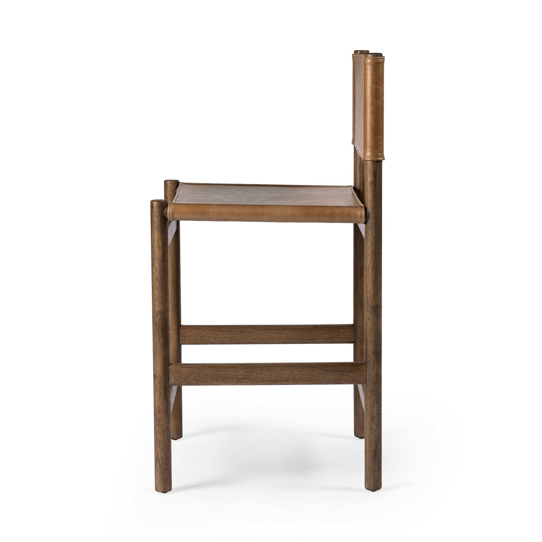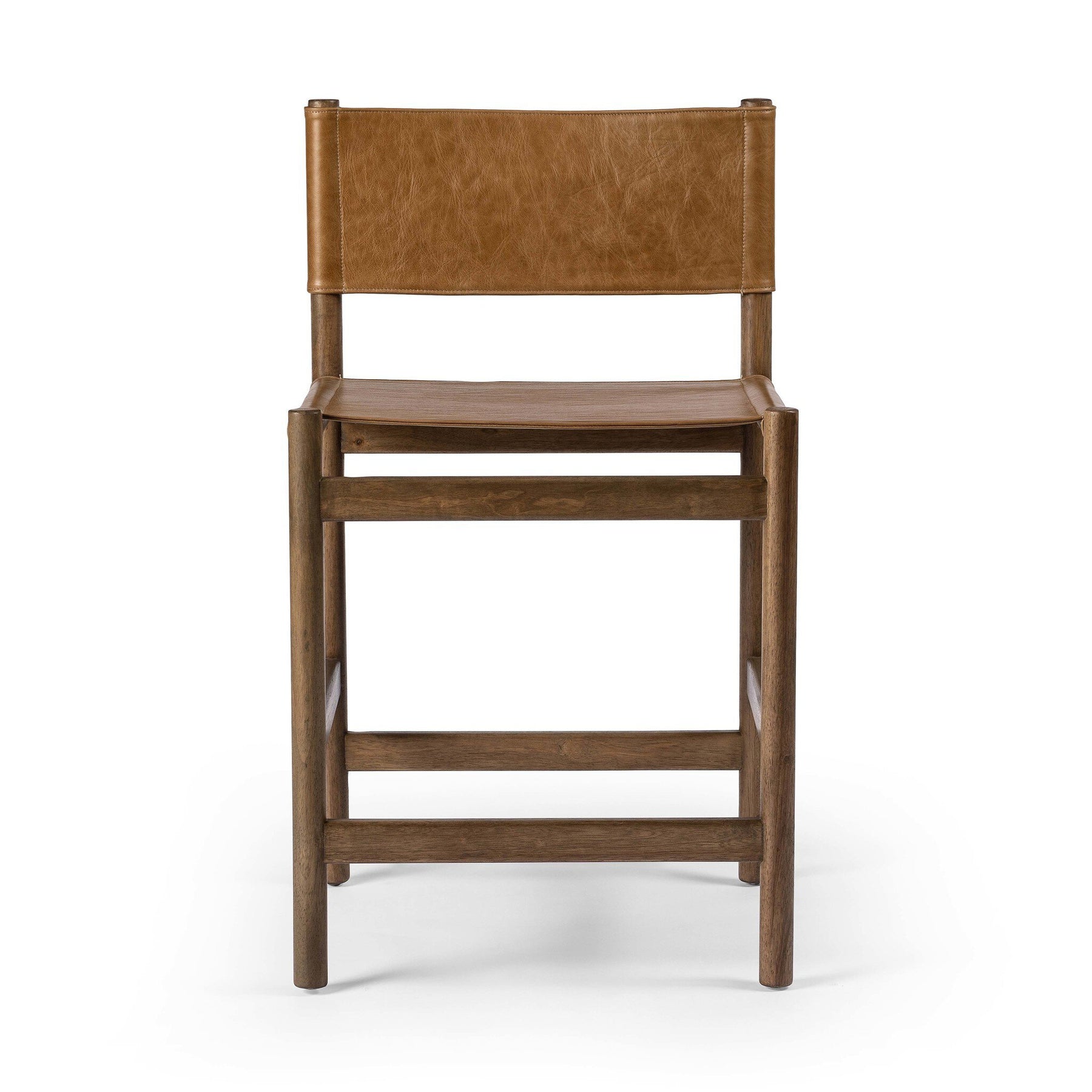 Solid parawood forms a simple, vintage-inspired frame for sling-style seating of butterscotch or black top-grain leather. Perfectly sized for the counter / bar.
