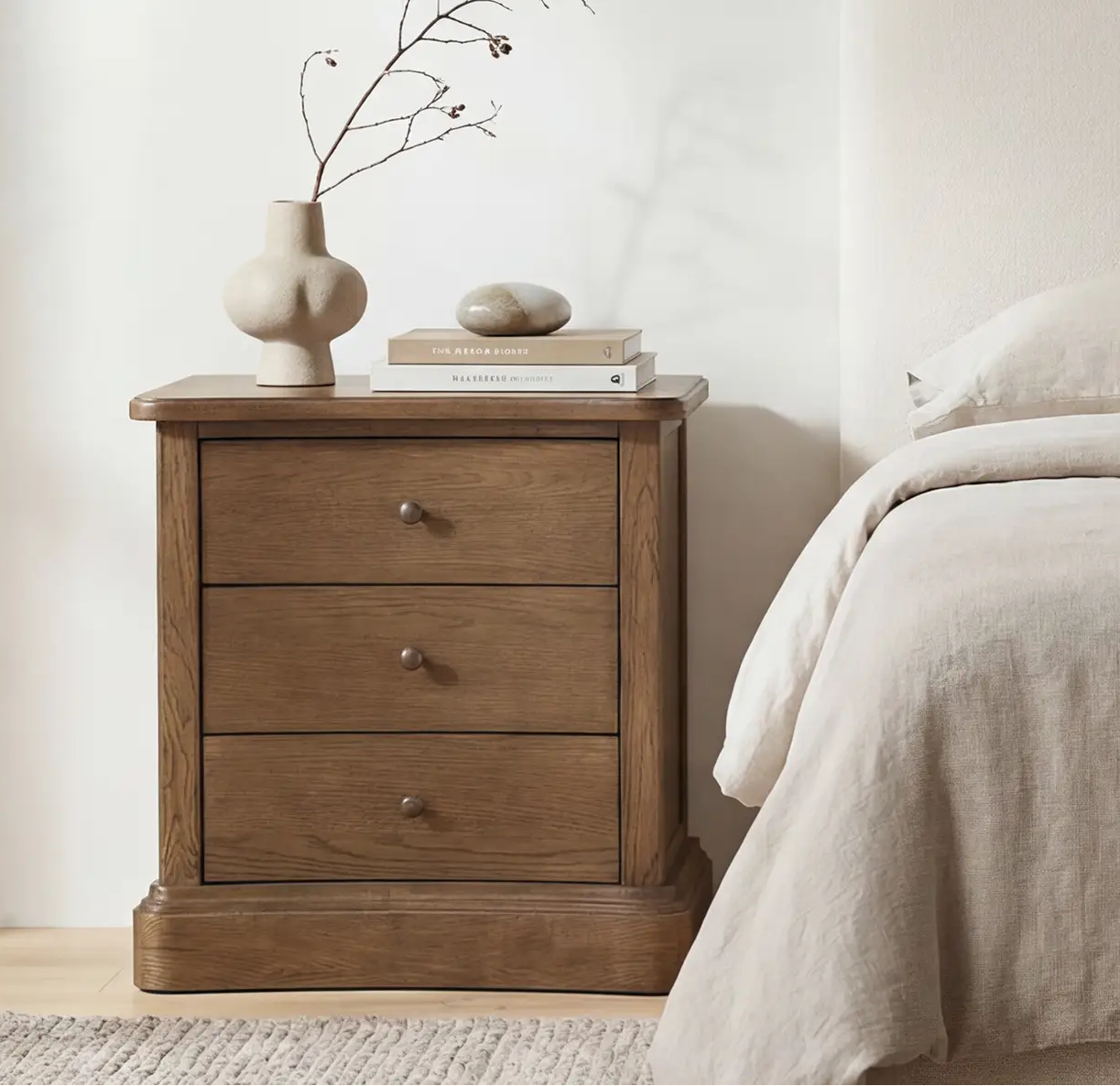 One curve, three drawers, and plenty of personality—Clare keeps it classic with added character, featuring a curved front that brings movement to its silhouette, a sculpted base that adds quiet presence, and three functional drawers with brass hardware for a subtle shine, all crafted from solid oak for a timeless piece that fits seamlessly into modern living.