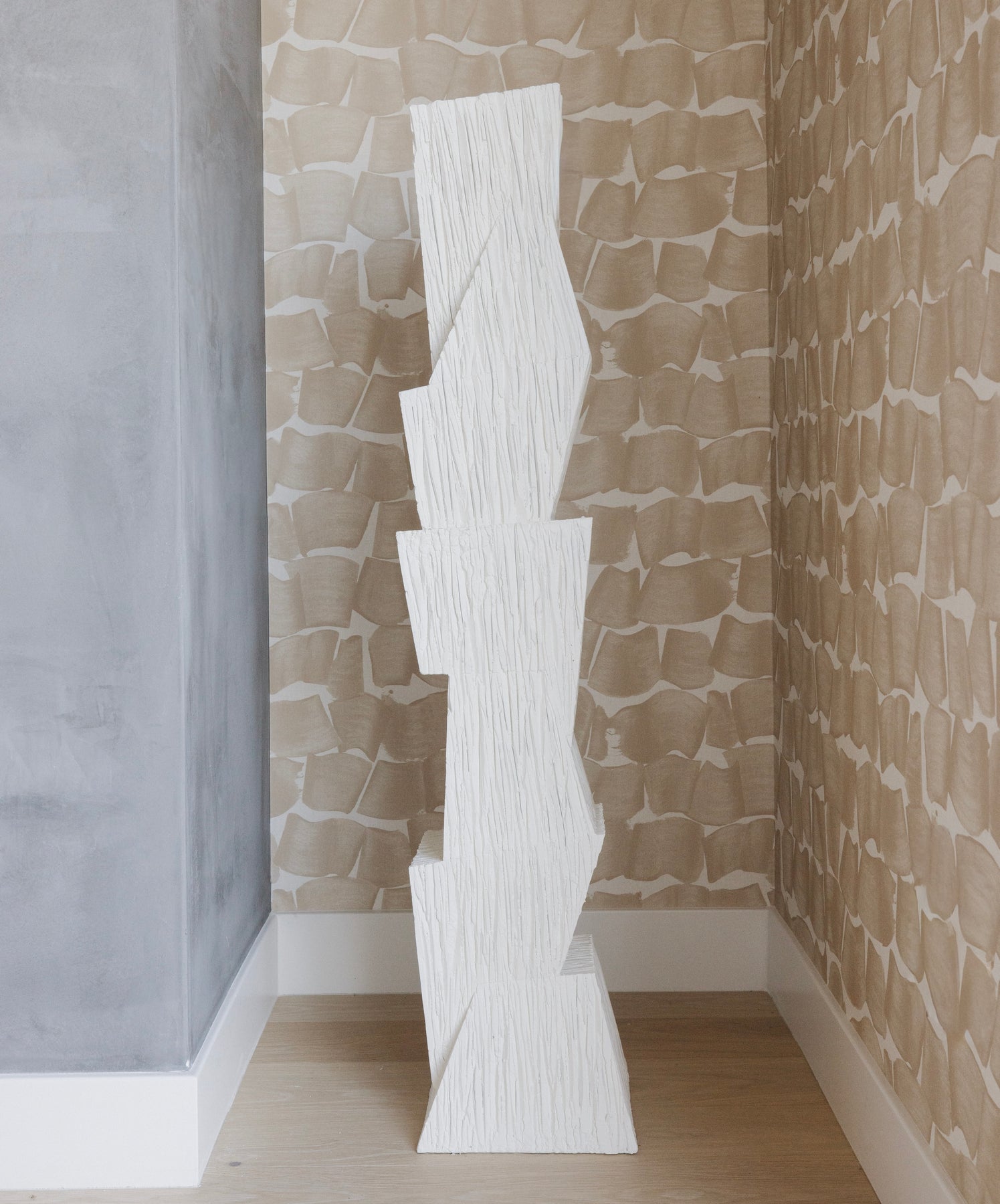 A totem of matte white resin is a commanding accent piece for any corner of the room. Designed to draw the eye to its geometric form, a faux wood finish adds a dynamic accent to the texture on its vertical surface. Finish will vary.