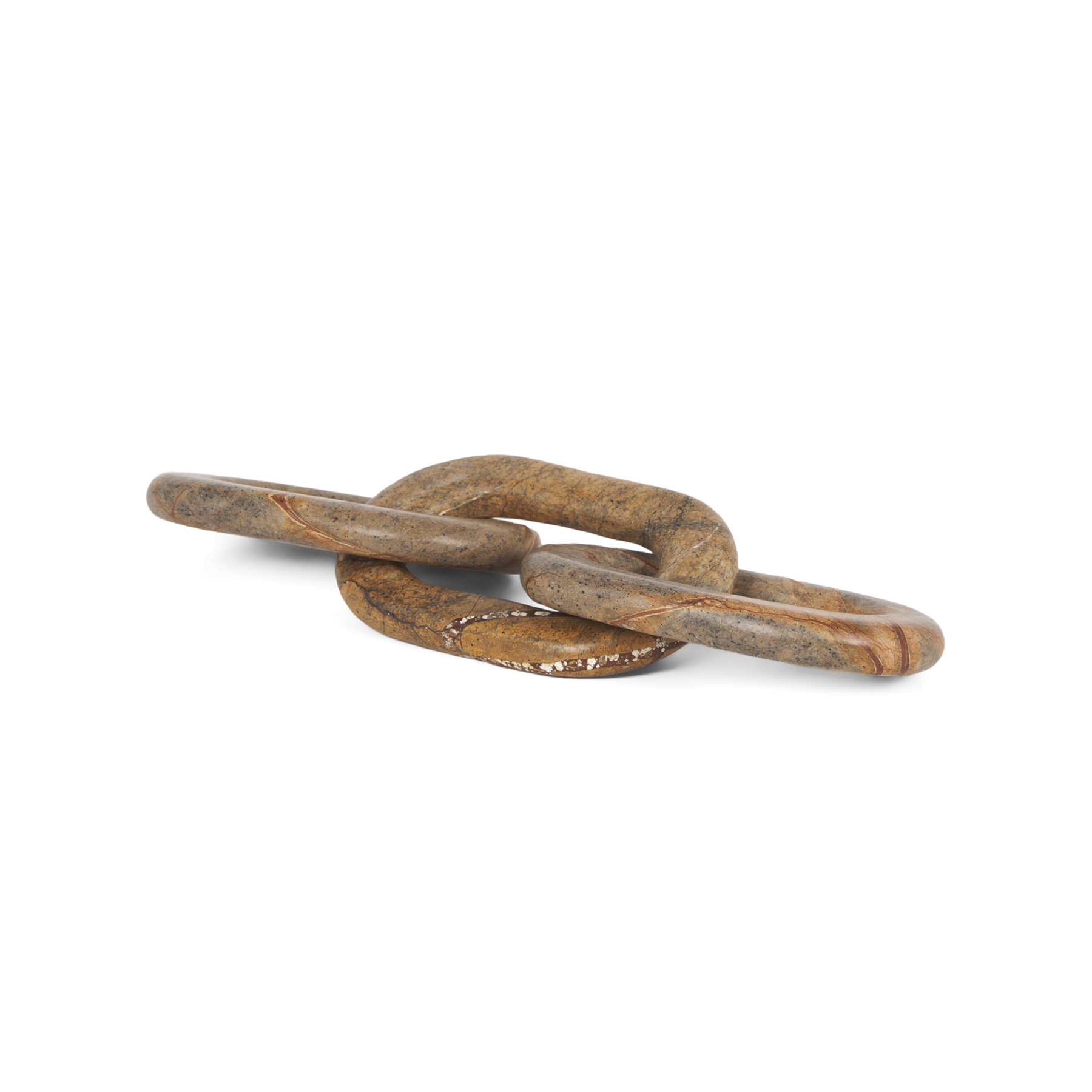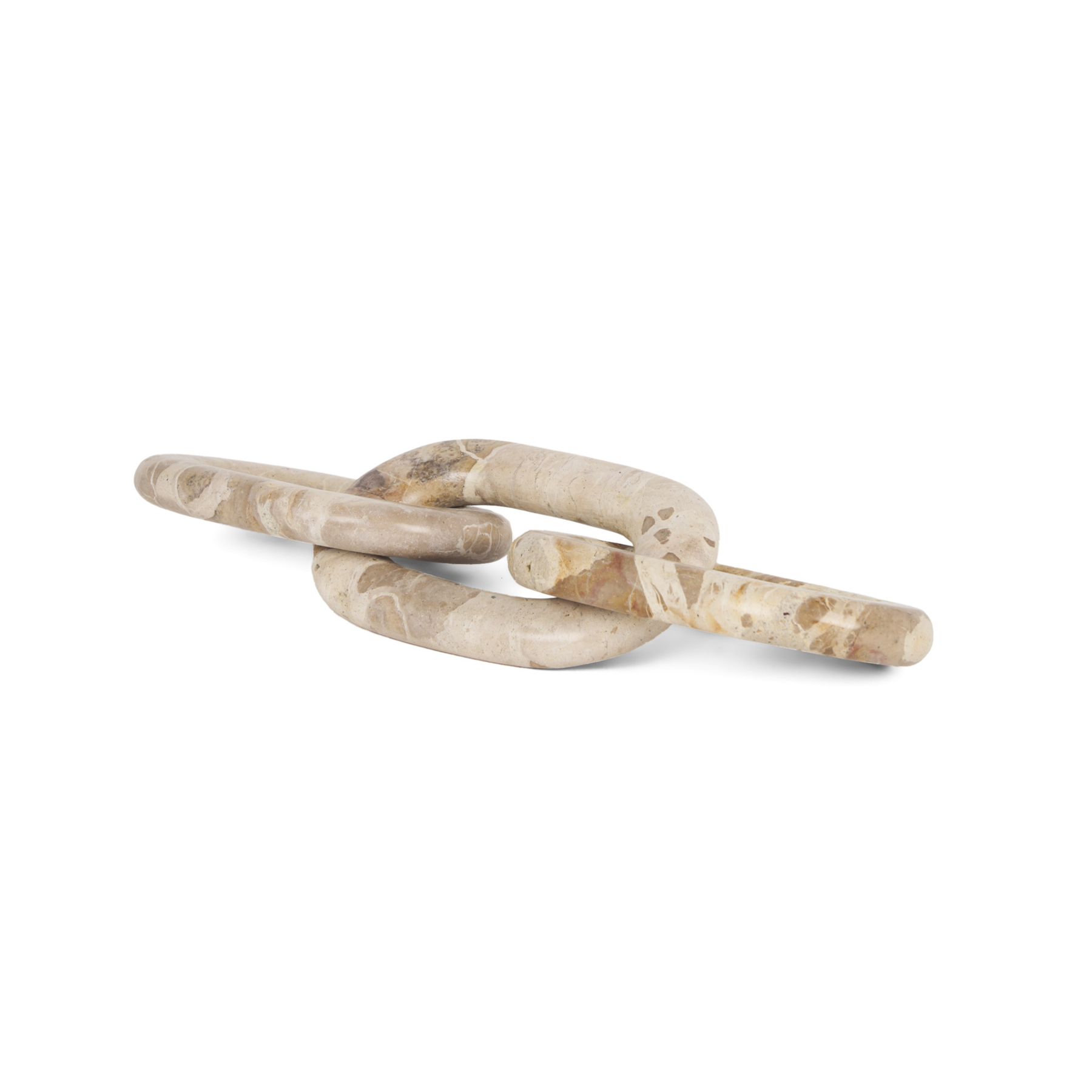 Brenda, is a decorative chain link made of a solid, unique red-brown or Capri beige marble. This heavy, solid marble accessory will introduce a dynamic layer of visual intrigue to any curated surface.