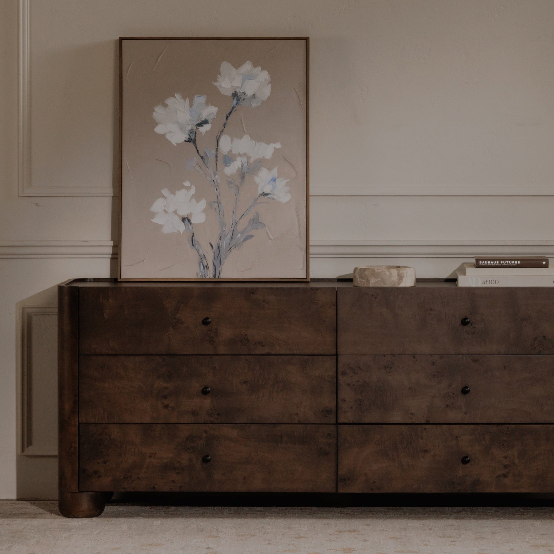 A compelling bloom unfolds in the Caspia framed painting. Thoughtful layers of acrylic paint reveal an abstract floral form punctuated by a striking blue stem. The minimal neutral background evokes organic charm, while a the warm toned frame promotes transitional style.