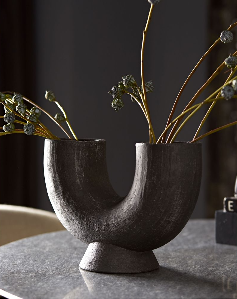 The Damien transforms terra cotta into sculptural art. A crescent structure takes shape with a textured matte charcoal finish adding depth to its tubular form. A circular platform allows this piece to showcase like fine art and its watertight capabilities allow it to function as a novel vase. The finish will vary.