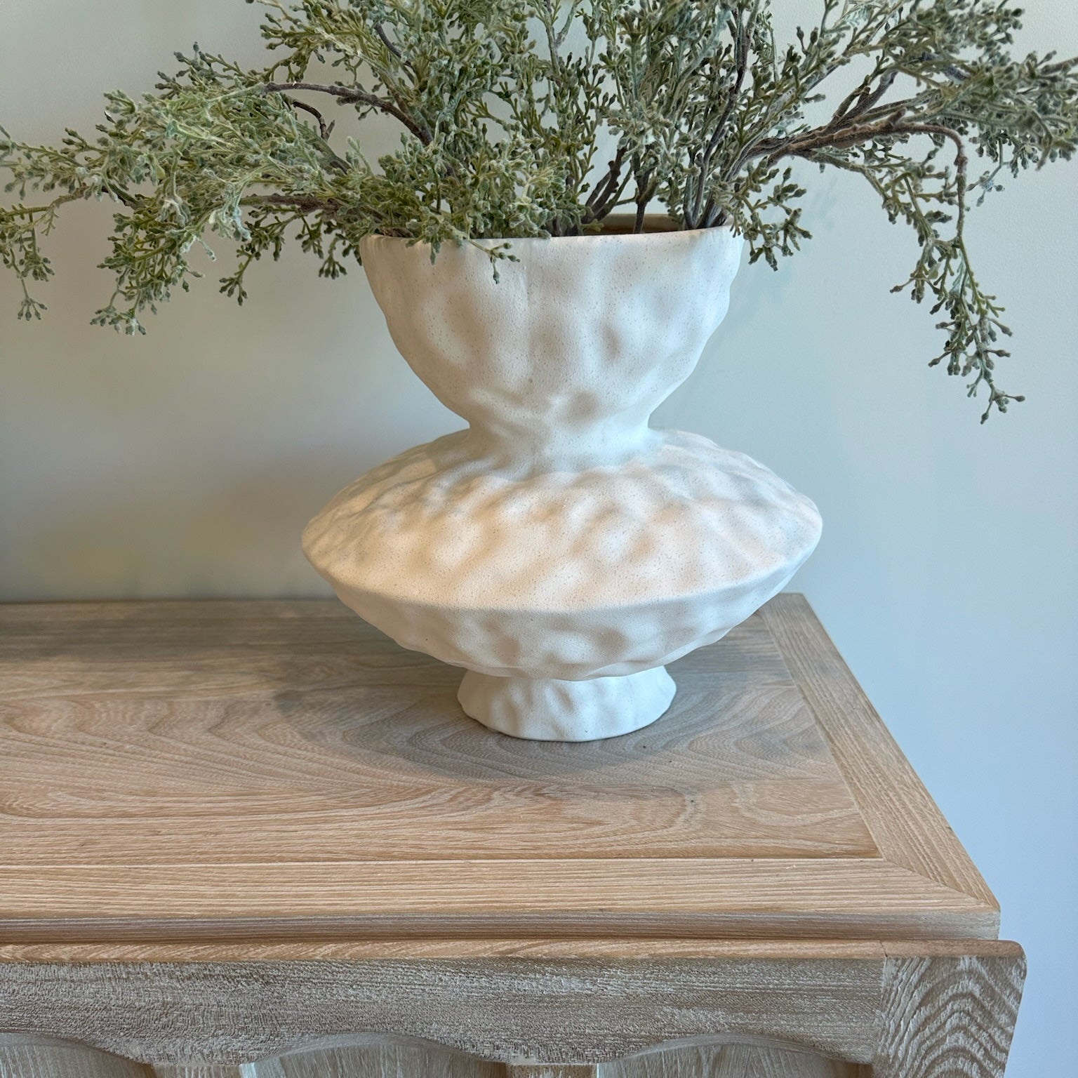 Crafted with meticulous attention to detail, the vases' organic ceramic forms mimic the gentle curves and lines found in nature, evoking a sense of tranquility and serenity. The soft and matte finish of the plaster-like finish enhances its organic appeal, making the vases unique and stunning centerpiece that effortlessly complements any interior design aesthetic.
