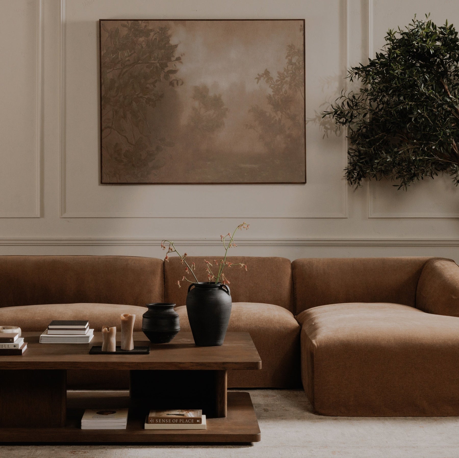 A depiction of moody tranquility, this large-scale Fawn framed painting is a sepia toned interplay of grand and soft. Rendered in warm, aged brown tones, the shadowed forest landscape creates a soft, dreamlike impression.