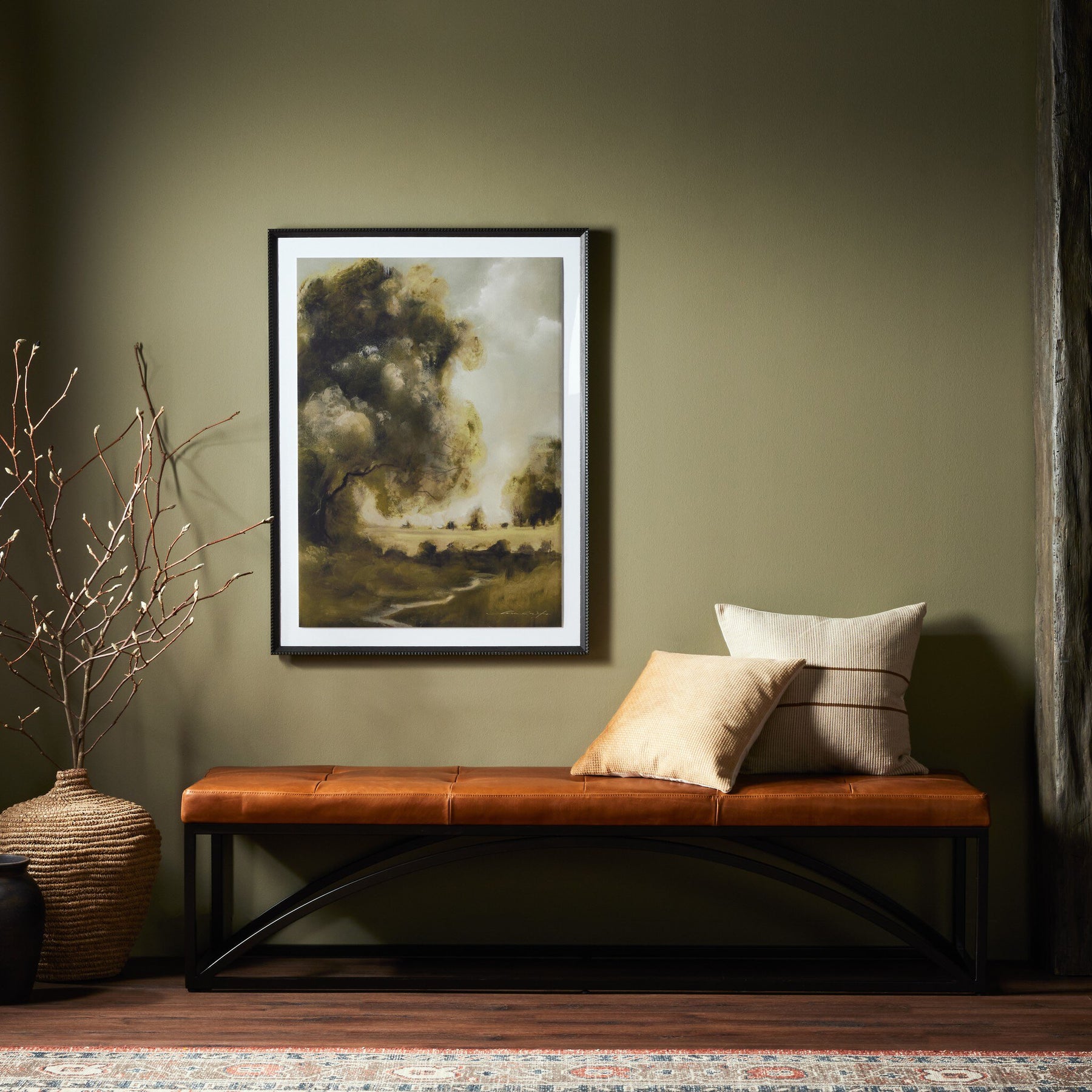 Alabama painter Hannah Winters finds inspiration in vintage landscapes, working with oil paint and an array of materials to texturize her ethereal pieces. Finished within a decorative Brimfield black frame of naturally distressed painted pine. Handmade in Austin, Texas.