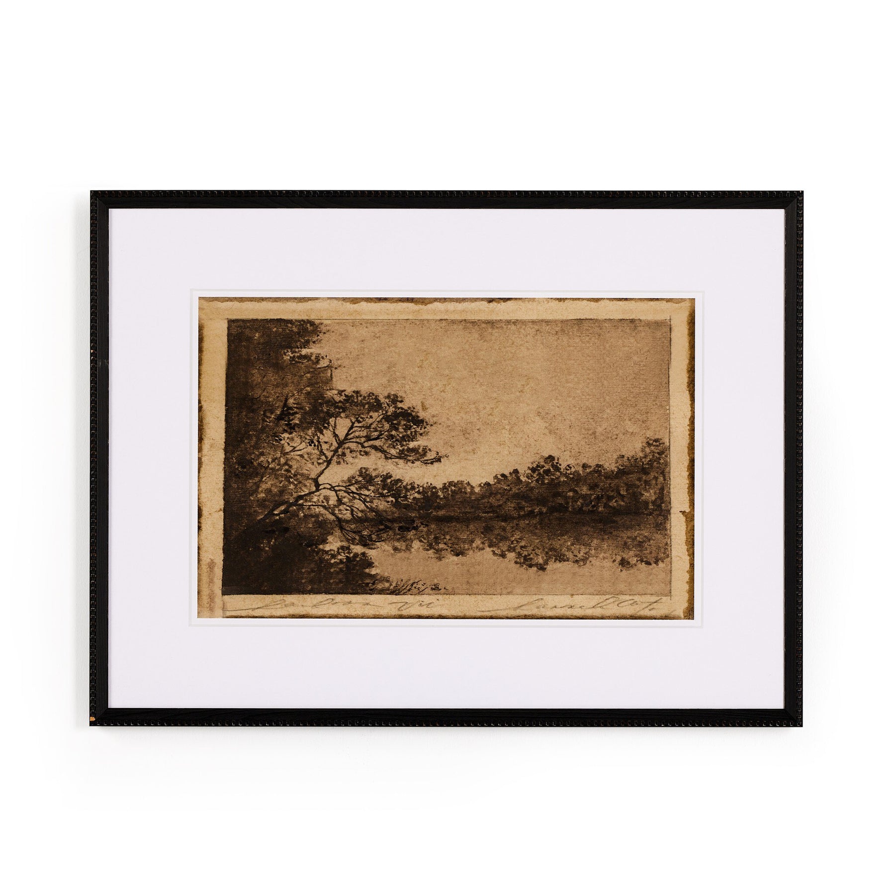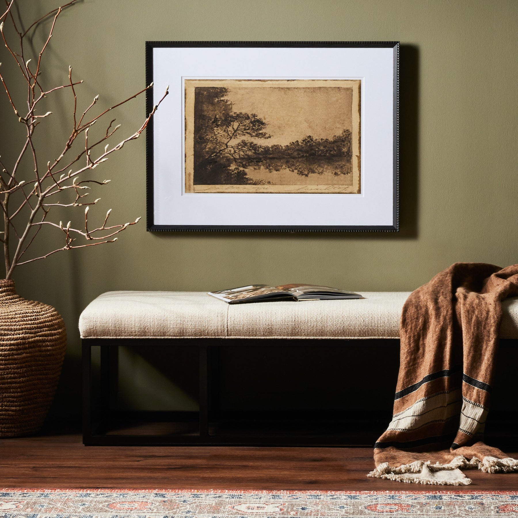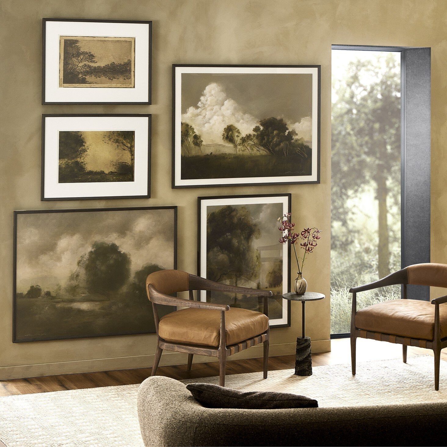 Alabama painter Hannah Winters finds inspiration in vintage landscapes, working with oil paint and an array of materials to texturize her ethereal pieces. Finished within a decorative Brimfield black frame of naturally distressed painted pine. Handmade in Austin, Texas.