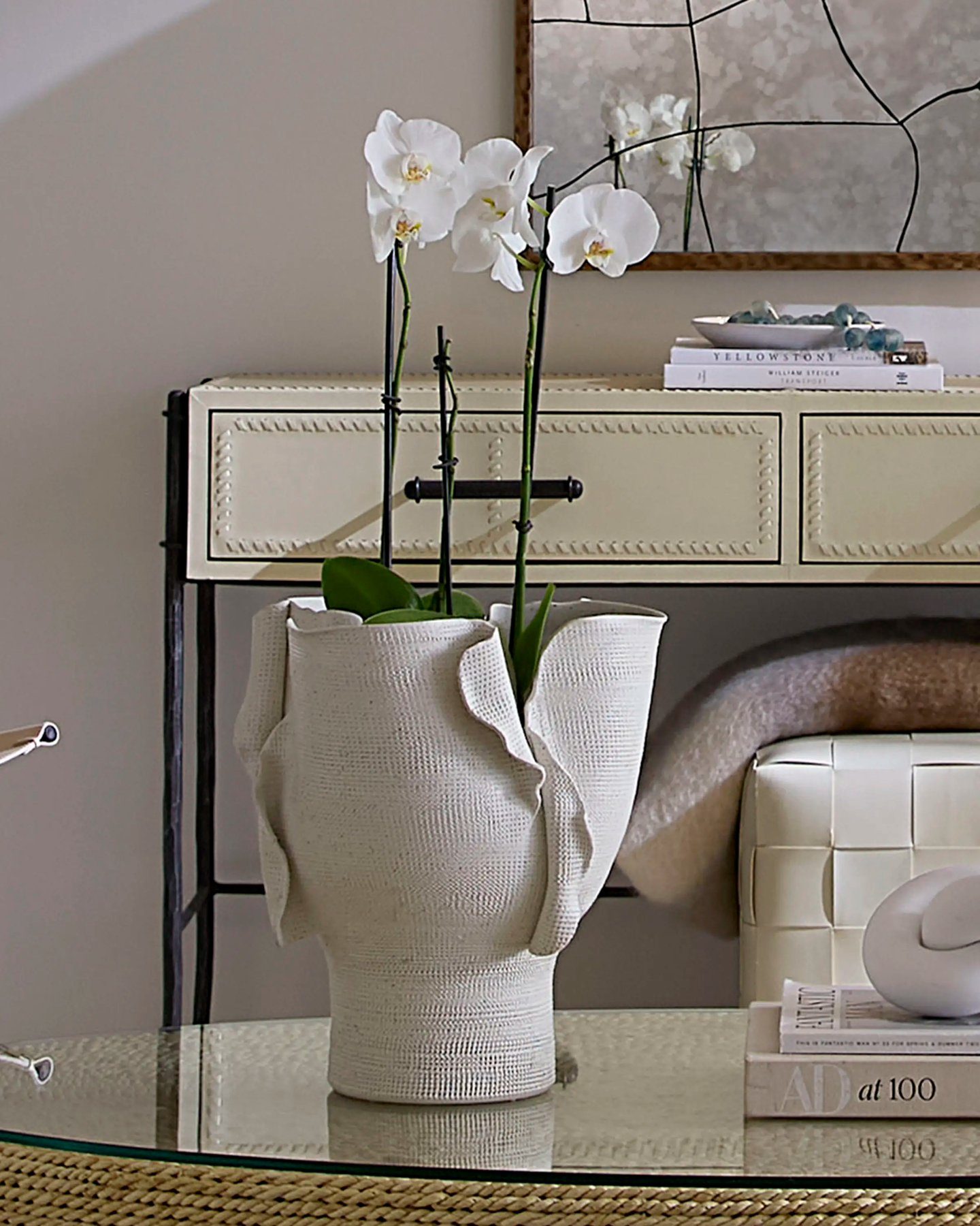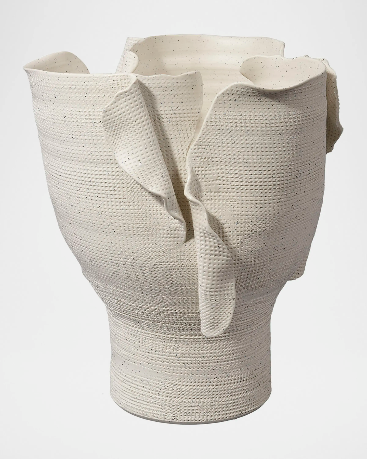 These porcelain vessels embody effortless chic. With their graceful, petal-like folds and hand-textured matte white finish, they make a striking addition to modern décor. Fill them with textured reeds or feathers, or group them with a selection of vessels in similar color tones for added impact.