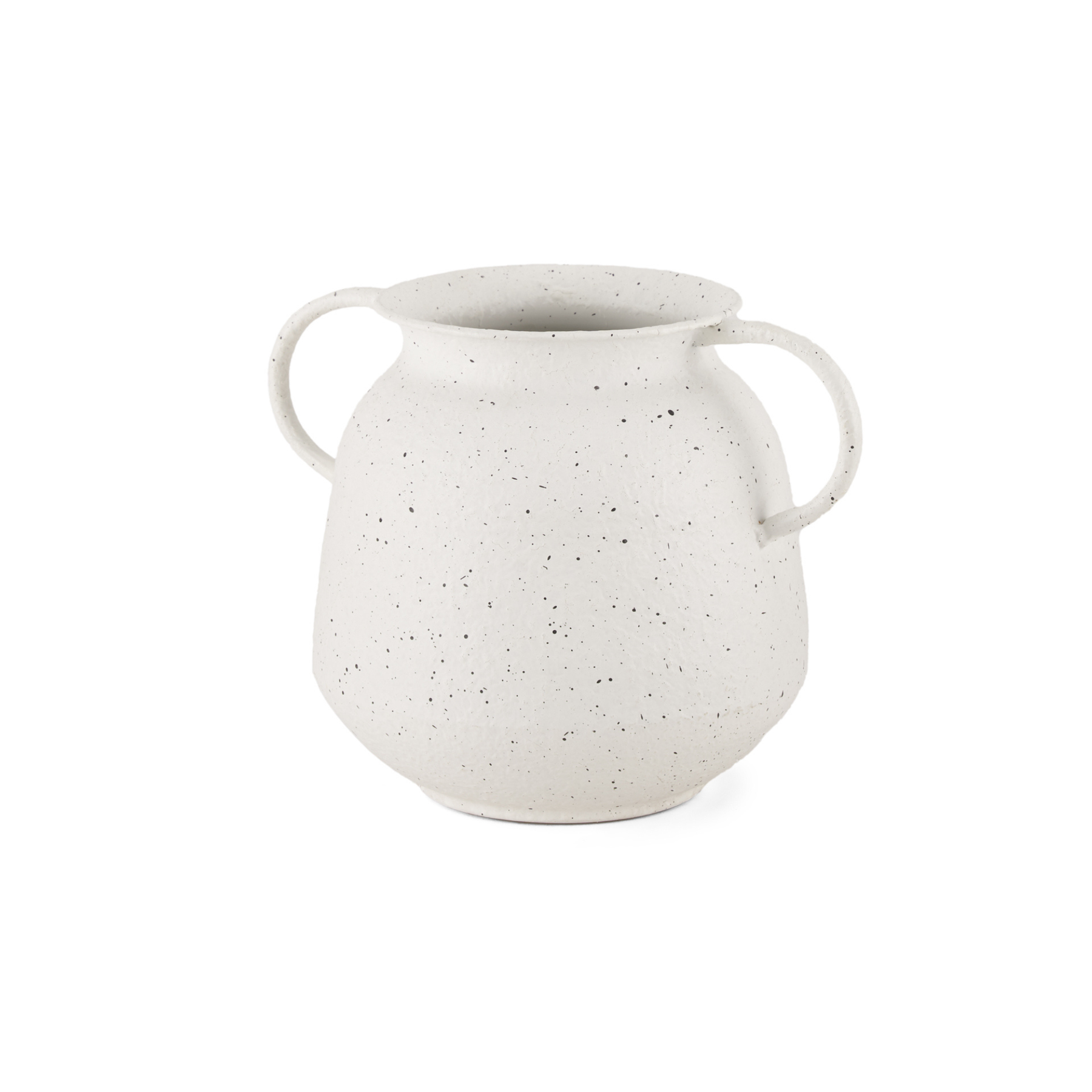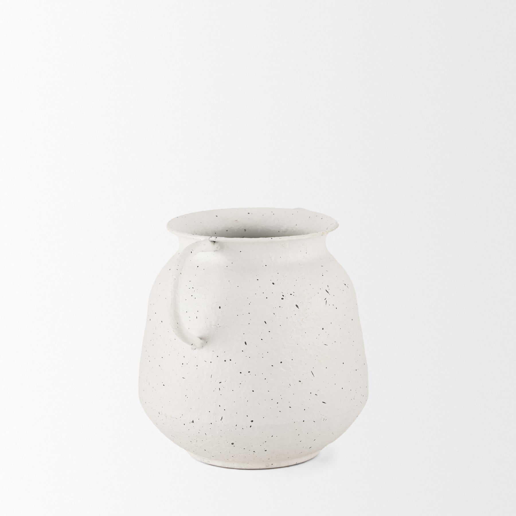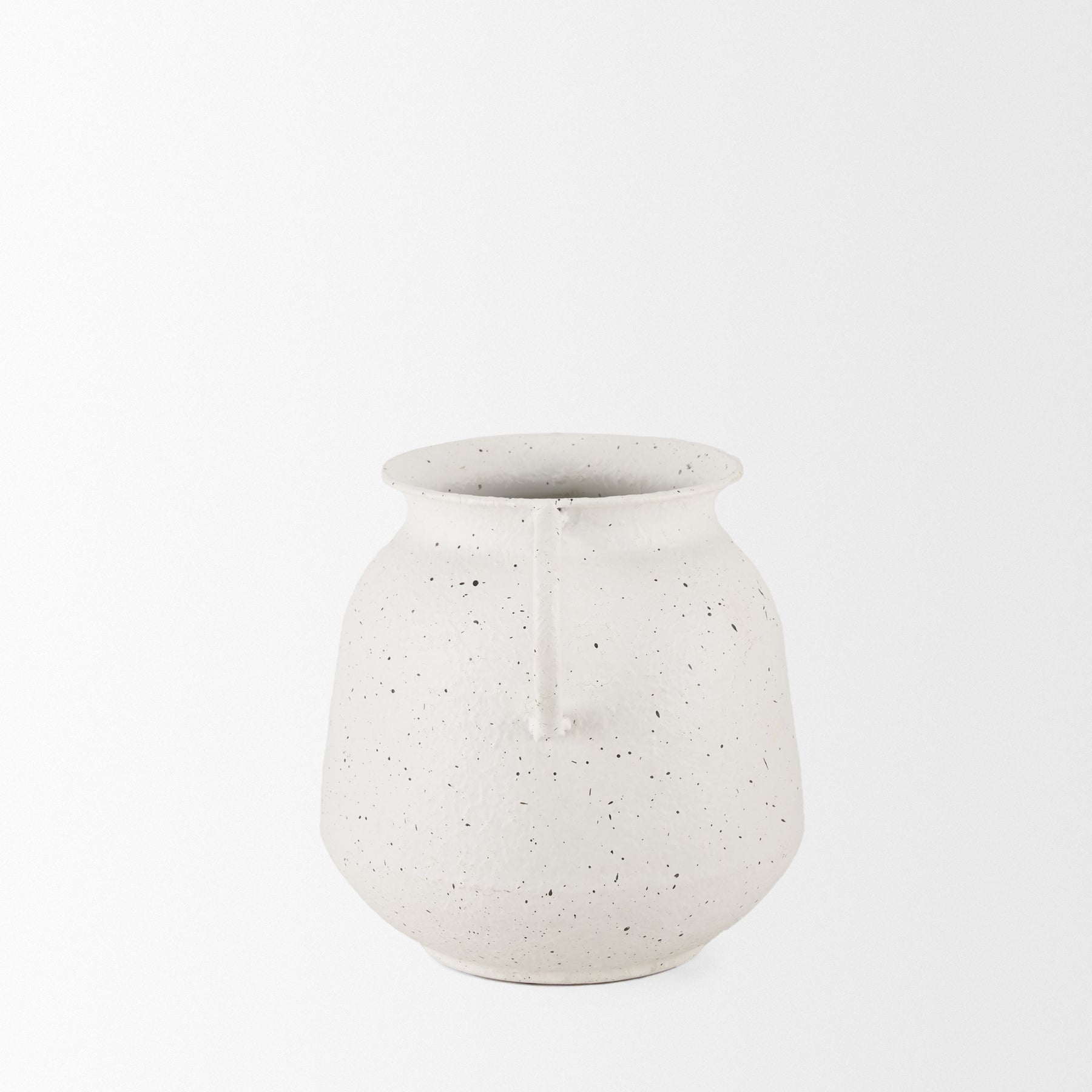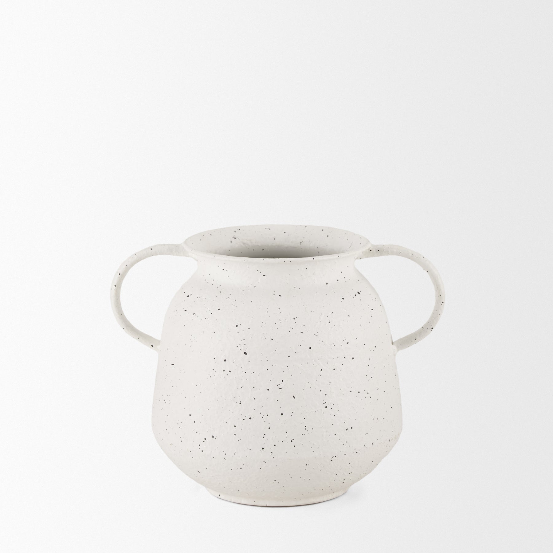 The Travis Vase is crafted from lightweight metal, featuring a charming white finish with black speckling. Its two handles and textured surface add a touch of rustic elegance. The vase's unique design makes it a versatile piece, perfect for any décor. Ideal for displaying alone or with artificial floral arrangements, it effortlessly enhances your space. Available in two sizes.