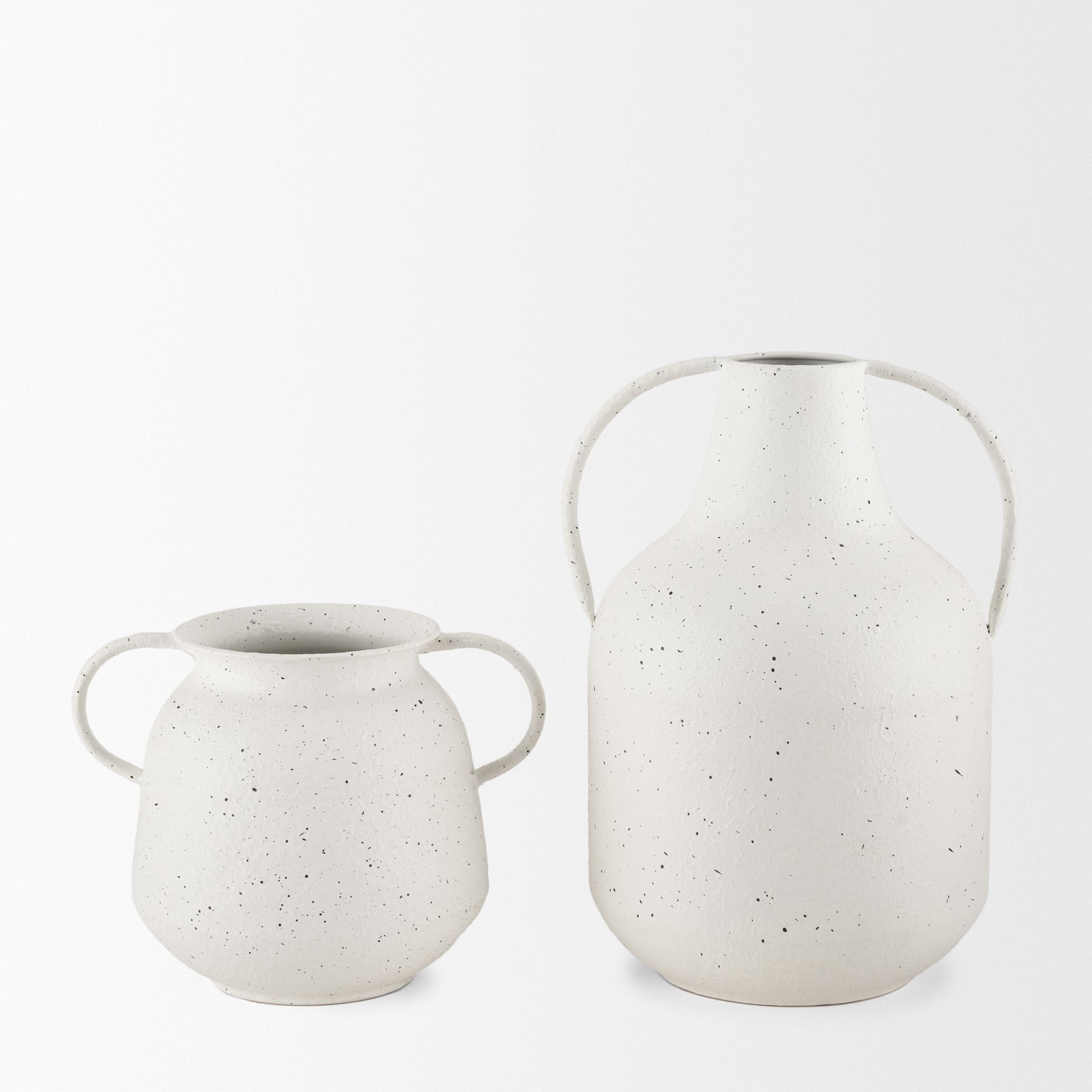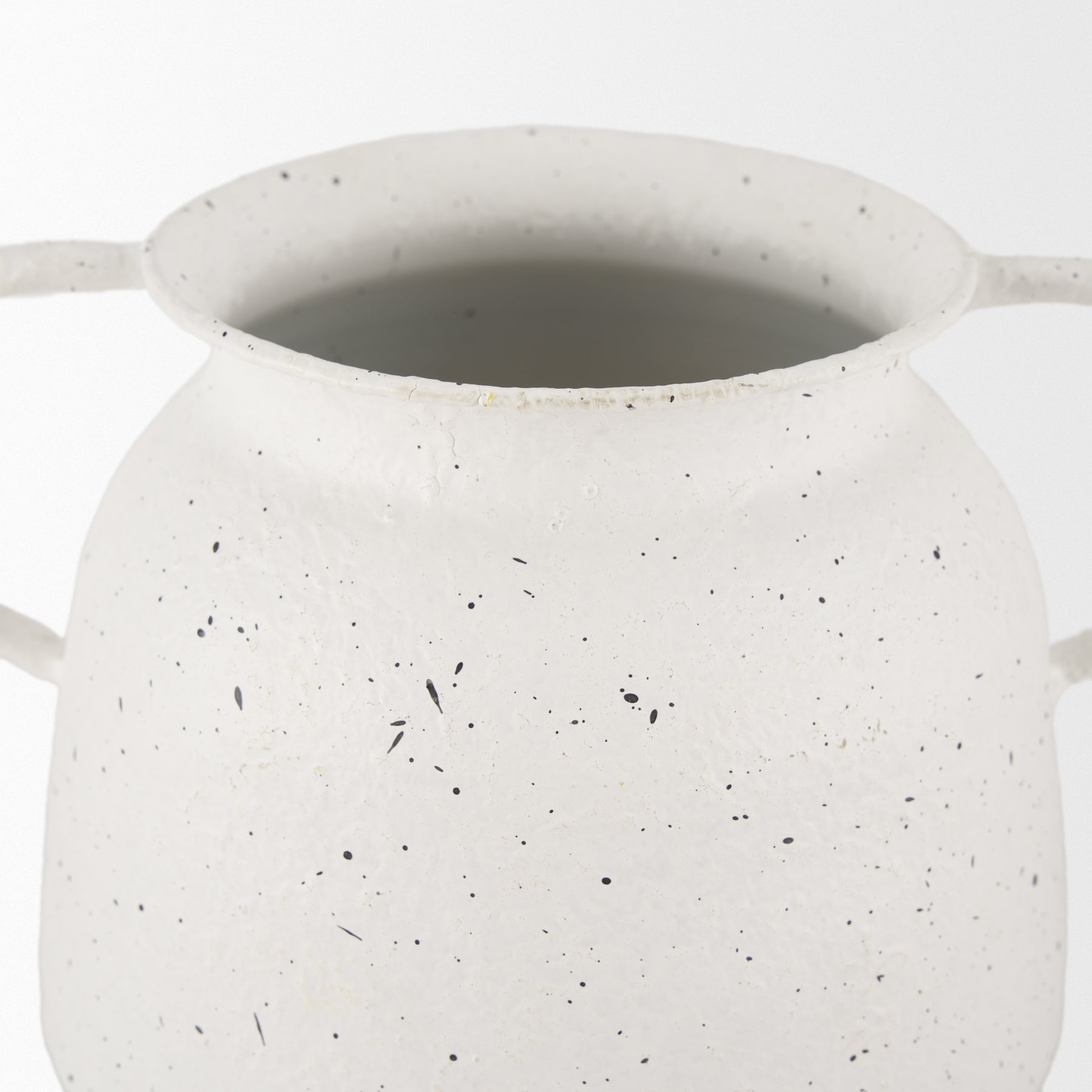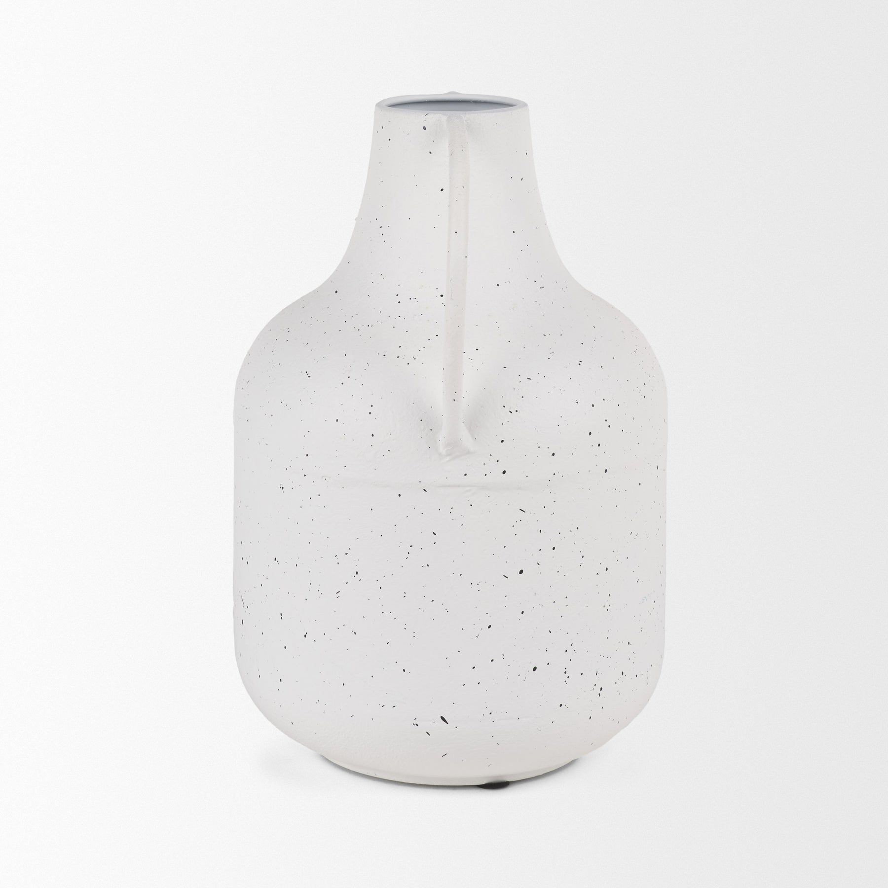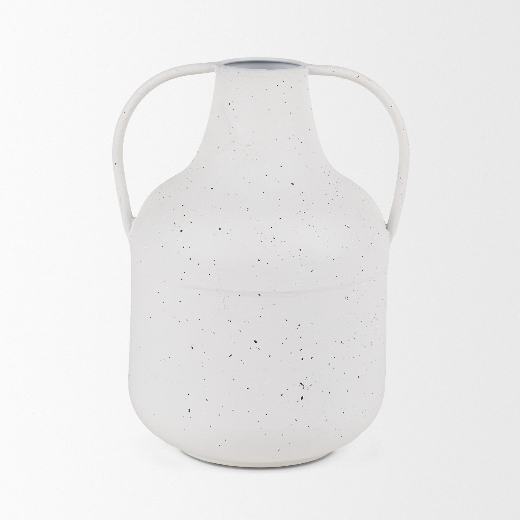 The Travis Vase is crafted from lightweight metal, featuring a charming white finish with black speckling. Its two handles and textured surface add a touch of rustic elegance. The vase's unique design makes it a versatile piece, perfect for any décor. Ideal for displaying alone or with artificial floral arrangements, it effortlessly enhances your space. Available in two sizes.