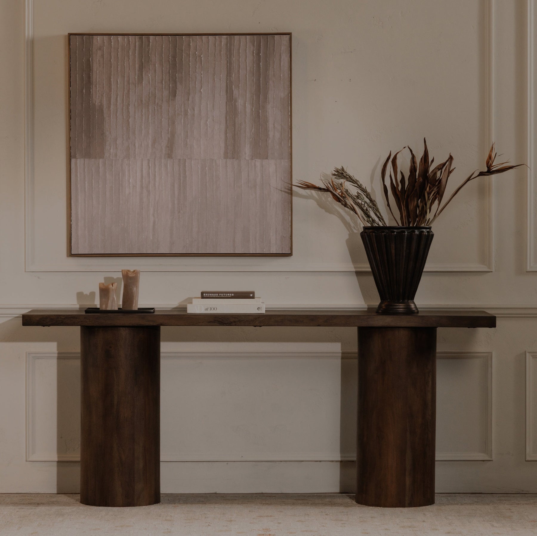 Delicate strips of torn paper are meticulously layered to create a mesmerizing depth of minimalist design in the Willet framed painting. Bathed in warm, neutral tones and arranged in alternating linear form, each piece is a unique expression of artistry. The solid pine frame complements the serene palette, enhancing its transitional appeal.
