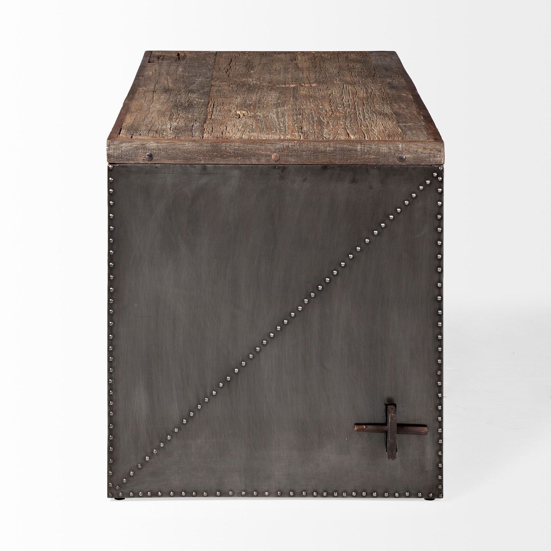 The Raymond Office Desk is a creativity-inducing office desk that sports a top crafted from reclaimed Indian wood rested on a metal cladded base. Finished in a rustic brown tone with a slightly rough texture, the solid wood top is large enough to host all your paperwork, a computer and peripherals all at once. The base comprises of a wide panel on either side that features brass cladding with a rivetted detail on them. To ensure unparalleled comfort as well as stability, the Raymond Office desk also has a foot-rest between the two side panels. With dark wooden tones that are complemented by the brass accents, the Raymond looks great in spaces based on the Industrial design style.