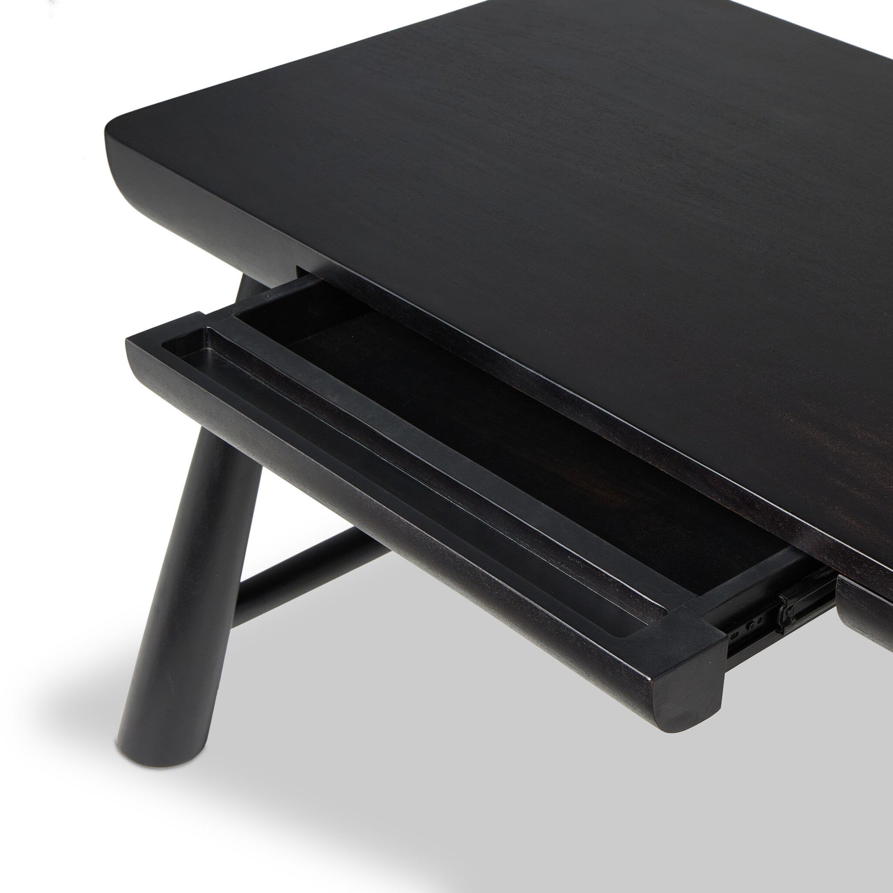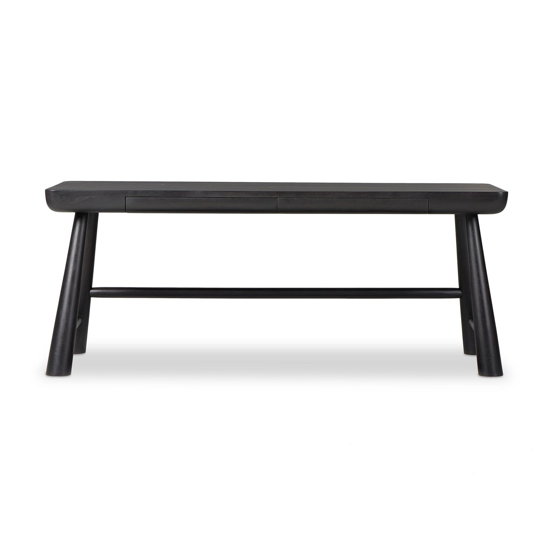 Wabi-Sabi inspired and designed with a clean, bold shape. This rustic desk features a modernized shape crafted from worn acacia or caramel-finished wood. Designed with cylindrical legs that are both angled and tapered for added movement. Built-in, hidden pencil drawers keep the focus on the natural graining and grooves of the wood used to craft this piece.