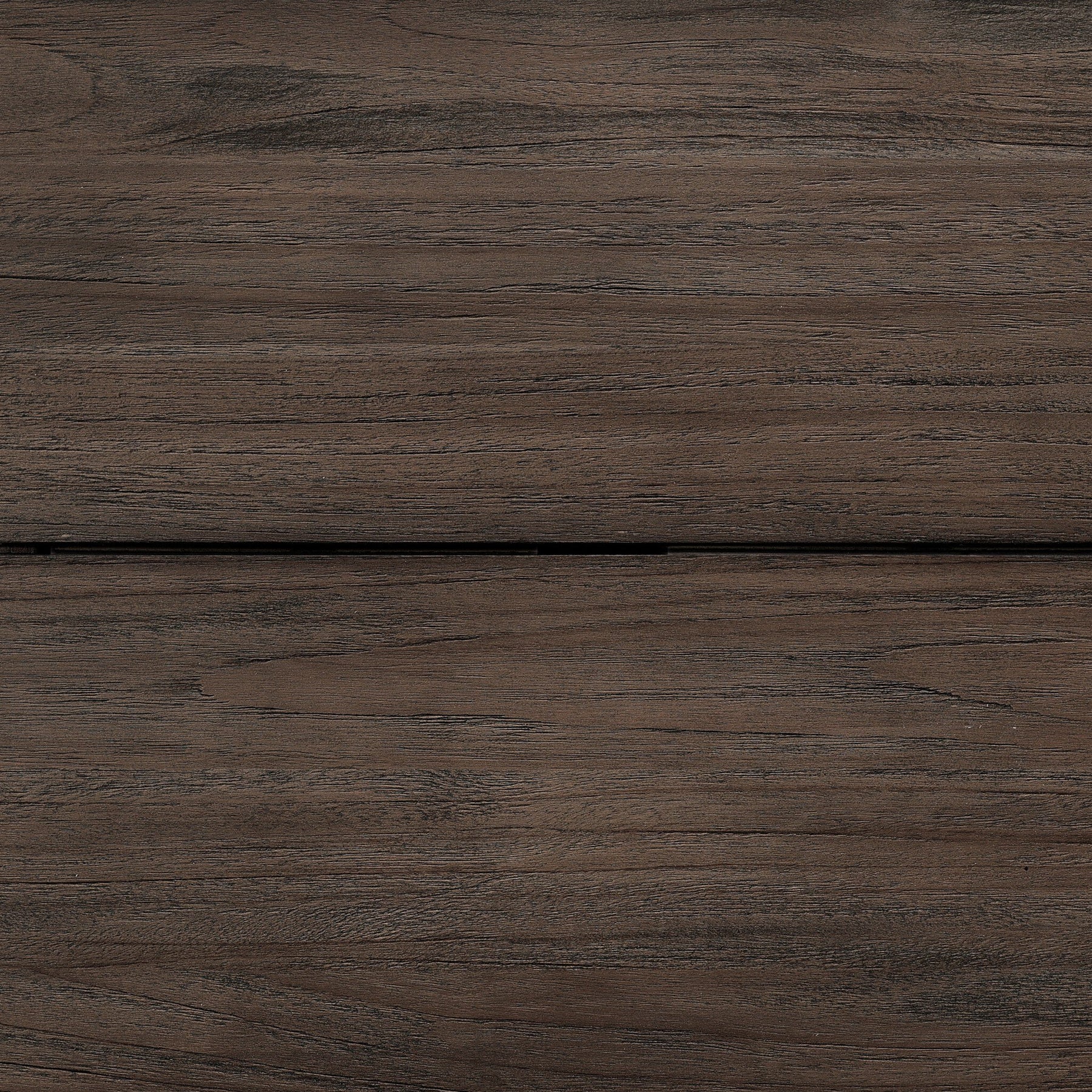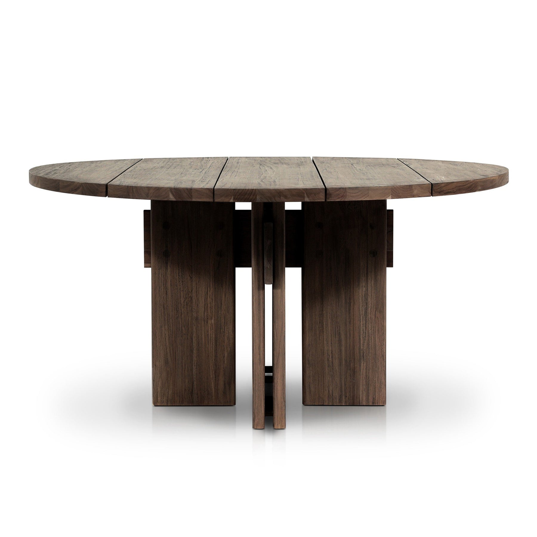 Solid FSC®-certified teak in a stained toasted brown finish with uniquely linear joint and connection details, complemented by cross stretchers running through the center of this outdoor dining table. Cover or store inside during inclement weather and when not in use.