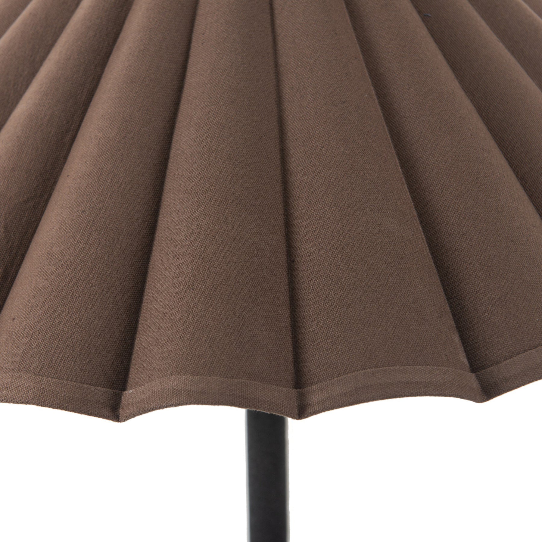 Textures and deep hues unite for this floor lamp's beautiful glow. The scalloped shade features a dark or creamy white canvas exterior covering an antiqued brass interior, and wrought iron pull chains adjust each lightbulb in Baroque-era form.