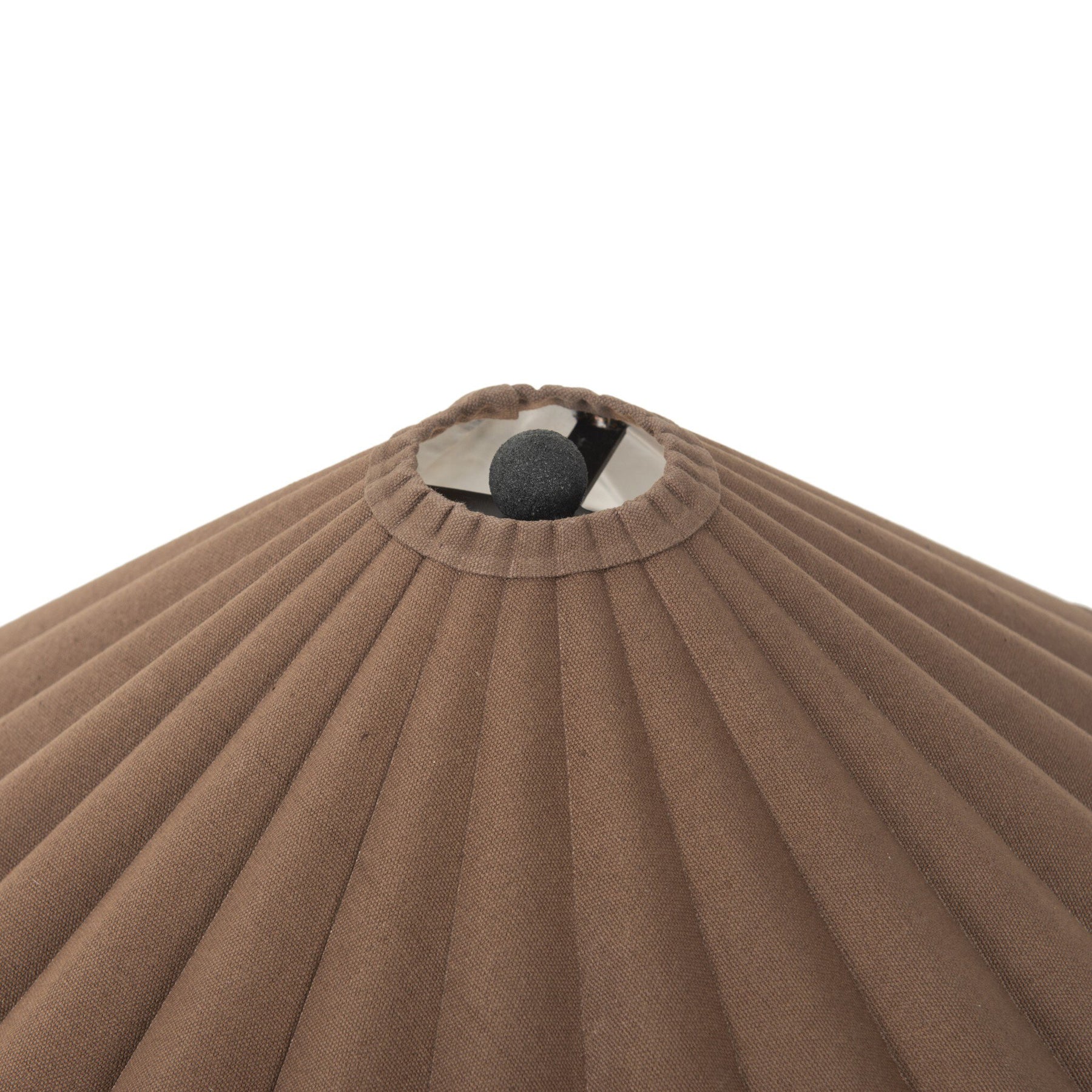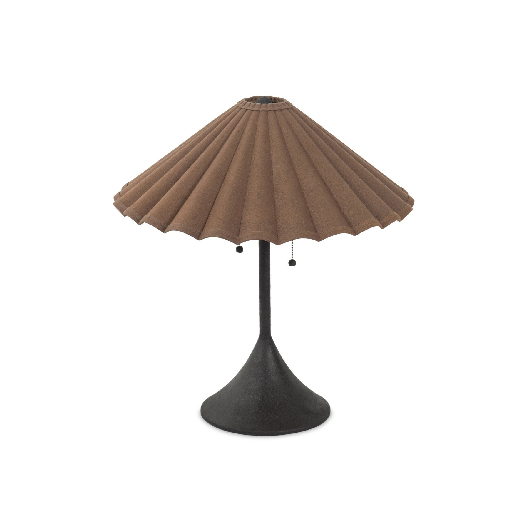 Textures and contrasting hues unite for this table lamp's beautiful glow. The overscale scalloped shade features a creamy white or dark canvas exterior covering an antiqued brass interior, and wrought iron pull chains adjust each lightbulb in Baroque-era form.